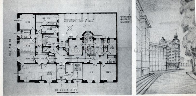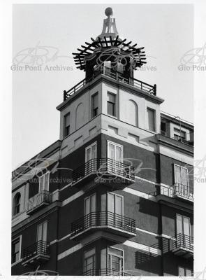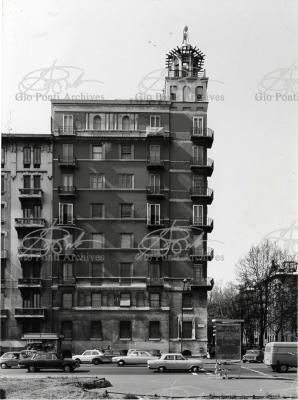 E' la prima casa pontiana con facciata coloratissima. Così saranno, negli anni Trenta, le facciate delle milanesi case tipiche, 1931-33, e casa Marmont, 1931. In queste facciate il colore (rosso, ocra, verde, giallo) è sempre in gioco col bianco. Qui, l'intonaco è rosso, con fasce orizzontali bianche. Bianco e rosso il gazebo alla sommità. In travertino lo zoccolo dell'edificio. Il progetto è di Gio Ponti ed Emilio Lancia.