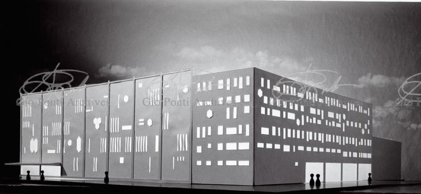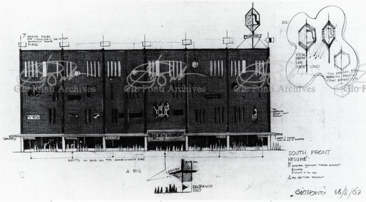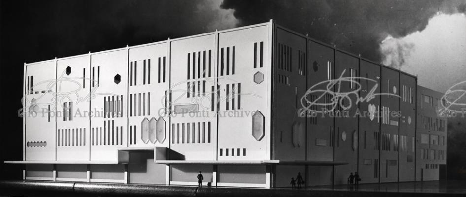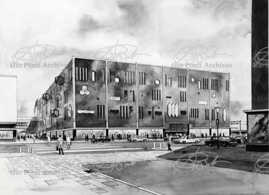 Di questo grande magazzino Ponti ha progettato la facciata. Il grande magazzino esige, per il proprio funzionamento interno, muri perimetrali chiusi: allora la facciata servirà al suo funzionamento esterno, dice Ponti, cioè al rapporto visivo dell'edificio con la città e con i cittadini-passanti.