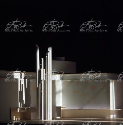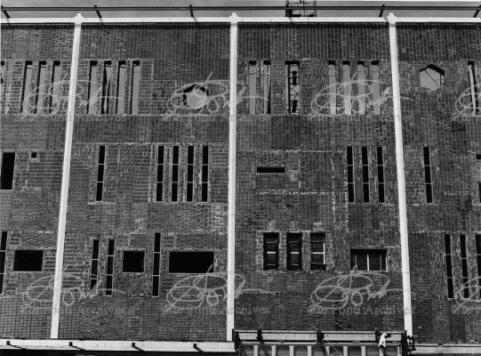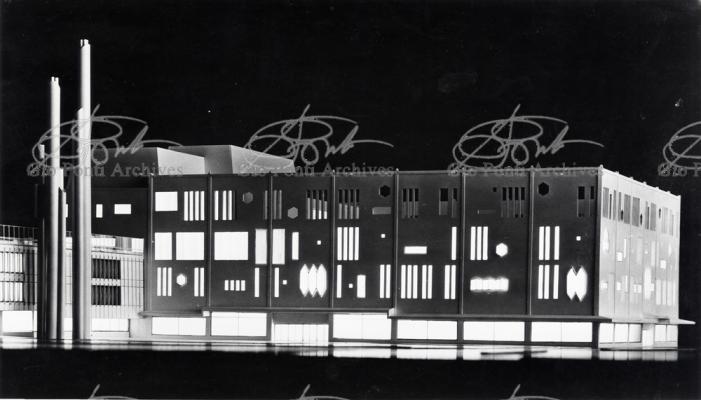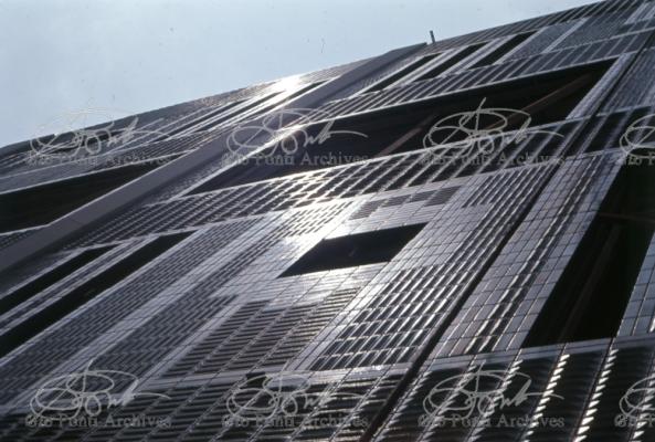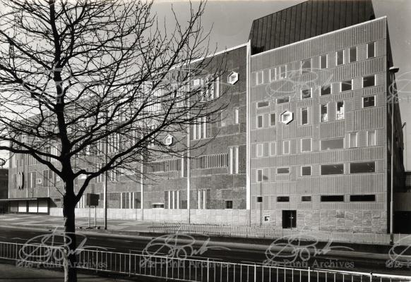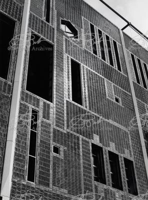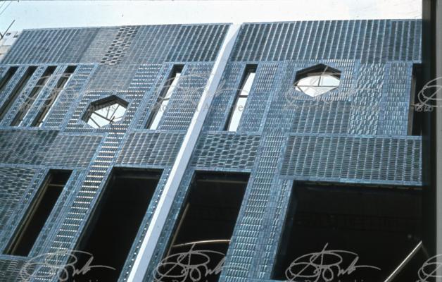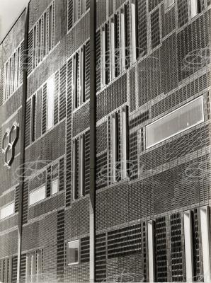 Qui la facciata, dichiaratamente un involucro, è un lungo nastro splendente (in ceramica verde a diamante della Saccer di Castellamonte), ritmato in battute misurate (con questo ritmo potrebbe continuare all'infinito) e bucato da aperture che non sono finestre ma disegni luminosi per il desiderato spettacolo notturno. E a questa facciata i cittadini di Eindhoven diedero subito un nome, ponscaart, scheda perforata.