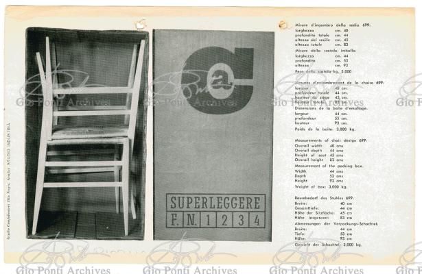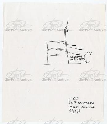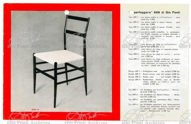 Nel 1949 compare la prima sedia a schienale piegato e supporti appuntiti. Nel 1952, disegnata per Cassina, compare la popolarissima Leggera, sedia in frassino, fortissima e sottile: se andate dai Cassina vi daranno spettacoli emozionanti di lanci di queste sedie, che ricadono dopo voli vertiginosi, in alto e in lungo, rimbalzando e non rompendosi mai.. Infine, nel '57, la Superleggera, che si può sollevare con un dito: i suoi montanti hanno sezione triangolare. Oltre venti, gli altri progetti di sedili pensati da Ponti per Cassina, negli anni.