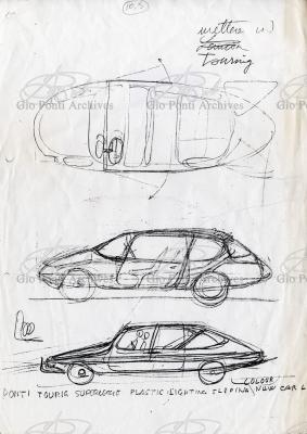 A «form for the automobile designed by Gio Ponti in 1952 for an Alfa Romeo chassis. At the time, Carrozzeria Touring did not dare to put this design for a car body into production. Twenty years later, many cars had caught up with it.