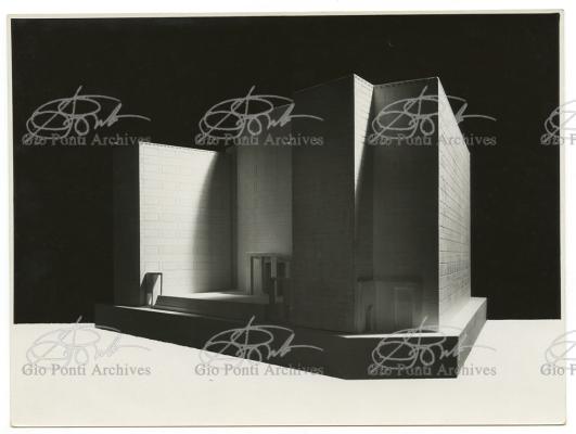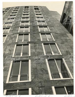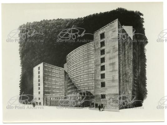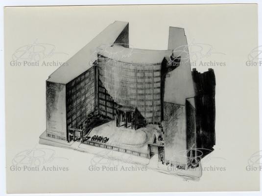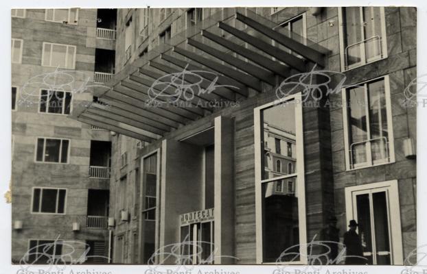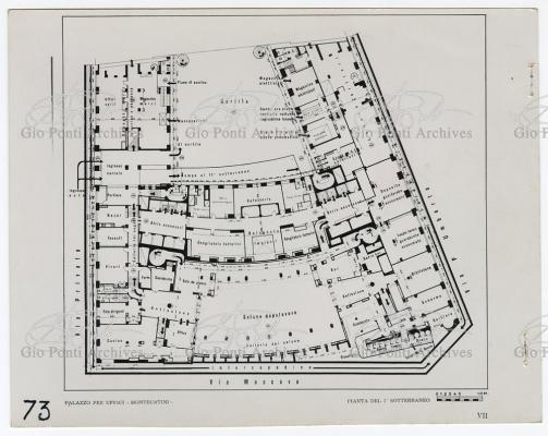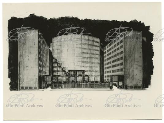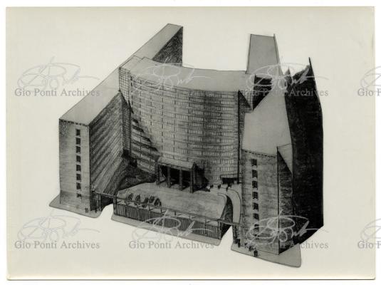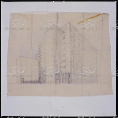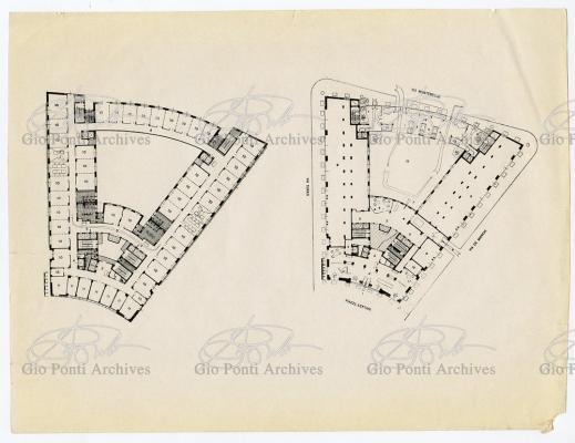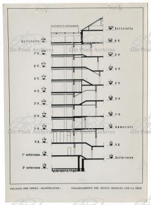 The history of modern architecture owes a particular debt to the captains of industry (Pagano's first comment about this work, 1939) Industry is expressed by the building itself: unitary in its module, advanced in its building techniques, pioneering in its installations. The H-shaped plan, suggested by the difficult site, expresses the functioning of the building: the managers offices in the high central block are connected to the employees offices in the two side blocks, a representation of hierarchy which would not be found in the Pirelli building, and are served by the car-park in the open court at the front. The module on which the building is based (axes of 4,20 m) derives from the uniform size of the steel desks. This permits the use of movable partitions. The module is revealed to the observer by the pattern of windows on the facades. For the young Ponti the first Montecatini Building was a special opportunity, one that put his brain and his studio reinforced by two engineers to the test in a case of total design at a high technical level and on a large scale. The intense and stormy collaboration between the architect and the client (Guido Donegani, founder and president of the Montecatini company) raised the sights of both, and the building turned out not only to be efficient but also to have an image that achieved immediate popularity. The Montecatini image is not created by the solemn front set back, on a minor road but by the long sidewall on the main street. Perfectly level, with frames and windows set flush with the surface, this impenetrable wall appears without thickness (and already, in the Pontian manner, a sheet reflecting the sky), and the repetition in the openings seems, significantly, to be weightless.Aligned with the massive facade of the old Montecatini building, this airy wall (Malaparte and Savinio liked it) is an expression of the complete detachment of the two works of architecture. (It is a green and silver wall, made of marble and aluminium, Montecatini materials. About the marble Ponti said I have had the blocks crosscut, and I have invented a new kind of marble. He gave it the name Tempest.