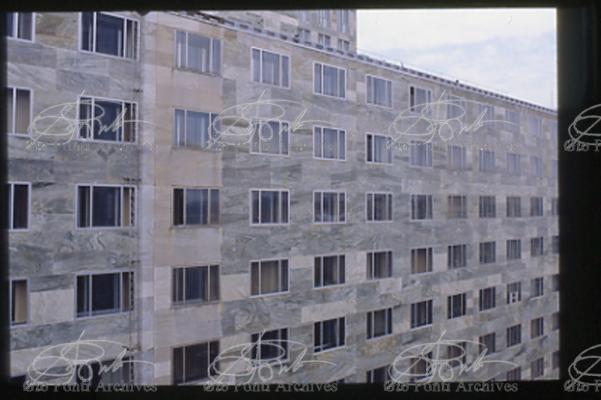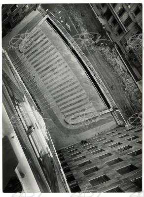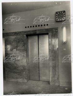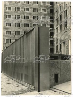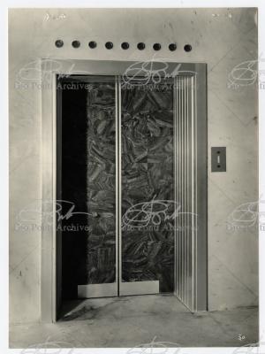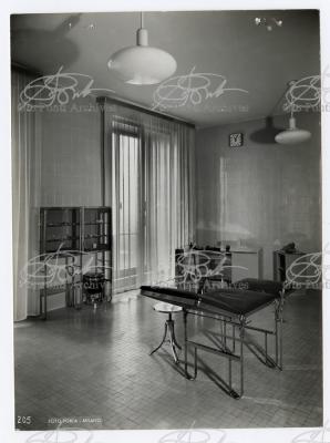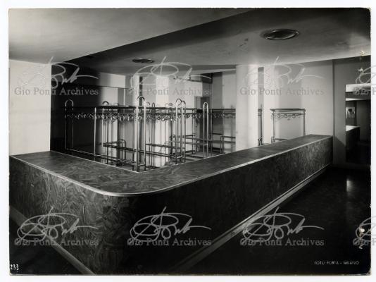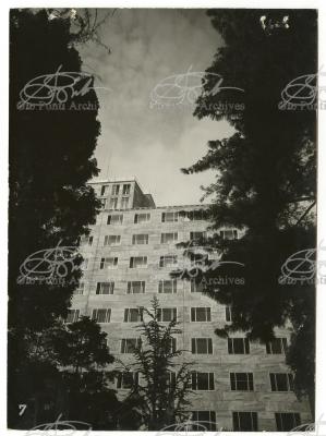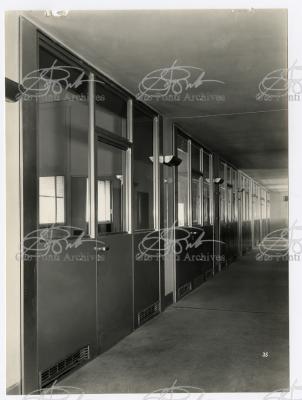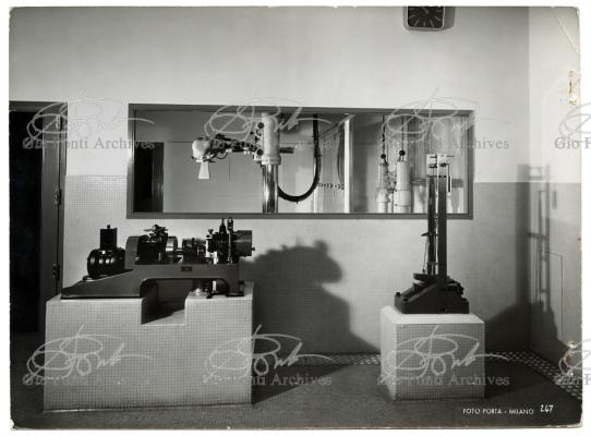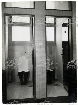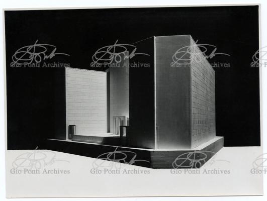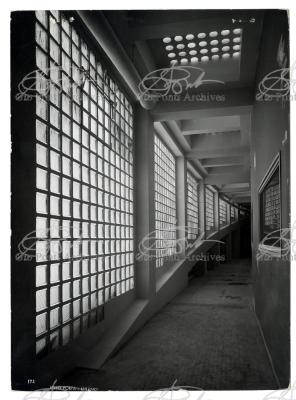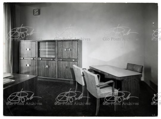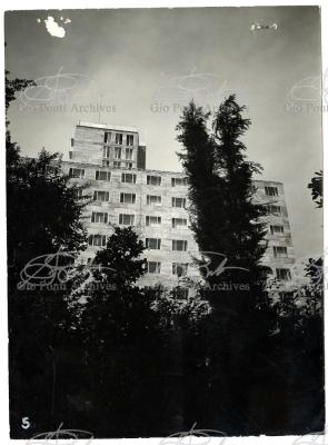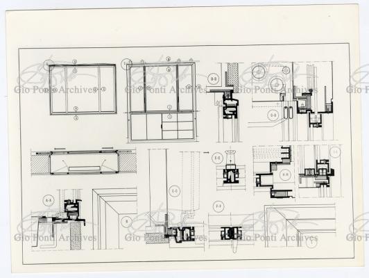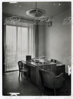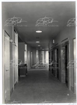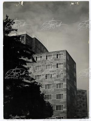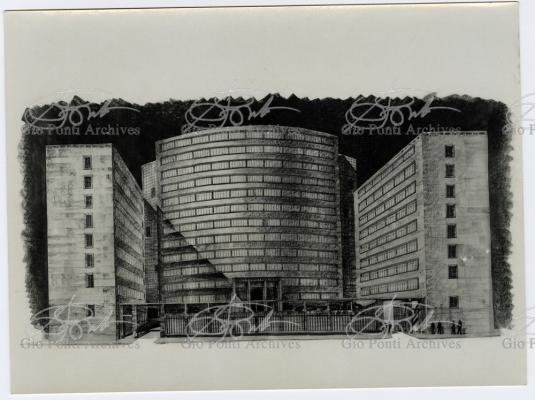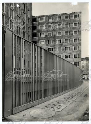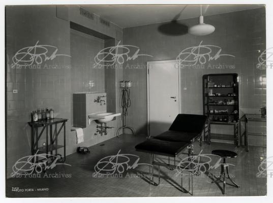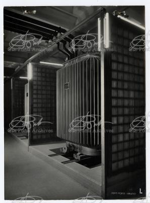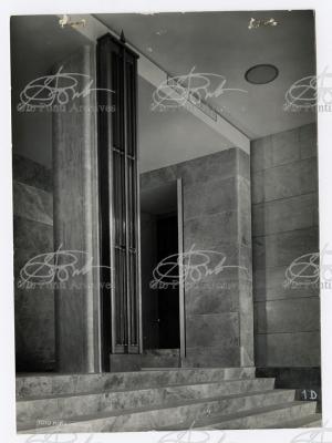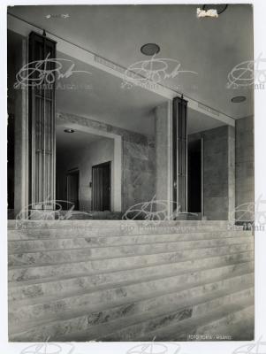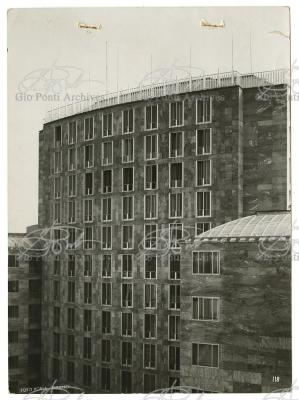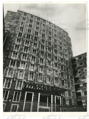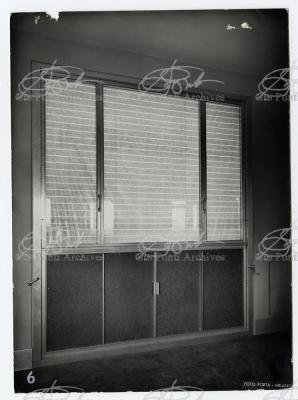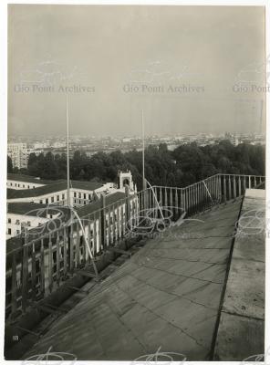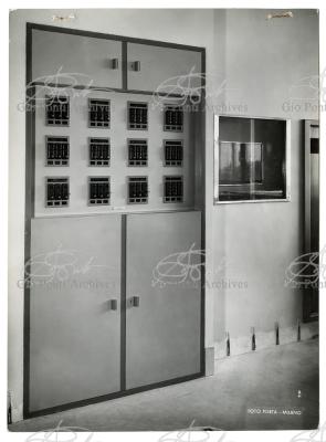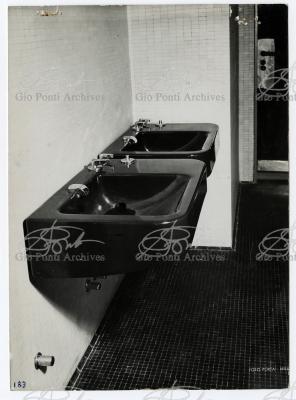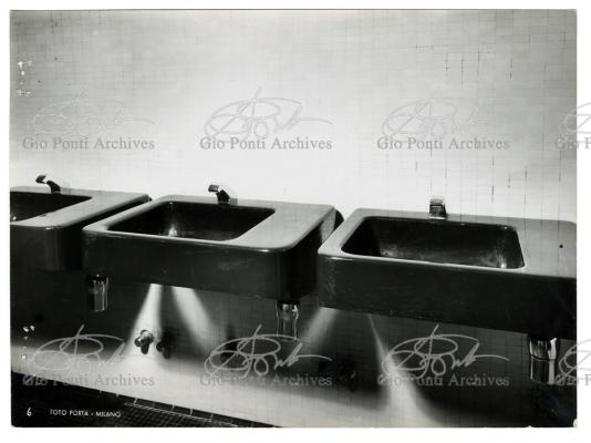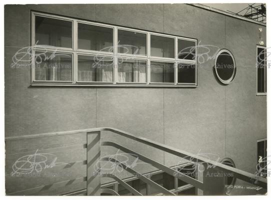 The first Montecatini building was described in full by Casabella (130 pages were devoted to it, in 1939). Record-breaking speed of construction: twenty-three months, from November 1936 to September 1938. Exemplary installations, from the air-conditioning rare in Italy in those days to the advanced elevator and telephone systems — and Ponti did not want to conceal the beautiful plants, but to make them visible and visitable. Experimental use of aluminium alloys (in the window frames and roofing) and of mosaic gres facings (on the facades around the court). Appliances and fittings all revised, with enthusiasm by the designers, or designed by them for the purpose (and destined later for mass production, such as the SVAO sanitary appliances, designed by Ponti). For Ponti, the encounter with Montecatini also meant the beginning of a study of prefabrication: see the Montecatini ready-made staircases (designed by Libera, Ponti, Soncini, and Vaccaro).