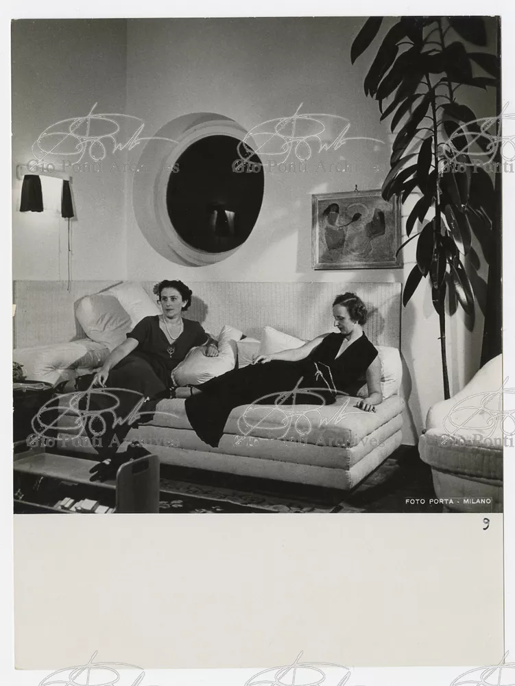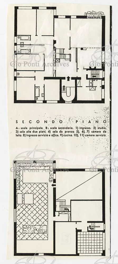 La più dimostrativa delle case di Gio Ponti in questi anni è quella da lui abitata, dal '36 al ‘43, la casa Laporte in via Brin 12. Io sono con Cocteau quando dice che il nuovo non è nella nuova forma per esprimere una cosa ma nel nuovo modo di pensarla. Qui, il nuovo modo di pensare la casa (e, nello stesso tempo, di conservare la casa, cioè il piacere di abitare la casa) si esprime anzitutto nel grande ambiente centrale alto due piani, su cui si affaccia il giardino d'inverno (gioco di visuali: vista dall'alto la figura umana trova inquadrature felici; si esprime nell'analogo grande terrazzo sul tetto, una sala col cielo per soffitto, chiusa fra muri, abitata per molte ore al giorno e per molti giorni (e vestiario, calzature, abitudini degli abitanti derivano dal lungo soggiornare in questo patio, in sandali e costume); si esprime nell'idea della libreria in ogni stanza, libreria inclusa nella costruzione; e nell'uso dei bellissimi materiali poveri, linoleum, canapa, legno, vimini, faesite. Mediterraneo e Vienna. Ho imparato da Wlach. (È di Wlach, forse, l'idea del tavolo da pranzo bassissimo, circondato da poltroncine imbottite e non da rigide sedie...) L'appartamento abitato da Gio Ponti e dai suoi appartiene ad una villa a tre appartamenti. Verso strada la villa ha un fronte chiuso e piano (senza rilievi, col solo sbalzo di due pensiline lineari), verso giardino ha un fronte aperto e movimentato nei volumi, con pergole e terrazze.