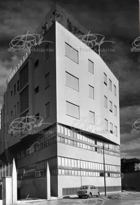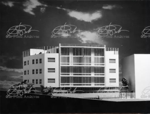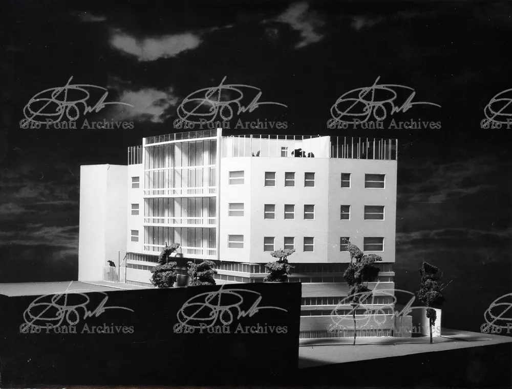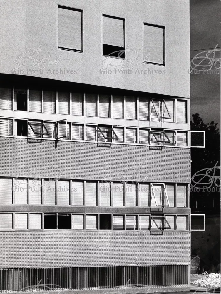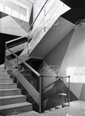 Gio Ponti: In questa casa ho giocato con volumi a diamante, come a me piace, con il contrasto dei volumi pieni, sporgenti, che poggiano sui vuoti delle finestre, e con i materiali che amo: l'alluminio argento e la ceramica a diamante, grigia, di bellissimo effetto.La scala: per cinque piani, un caleidoscopico gioco di colori, fra pareti e gradini.
