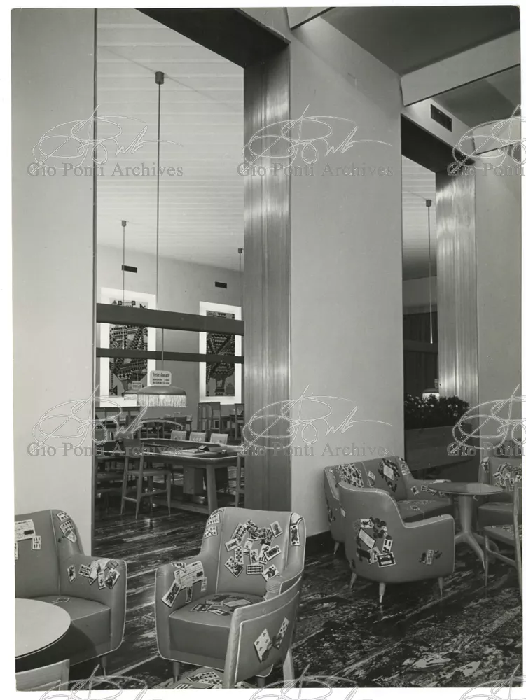 Il divertimento di Ponti con Fornasetti si sviluppa negli anni Cinquanta in molti modi. Dopo i primi interventi grafici in bianco e nero (pareti del negozio Dulciora, fronti dei trumeaux neoclassici pontiani, la decorazione di Fornasetti passa al colore. Fomasetti mitraglia d'immagini colorate tutte le superfici, dei mobili e degli ambienti di Ponti. Nelle sale del Casinò di San Remo stampa carte da gioco, piccole e giganti, su poltrone, divani, tende, pareti, soffitti. Negli uffici Vembi-Burroughs a Torino e a Genova stampa penne, matite, fogli, calcolatori, su sedie, poltrone e divani. Ma questi arredi di Ponti sono interessanti anche perché Ponti lancia l'eleganza dei materiali nuovi: alluminio anodizzato, vipla, flexan e gomma - gomma Pirelli: fantastico P. per i pavimenti, che appaiono non disegnati ma gettati.