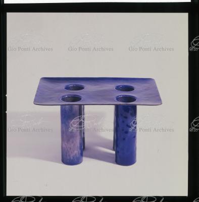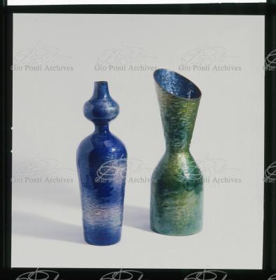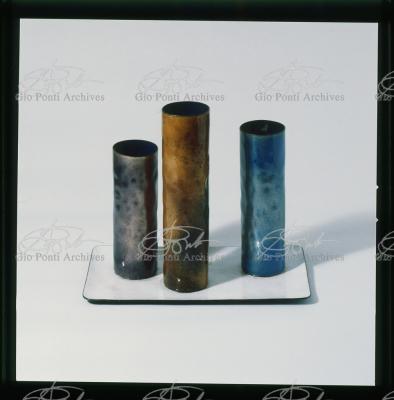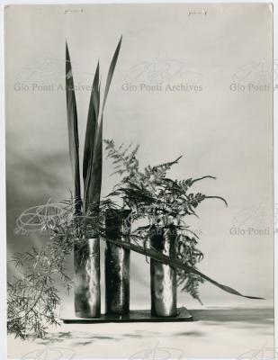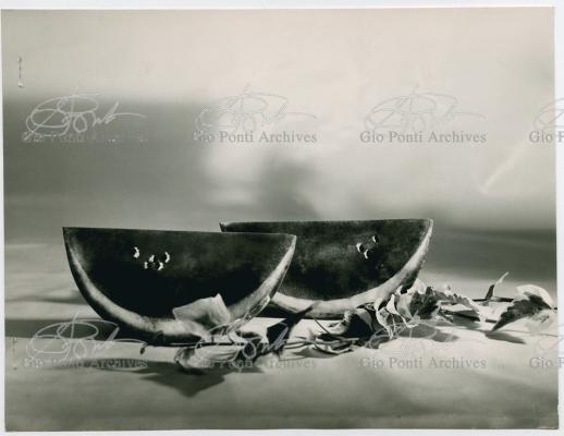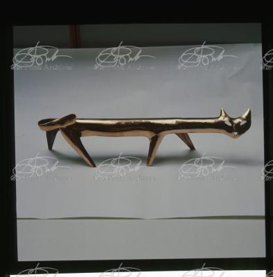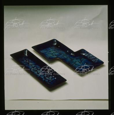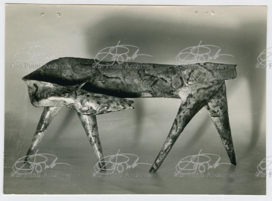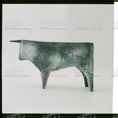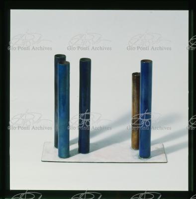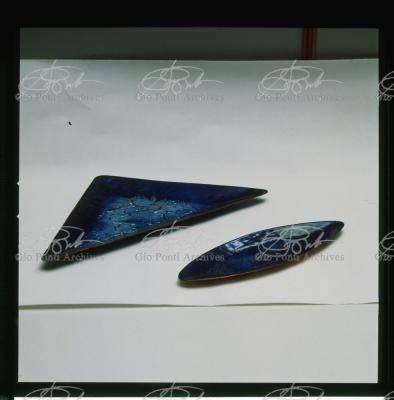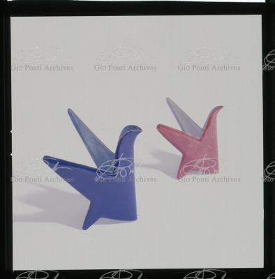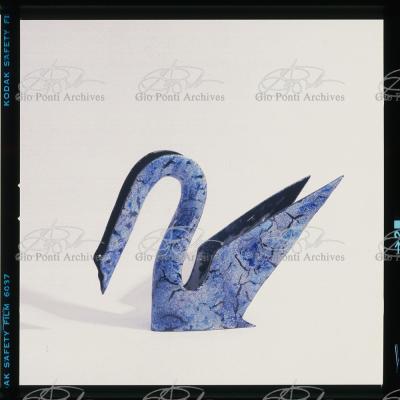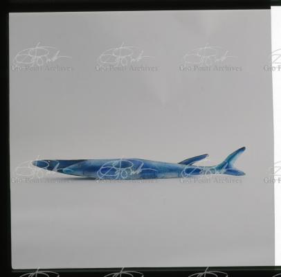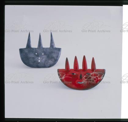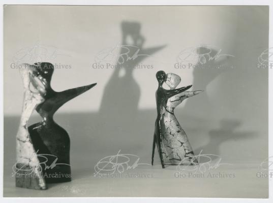 Sono un'invenzione, queste figure di animali -gatti, pesci, cavalli- e anche cocomeri e diavoli -ritagliate e piegate, come si fa con la carta. Figure piane che stanno in piedi da sole. Sono un modo pontiano di usare sempre e solo il disegno, di disegnare con le forbici. Ci pensava poi Paolo De Poli, maestro dello smalto su rame, a far di ciò degli oggetti. Con Divertimento e con Bravura.