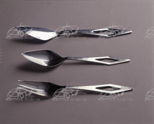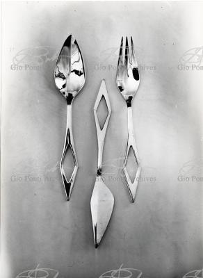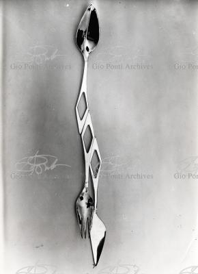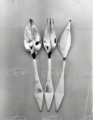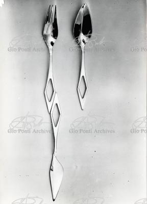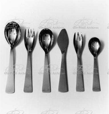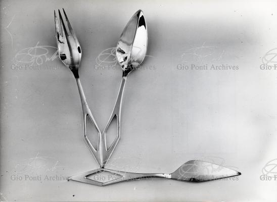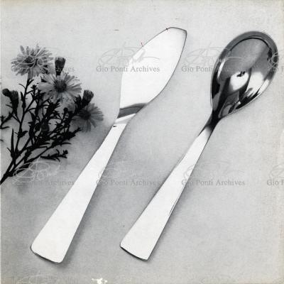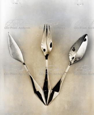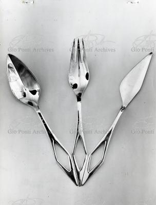 Il nuovo modo di pensare questi arnesi, le posate, anzi, la loro forma perfetta (adottata entro vent'anni da tutti), è questa, dice Ponti: coltello a lama corta con profilo obliquo (per tagliare noi usiamo solo la punta della lama, inclinata sul piatto), forchetta a denti corti e un po' concava (per raccogliere il boccone noi usiamo solo la punta dei denti, e nella concavità raccoglieremo anche il sugo.)