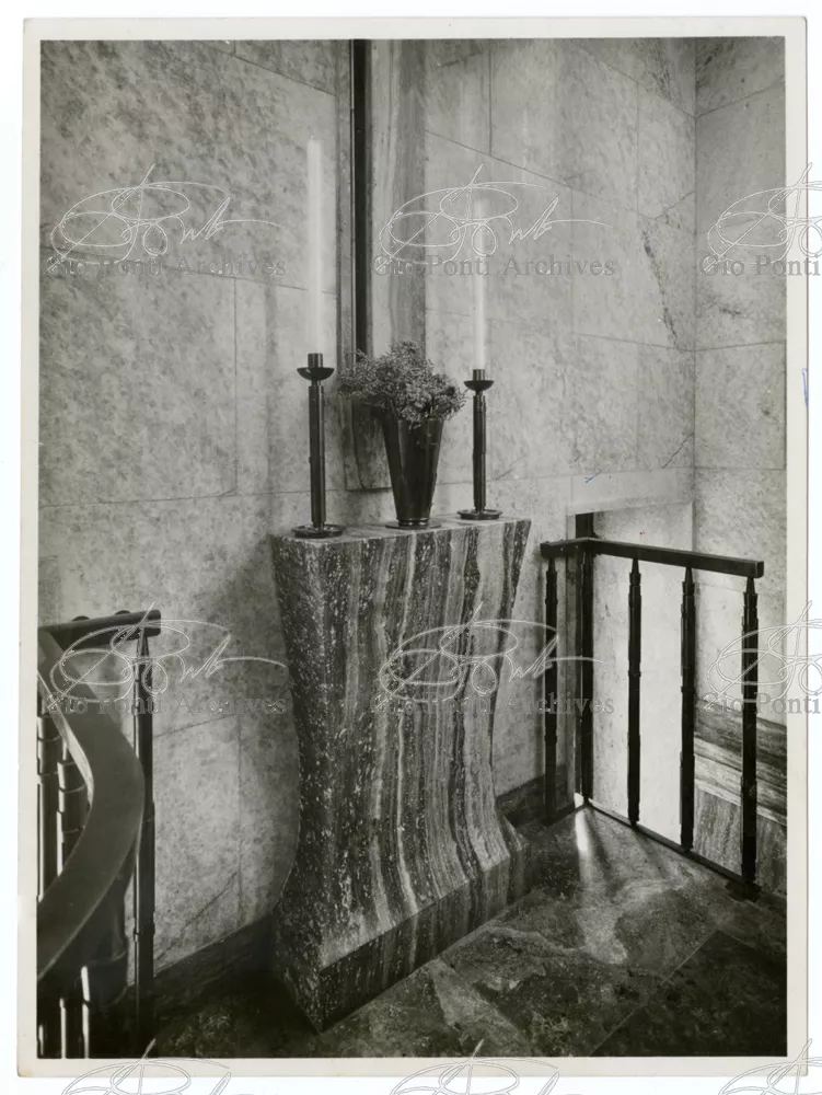 This is a small work, one of Ponti's favourites. He described it as his first step away from an architecture d'apres I 'architecture. He liked the two angels on the facade, a high relief by Libero Andreotti. The building is faced, inside and out, with marble; bronze doors, travertine altar, gold mosaic ceiling.