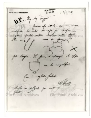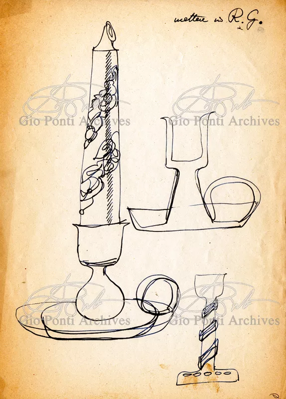 Carlo Zerbi and Luigi Tazzini, managers of the Doccia factory when Ponti joined the company, were the first people to receive the urgent «written/drawn letters» that were to shower onto all his future collaborators (they are his finest letters, free of deference and sentiment). They contained such instructions as «let the execution be expressive, and perfect and beautiful» and, for the vases, «let the architecture graze the clouds a little, it doesn't look bad: all the rest is fine." Or «copies should be made at once,» "reproductions of the pieces sold in Paris have to be very faithful and accurate: it is for the honor ofourfirm,» and «have all the new pieces photographed: we will send the pictures to Ojetti, to Paris and Monza: it is worth keeping a series or two for Maraini, who might write some articles for English and American magazines: have you read today's Corriere».?s