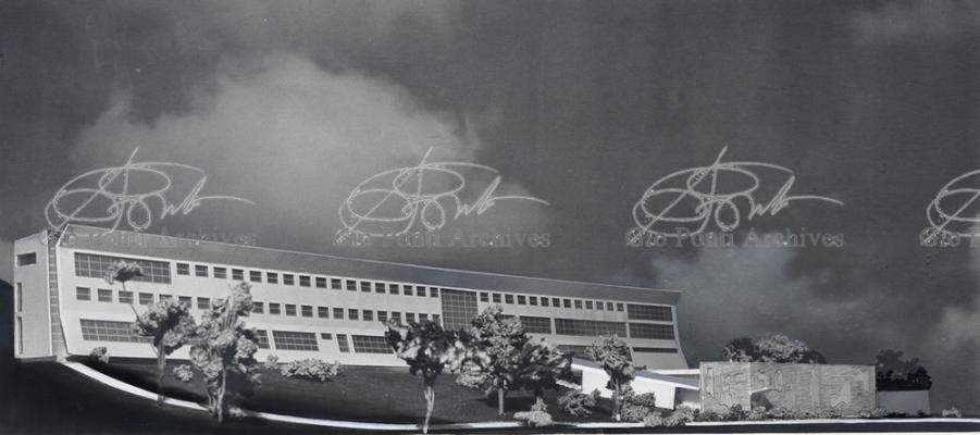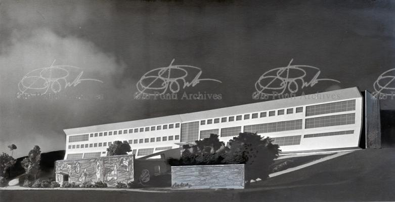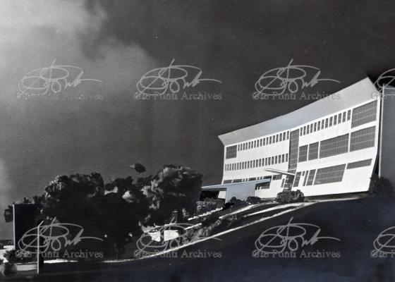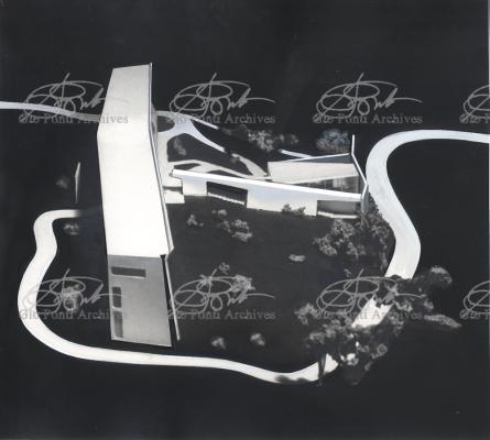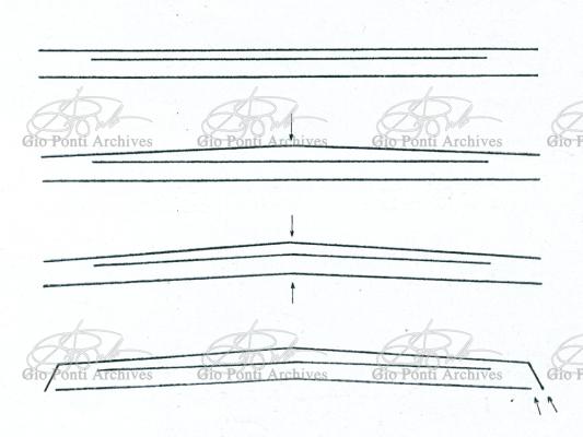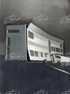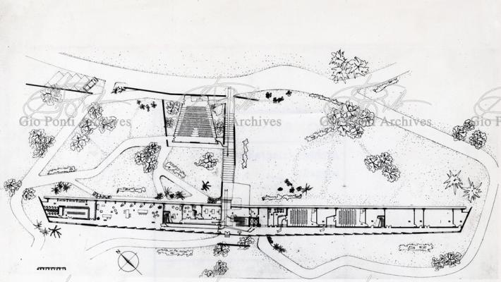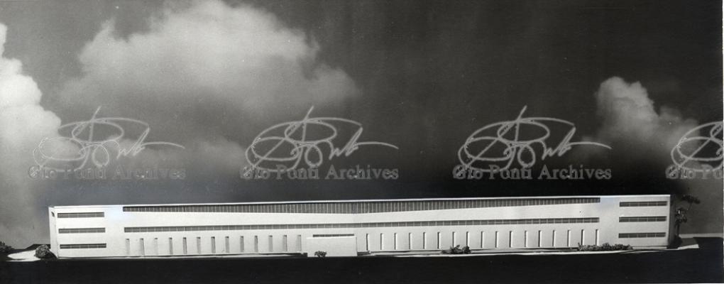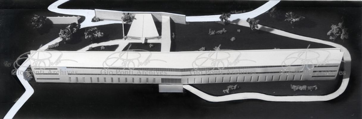 The stimulating country of Brazil, which he visited in 1952, gave Ponti the opportunity to produce two projects that were never carried out but that were farsighted in their approach: the project for the Predio Italia (Italo-Brazilian Centre) and the project for the Faculty of Nuclear Physics at Sao Paulo -a long horizontal building that Ponti liked to point to as the forerunner of the finite form, the closed form of the Pirelli building. The long front bends slightly in the middle, and the rear wall turns forward at both ends, thus closing the form. The walls have the appearance of hanging screens (another Pontian principle): the front thin perforated surface, bent at the top to form an overhang, and bent at the bottom to give greater depth to the lecture rooms on the ground floor does not touch the ground; front and sides are detached at the corner they are two sheets, and their slenderness is visible; the roof overhangs at the back. Moreover another principle the project separates into distinct, immediately recognizable volumes, the different elements of which the building is composed: the auditorium, a volume that is out of' scale with respect to the lecture rooms, is pulled out and set apart to form a block. Lastly, an invention: the dedicatory wall, along the edge of the plot. It is a long, freestanding screen on which to assemble all the images of art that dedicate this building to Italy. (This expression of dedication is the same as can be seen in the highly ornate facades of certain palaces and churches, true architectural proclamations, detached from the rest of the building.)