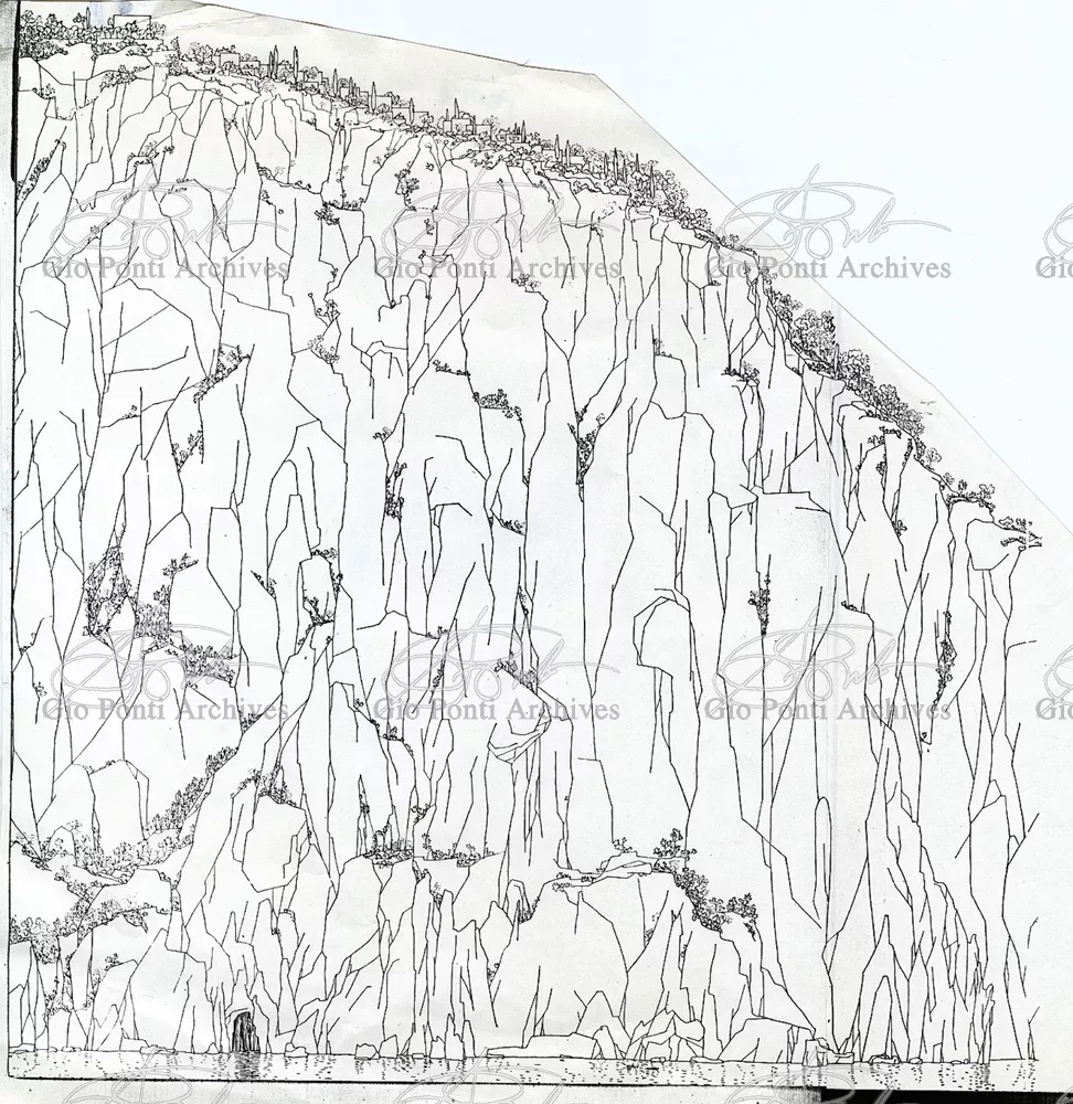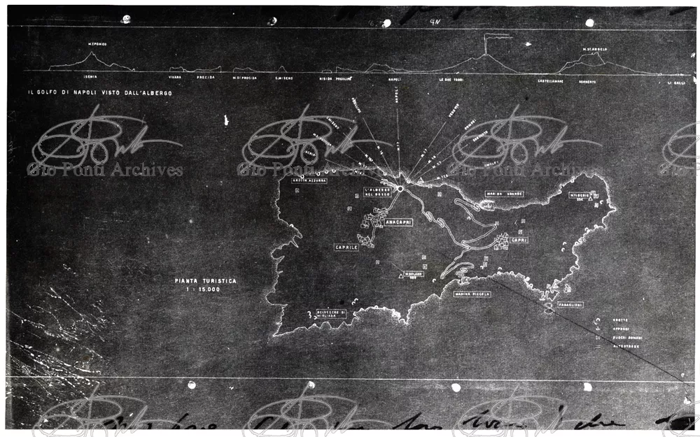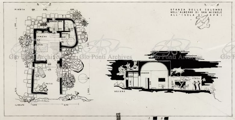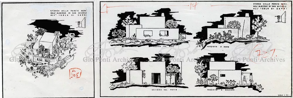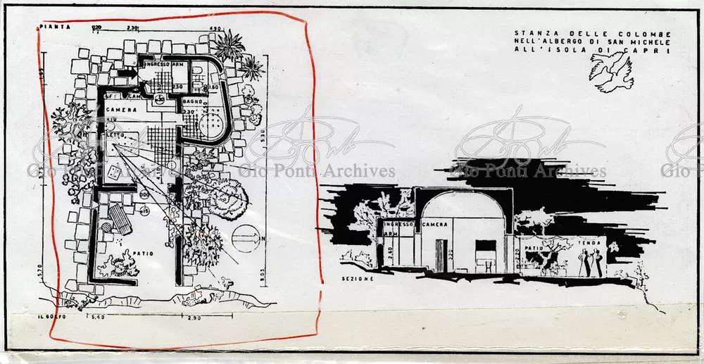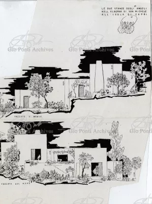 Ponti's and Rudofsky's ideas come together in the project for the San Michele hotel on Capri: a spontaneous hotel, made up of separate houses/rooms scattered through a wood, each with its own patio and name; from the rooms many paths/corridors converge on a tiny village, the heart of the hotel and residence of the manager (or rather, the gentleman who manages the place). Rudofsky's Mediterranean is white, Ponti's colored. The names of the rooms (room of the angels, room of the doves, room of the sirens) are Ponti's. The idea of the bath basin sunk in the floor, surrounded by walls, a cool watery grotto inside the house, is Rudofsky's; and so is the idea of the masonry stairs with colored ceramic risers,and the idea that guests, on arrival, should leave all their clothing in a closet and use sandals, hats, and umbrellas designed by the architects (a Japanese idea: Rudofsky discovered Japan, still in a pure state, before the contemporary Japanese).