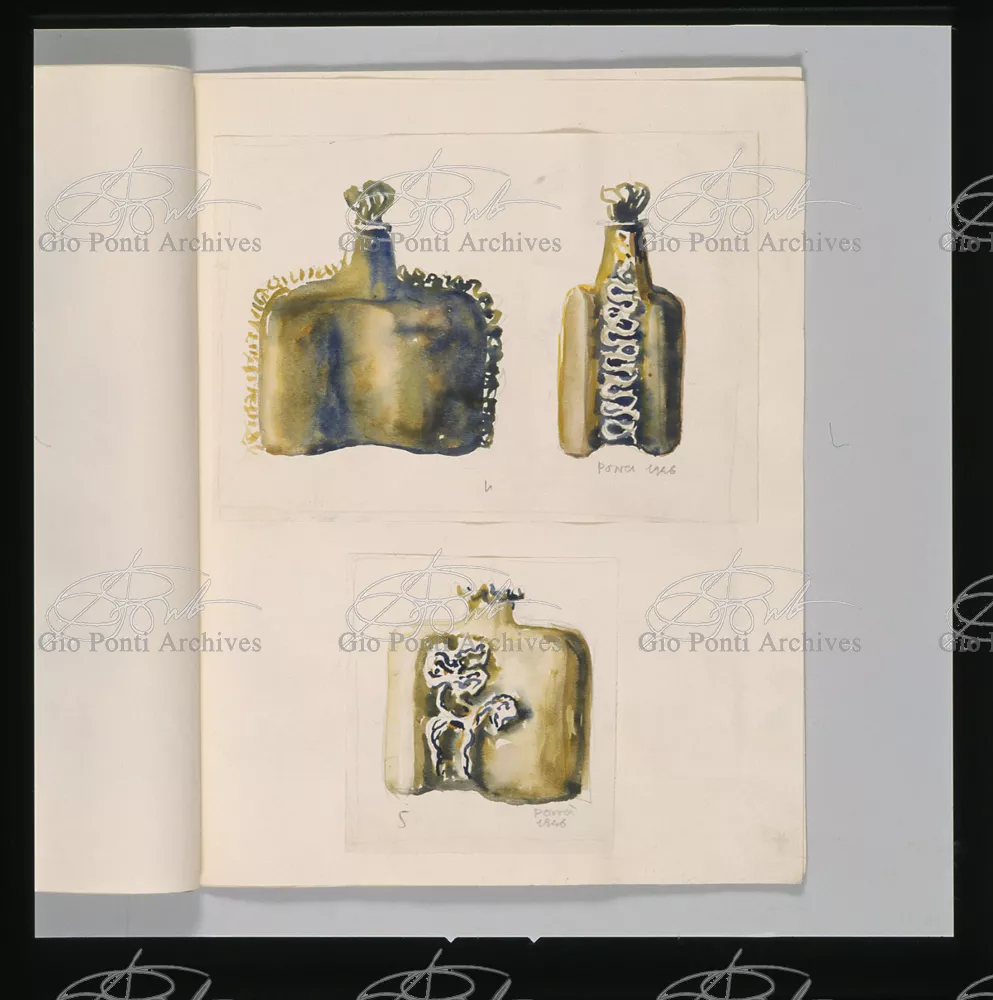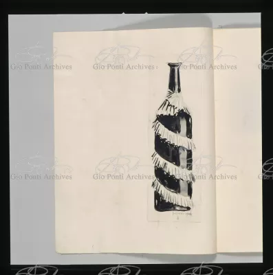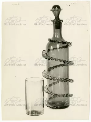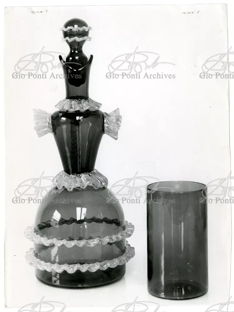 The collaboration between Gio Ponti and Paolo Venini, the founder of the modern history of Murano glass, dates right back to the twenties, when the Labirinto group,formed around Carla Visconti di Modrone in Milan, brought the industries of art together, for the first time, with architects -at that time, the architects were Buzzi, Lancia, Marelli, and Ponti- for the Triennial Exhibitions in Monza and Milan. Ponti's admiration for Venini's modern production was a lasting one. His direct involvement in its design took place in three phases, separated by long gaps of time: glass and silver objects for Venini and Christofle in 1928 (16th Venice Biennale); lamps, drinking glasses, and bottles (bottles in the shape of women) in 1946-50, playful combinations of blown glass and colour; and, lastly, the thick stained glass of 1966.