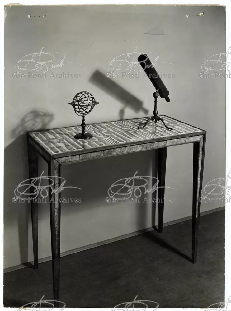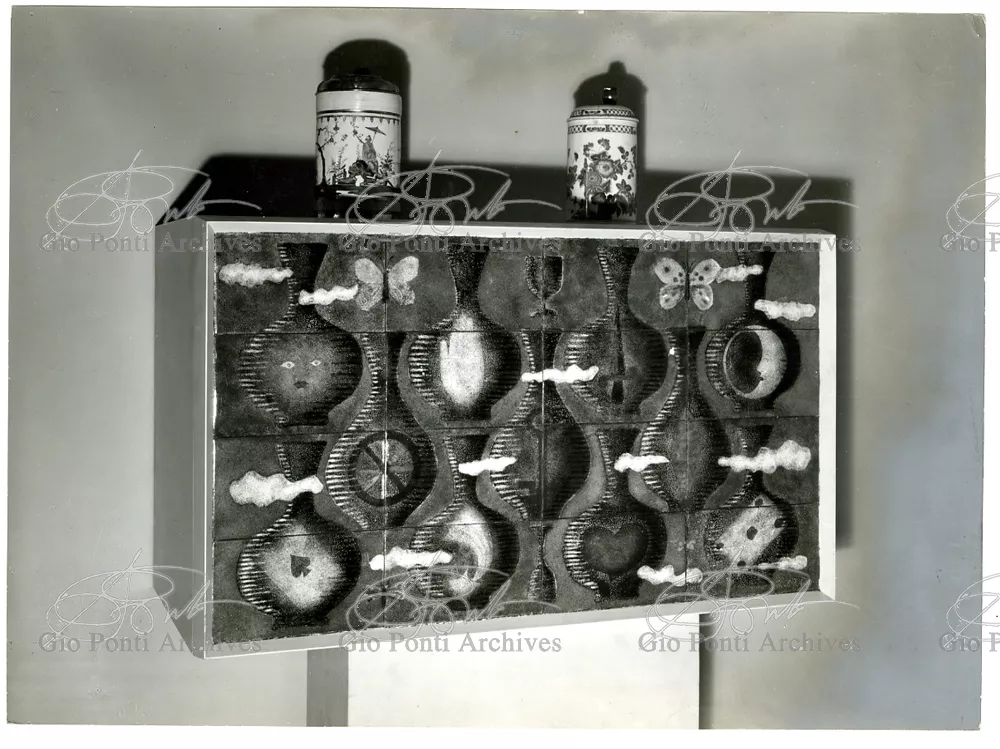 This furniture, which was to the liking of De Pisis and Daria Guarnati is a high spot in the long collaboration between Gio Ponti and Paolo de Poli, the master of enamel work on copper, indeed the man who refounded this art in Italy in 1933. The collaboration commenced in 1940 with the panels designed by Gio Ponti and made by De Poli for the halls of the rectorate at the University of Padua, and continued with other panels, some of them very large, for the transatlantic liners whose interiors were designed by Ponti, from the Conte Grande to the Conte Biancamano. Ponti and De Poli were to work together again in 1956. With De Poli, Ponti, the Italian designer of longest standing, was able to carry on with his everlasting amusement and play with the arts.