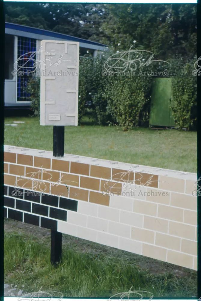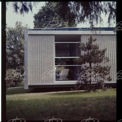 This pavilion in the park of the Triennale was not a small house; it was an example of integral use of new industrial products for the house, from construction to furnishings: from the Feal system of light prefabricated structure, to the roofing, the window elements, the external facings -all made out of aluminium- again by Feal, the walls made out of colored concrete-framed glass blocks by Fidenza, ceramic diamond-shaped tiles by Joo, rubber floorings by Pirelli, and the two-tone folding partitions (as Ponti's new furniture for Cassina and his new lamps for Arredoluce, still prototypes, were in two colours).