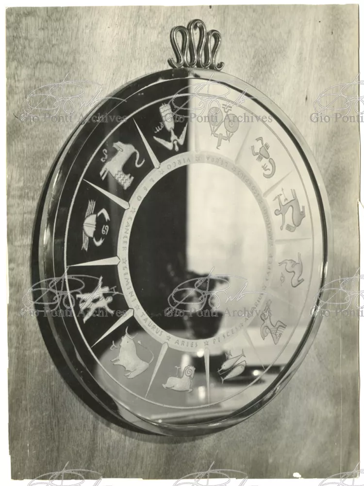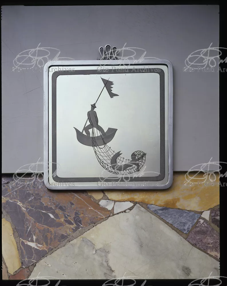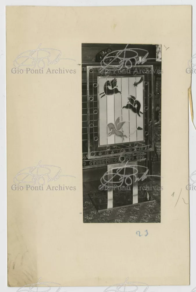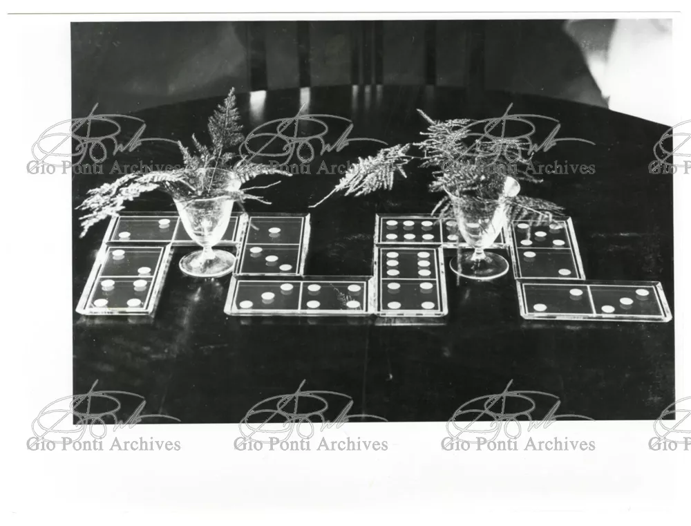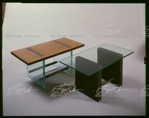For Gio Ponti crystal was the material for objects of great luxury. Luxury puts the designer's skills to no less of a test than the economic. In 1930 Gio Ponti designed for Fontana the large table with black crystal top and cut crystal legs that was presented at the 4th Triennial Exhibition in Monza. In 1931 Ponti began to design for Fontana a series of pieces of furniture topped with mirrors, exceptional furniture together with the first totally transparent ones made entirely of glass. In the spring of 1933 Ponti took over, along with Pietro Chiesa, the artistic direction of Fontana Arte, a branch of the Fontana firm. And the Fontana Arte output began to expand as had happened with Richard-Ginori, producing a multitude of large and small objects, from paperweights to lamps. At the same time he gave Fontana Arte the opportunity again as with Richard-Ginori to produce major works, such as the stained-glass walls he designed for the Faculty of Mathematics at Rome University, 1934, and for the Exhibition of the Catholic Press in the Vatican, 1936.