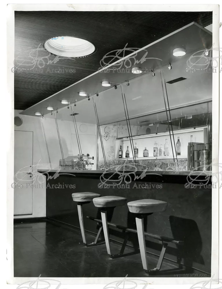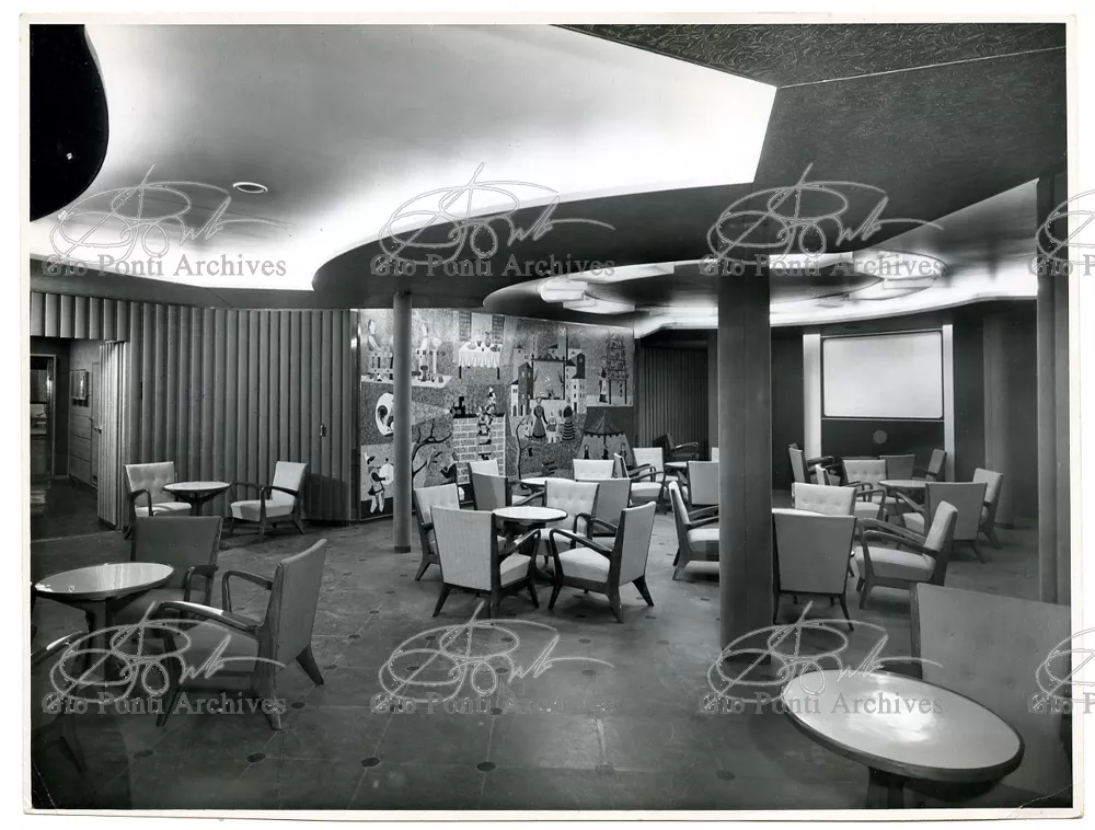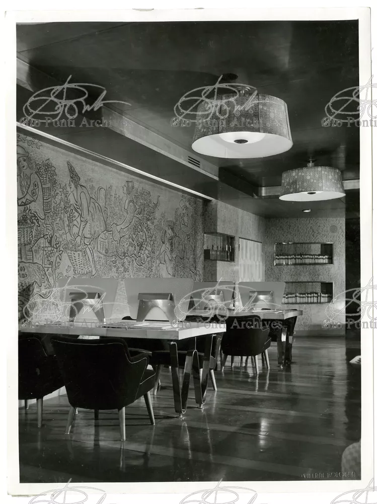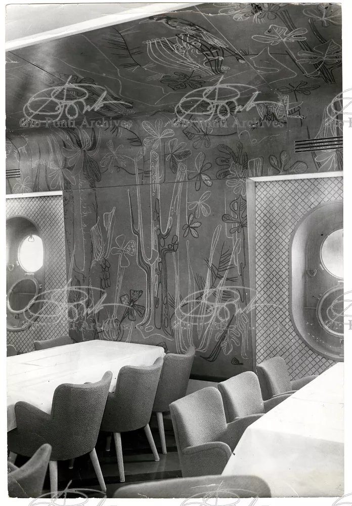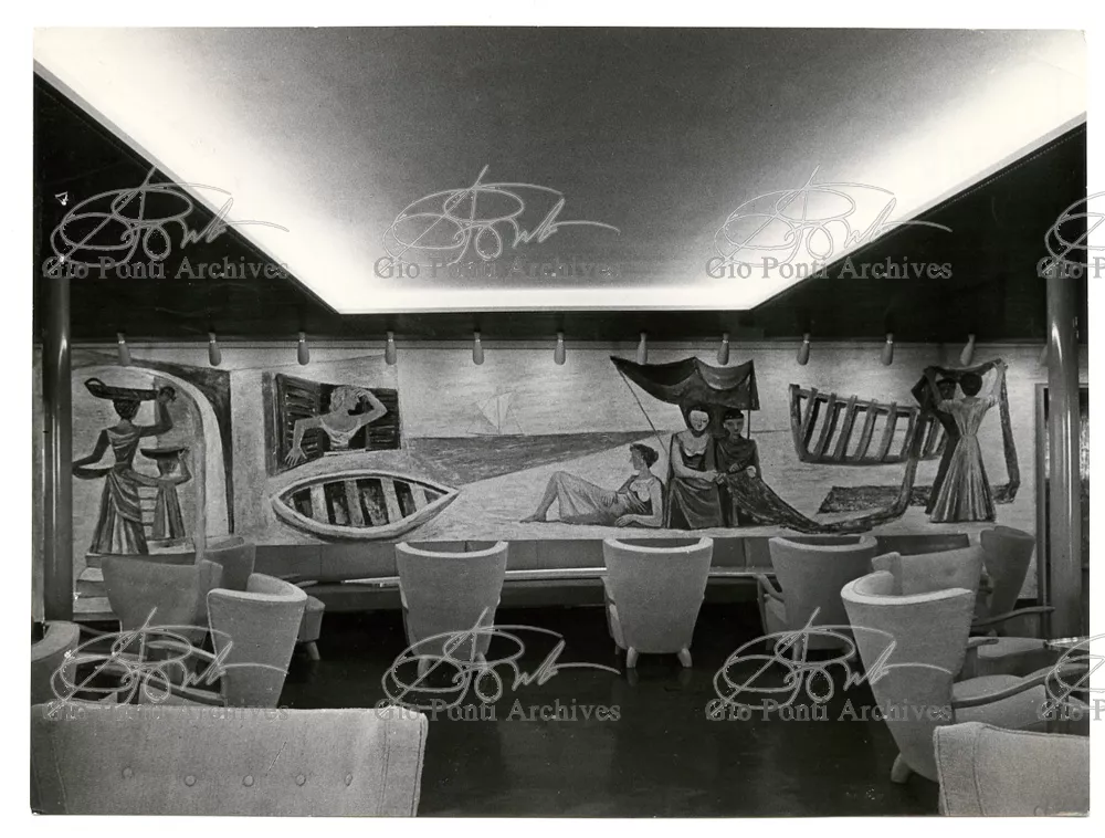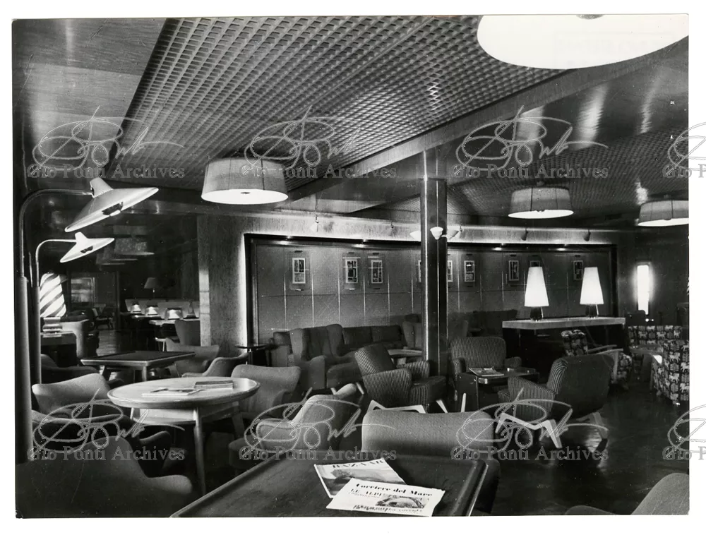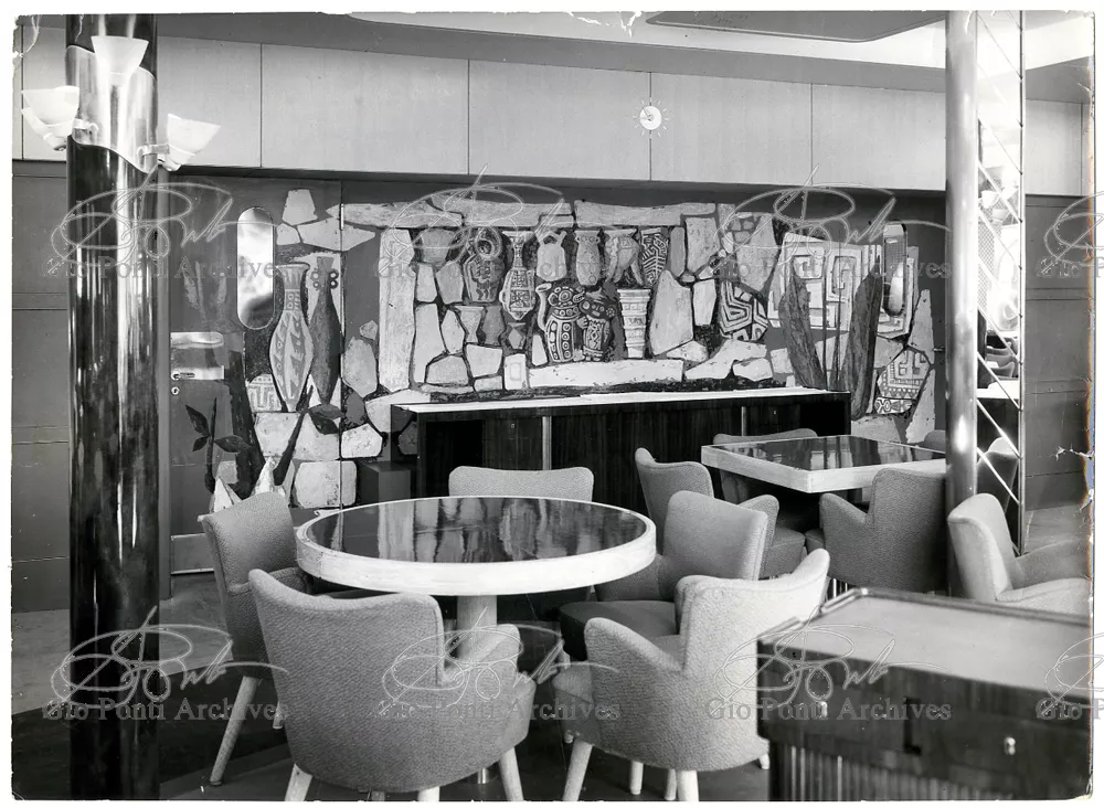 Ponti had always been interested in interior design for ships; he was an admirer of Gustavo Pulitzer and the innovative interiors that he designed for the 1931 motor ship Victoria. At the end of the forties he was involved in the post war renovation of four Italian liners (the Conte Grande, Conte Biancamano, Giulio Cesare, and Andrea Doria, in collaboration with Nino Zoncada. It was still a question of dressing the liner, not designing it. Yet his ships -ships he loaded with art, as traveling heralds of Italy- had two innovations in their unalterable internal spaces: partitions and pillars lined with light sheets of aluminium (a new application of the material), and illuminating ceilings: the low ceilings of the ship were transformed into airy displays. As in Ponti's interiors of the time, his decoration of these ships tended toward excess. And again, as in his interior decorations and in the pages of Domus, the Italian art that Ponti put on board was mainly ceramics: ceramic sculpture by Fontana, Melotti, and Leoncillo, as well as vases by Gambone, Melandri, and Zortea, and enamels by De Poli, designed by Ponti himself. There were also paintings, like the ones by Salvatore Fiume, on a theatrical scale. They were beautiful ships, even if sailing a little late. Designs by Ponti, in collaboration with Nino Zoncada.
