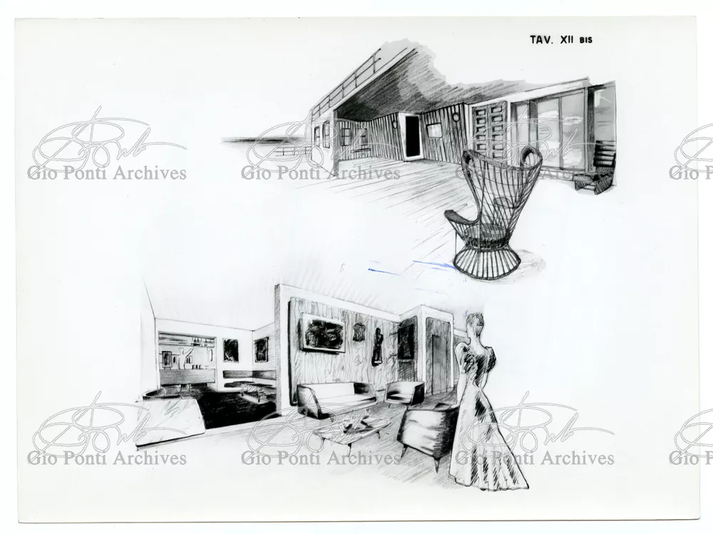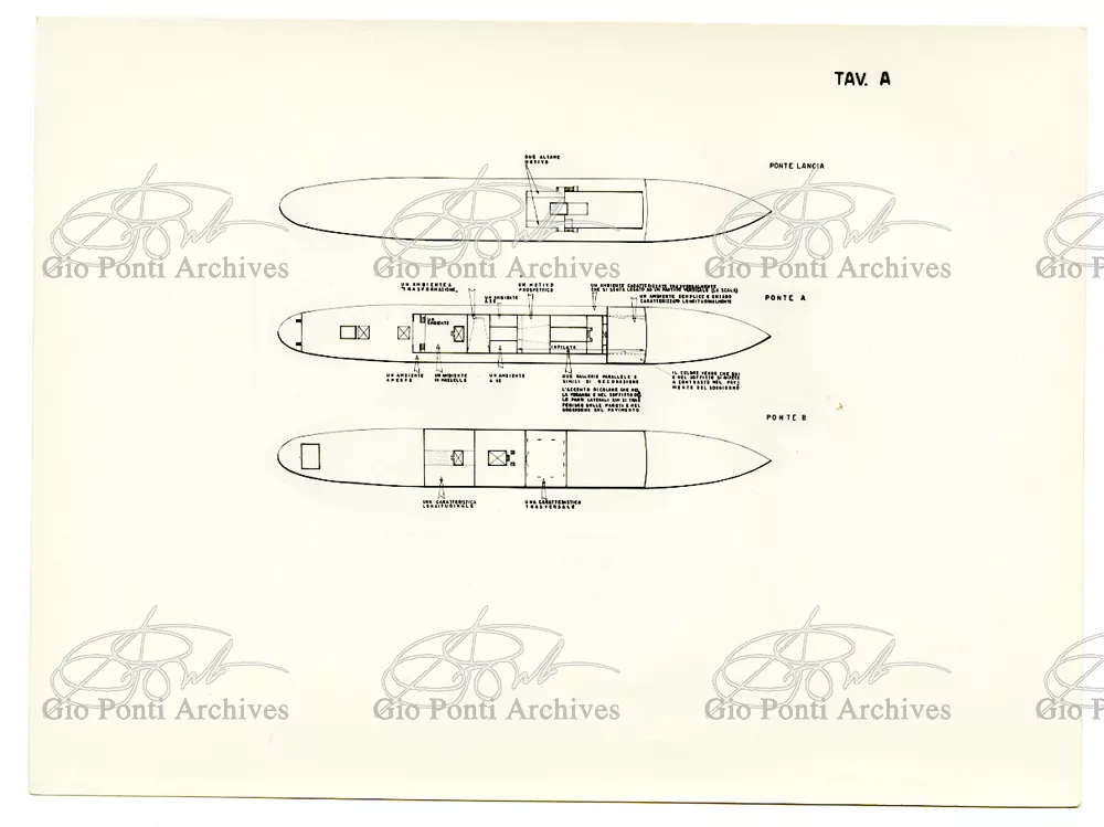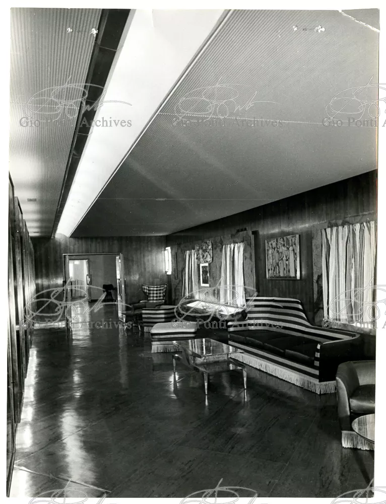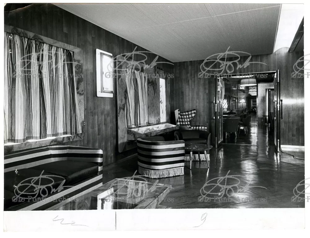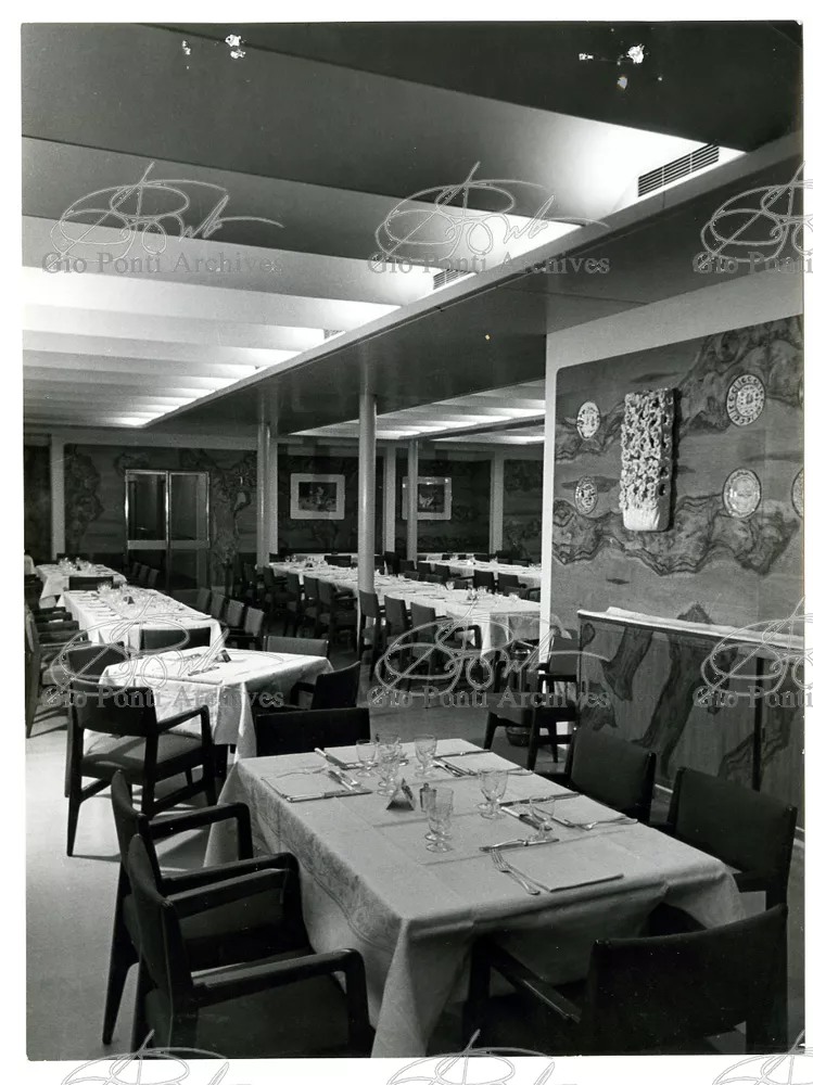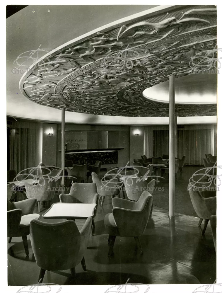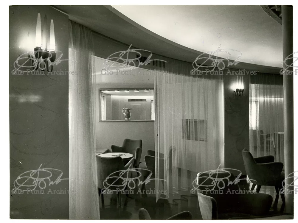 Ponti had always been interested in interior design for ships; he was an admirer of Gustavo Pulitzer and the innovative interiors that he designed for the 1931 motor ship Victoria. At the end of the forties he was involved in the post war renovation of four Italian liners (the Conte Grande, Conte Biancamano, Giulio Cesare, and Andrea Doria, in collaboration with Nino Zoncada. It was still a question of dressing the liner, not designing it. Yet his ships -ships he loaded with art, as traveling heralds of Italy- had two innovations in their unalterable internal spaces: partitions and pillars lined with light sheets of aluminium (a new application of the material), and illuminating ceilings: the low ceilings of the ship were transformed into airy displays. As in Ponti's interiors of the time, his decoration of these ships tended toward excess. And again, as in his interior decorations and in the pages of Domus, the Italian art that Ponti put on board was mainly ceramics: ceramic sculpture by Fontana, Melotti, and Leoncillo, as well as vases by Gambone, Melandri, and Zortea, and enamels by De Poli, designed by Ponti himself. There were also paintings, like the ones by Salvatore Fiume, on a theatrical scale. They were beautiful ships, even if sailing a little late. Designs by Ponti, in collaboration with Nino Zoncada.