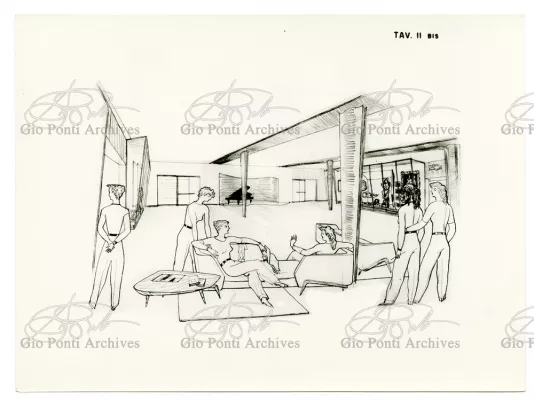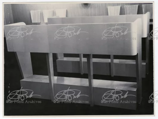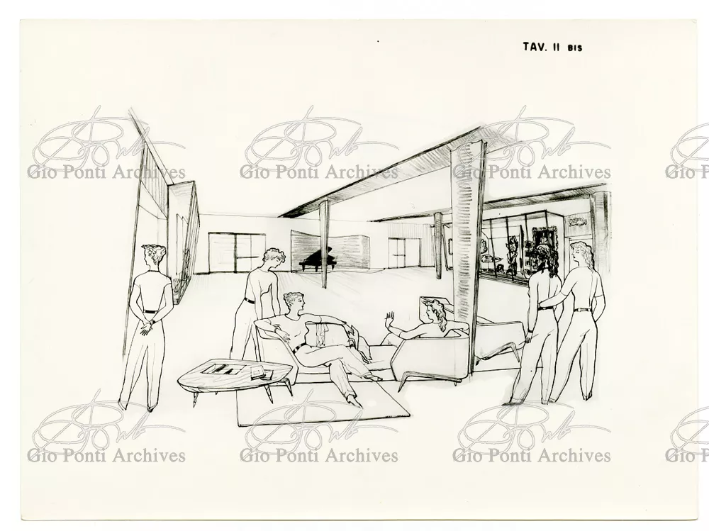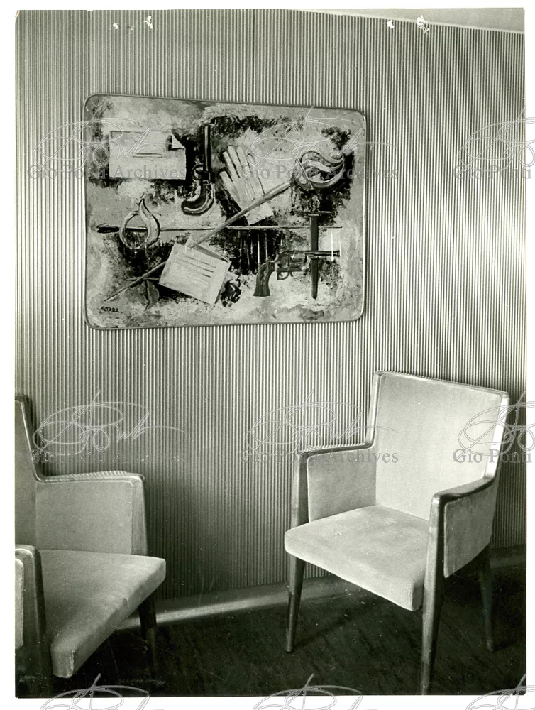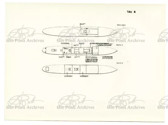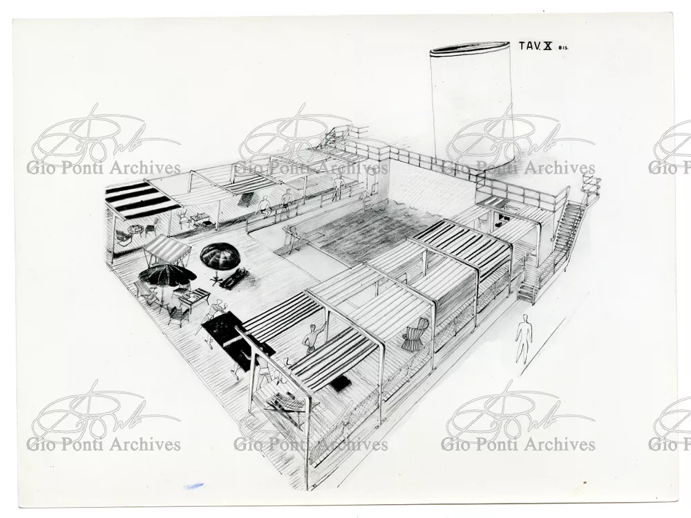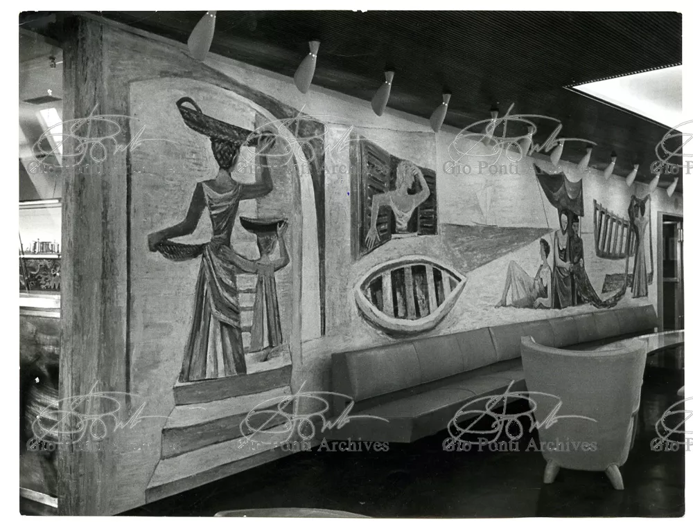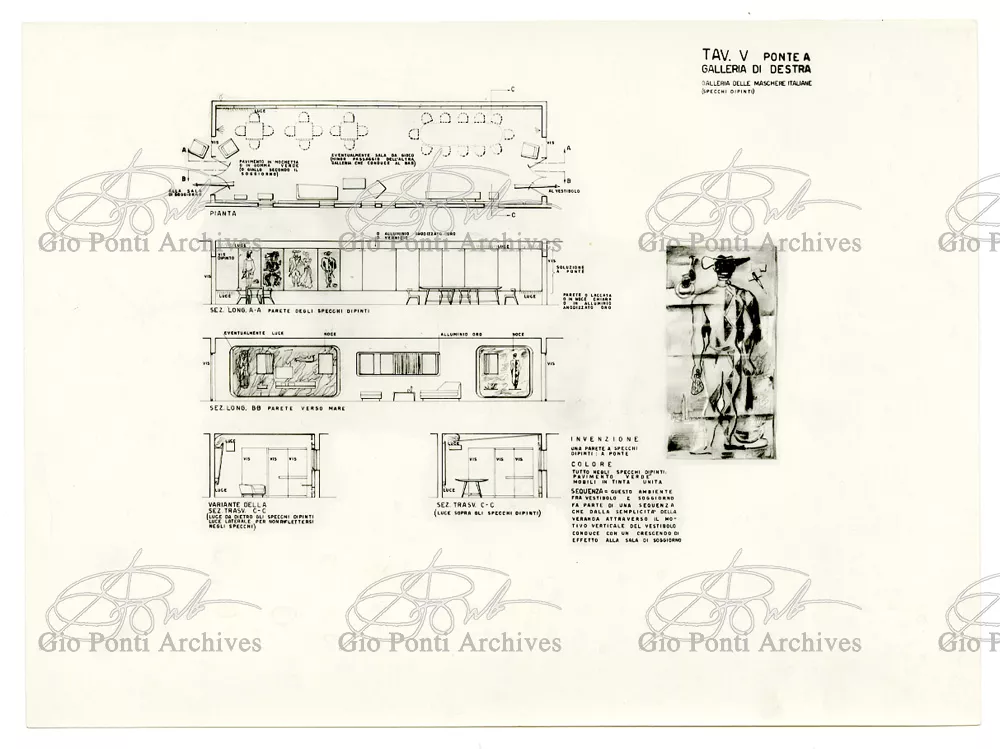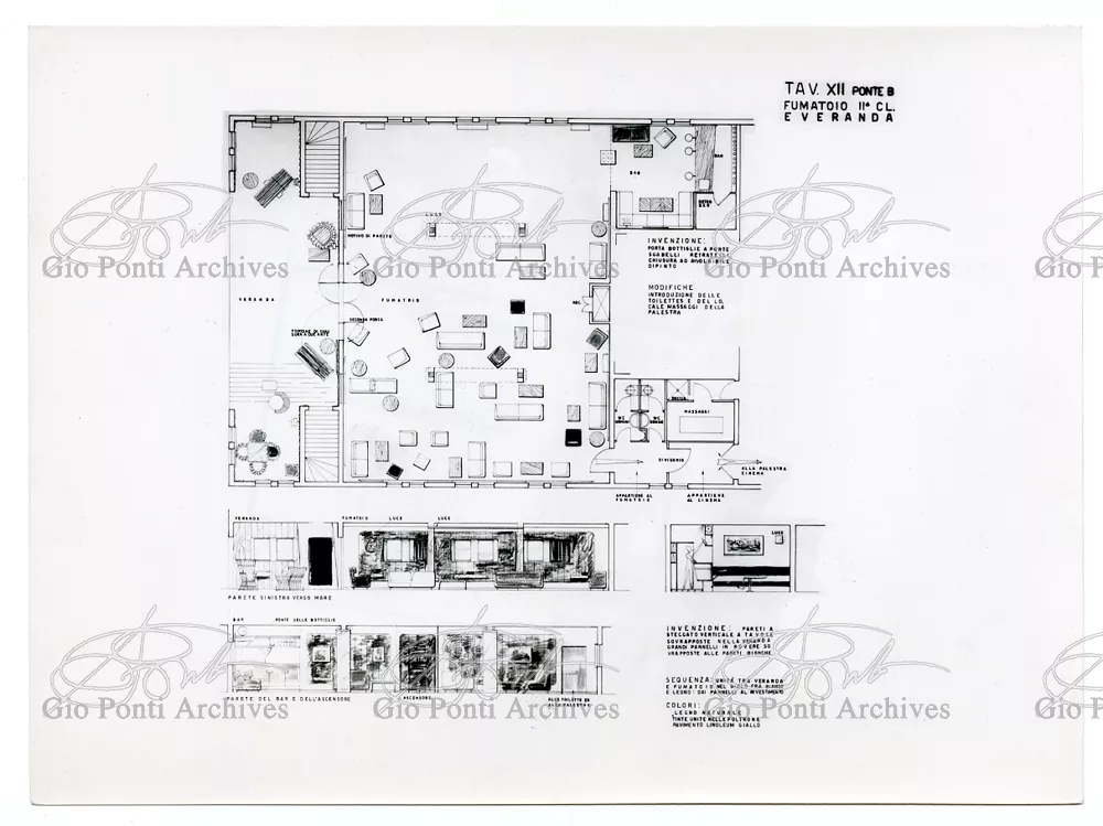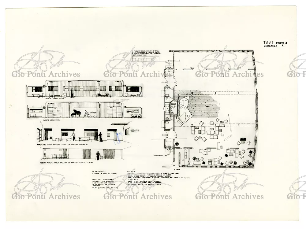 Ponti had always been interested in interior design for ships; he was an admirer of Gustavo Pulitzer and the innovative interiors that he designed for the 1931 motor ship Victoria. At the end of the forties he was involved in the post war renovation of four Italian liners (the Conte Grande, Conte Biancamano, Giulio Cesare, and Andrea Doria, in collaboration with Nino Zoncada. It was still a question of dressing the liner, not designing it. Yet his ships -ships he loaded with art, as traveling heralds of Italy- had two innovations in their unalterable internal spaces: partitions and pillars lined with light sheets of aluminium (a new application of the material), and illuminating ceilings: the low ceilings of the ship were transformed into airy displays. As in Ponti's interiors of the time, his decoration of these ships tended toward excess. And again, as in his interior decorations and in the pages of Domus, the Italian art that Ponti put on board was mainly ceramics: ceramic sculpture by Fontana, Melotti, and Leoncillo, as well as vases by Gambone, Melandri, and Zortea, and enamels by De Poli, designed by Ponti himself. There were also paintings, like the ones by Salvatore Fiume, on a theatrical scale. They were beautiful ships, even if sailing a little late. Designs by Ponti, in collaboration with Nino Zoncada.