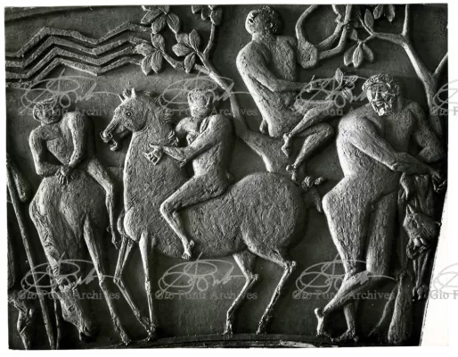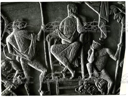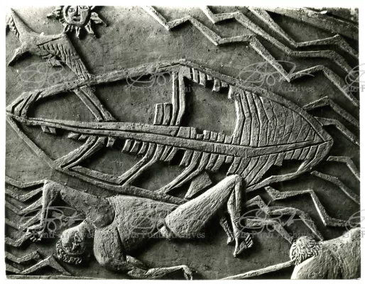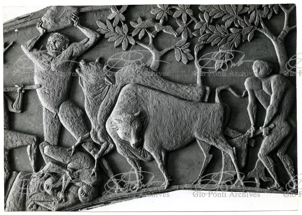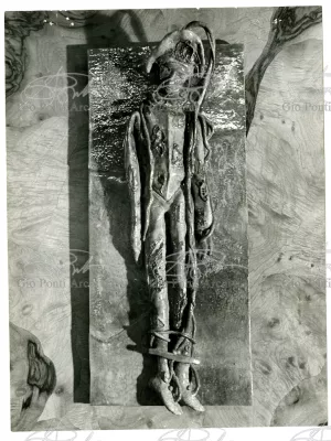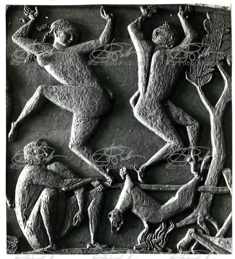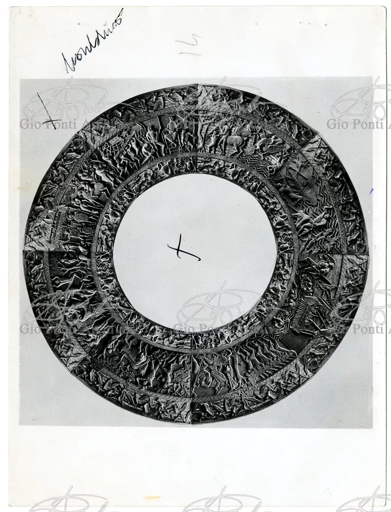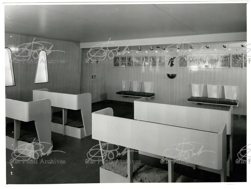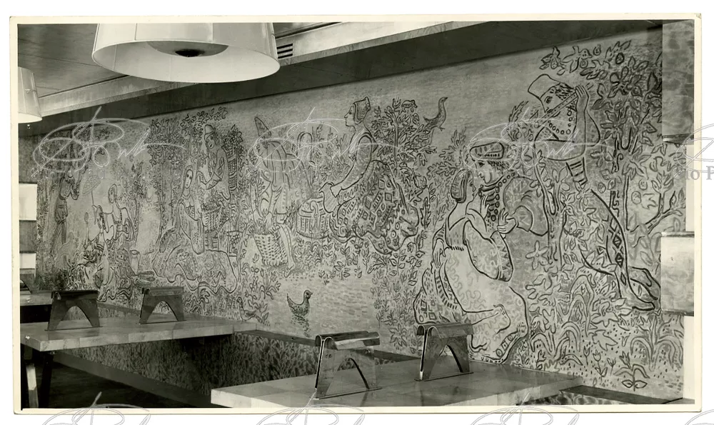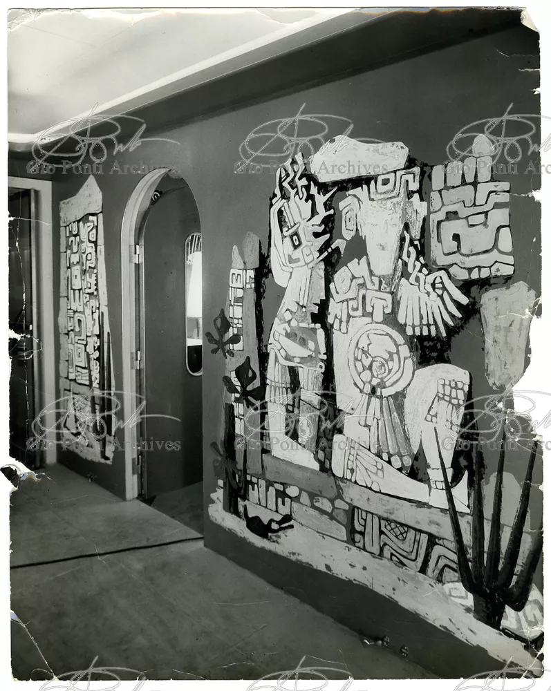 Ponti had always been interested in interior design for ships; he was an admirer of Gustavo Pulitzer and the innovative interiors that he designed for the 1931 motor ship Victoria. At the end of the forties he was involved in the post war renovation of four Italian liners (the Conte Grande, Conte Biancamano, Giulio Cesare, and Andrea Doria, in collaboration with Nino Zoncada. It was still a question of dressing the liner, not designing it. Yet his ships -ships he loaded with art, as traveling heralds of Italy- had two innovations in their unalterable internal spaces: partitions and pillars lined with light sheets of aluminium (a new application of the material), and illuminating ceilings: the low ceilings of the ship were transformed into airy displays. As in Ponti's interiors of the time, his decoration of these ships tended toward excess. And again, as in his interior decorations and in the pages of Domus, the Italian art that Ponti put on board was mainly ceramics: ceramic sculpture by Fontana, Melotti, and Leoncillo, as well as vases by Gambone, Melandri, and Zortea, and enamels by De Poli, designed by Ponti himself. There were also paintings, like the ones by Salvatore Fiume, on a theatrical scale. They were beautiful ships, even if sailing a little late. Designs by Ponti, in collaboration with Nino Zoncada.