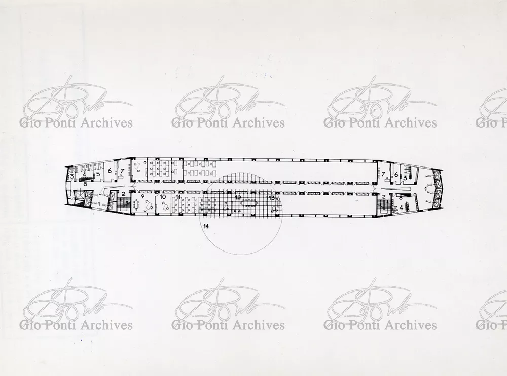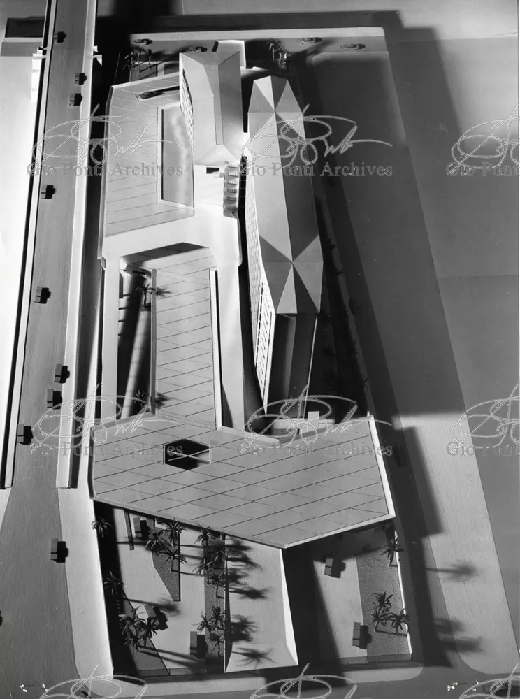 It responds, Ponti stressed, to a solely climatic environmental situation the city's architectural past has been wiped out, and this was the reason for the enormous arcade that covers almost the entire area 16,000 square meters, providing shelter for all the external routes, for both vehicles and pedestrians, and the car park. Out of the arcade rise the two blocks administrative offices, executive offices in contact with one another. The facades, clad with gray-blue ceramic tiles, have movable aluminium brise-soleils.