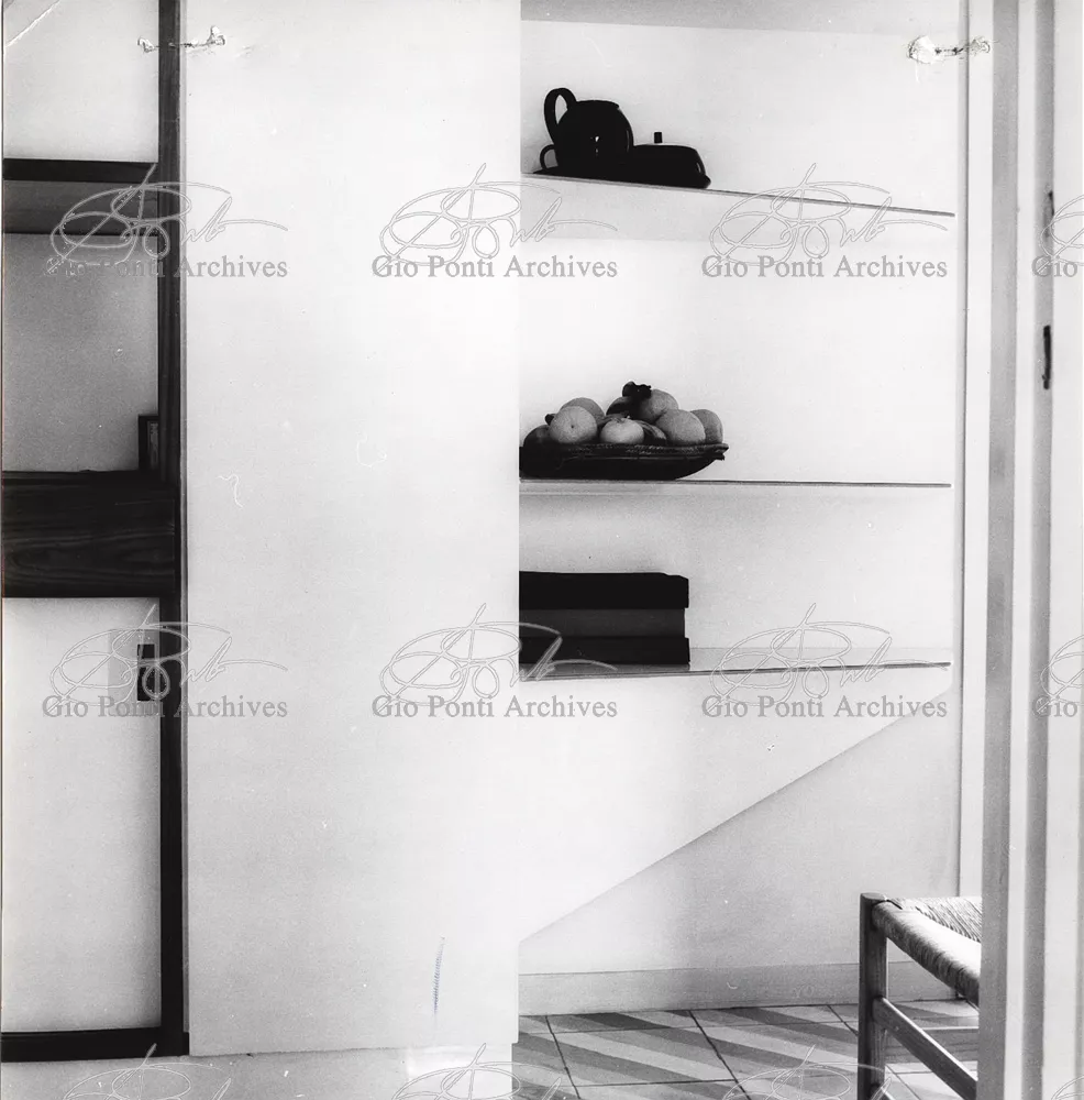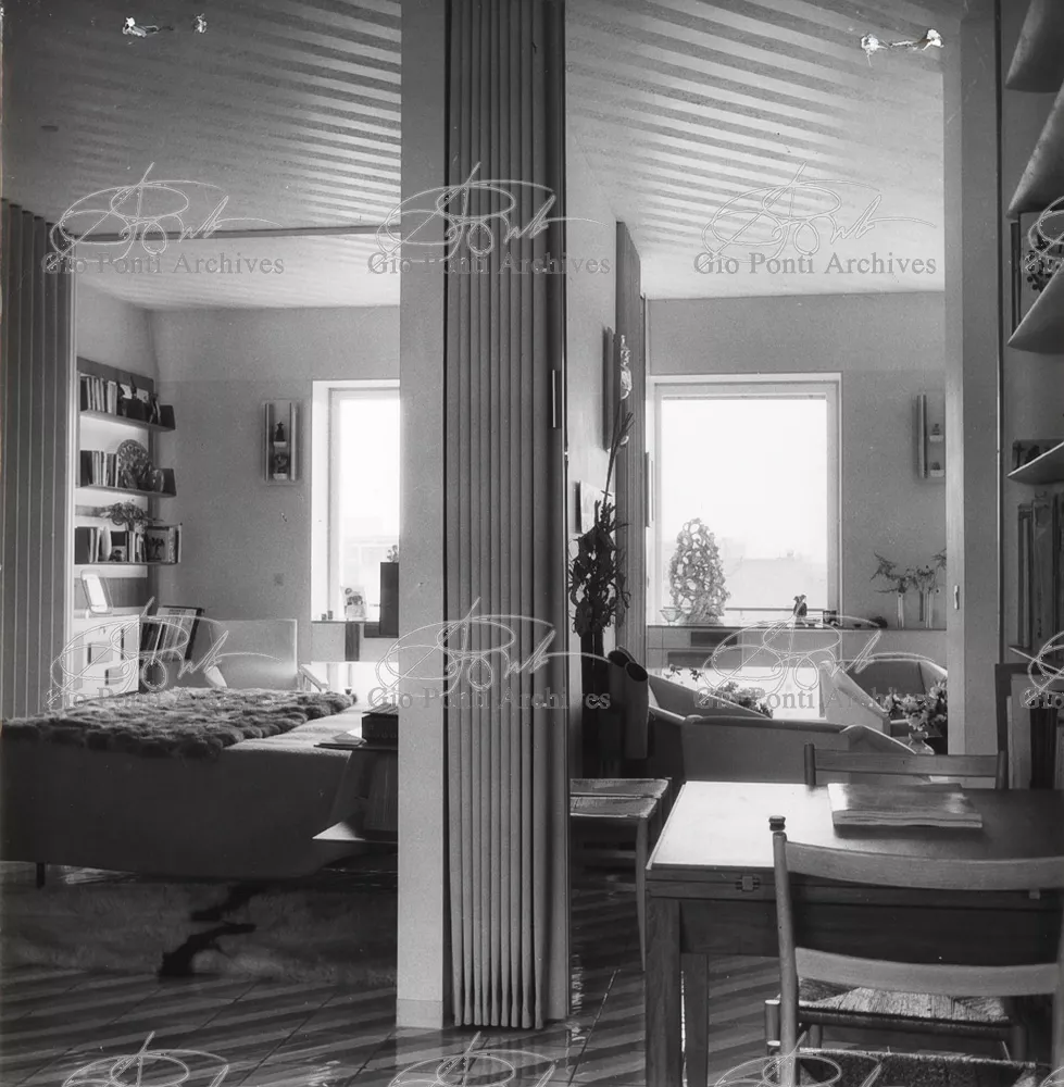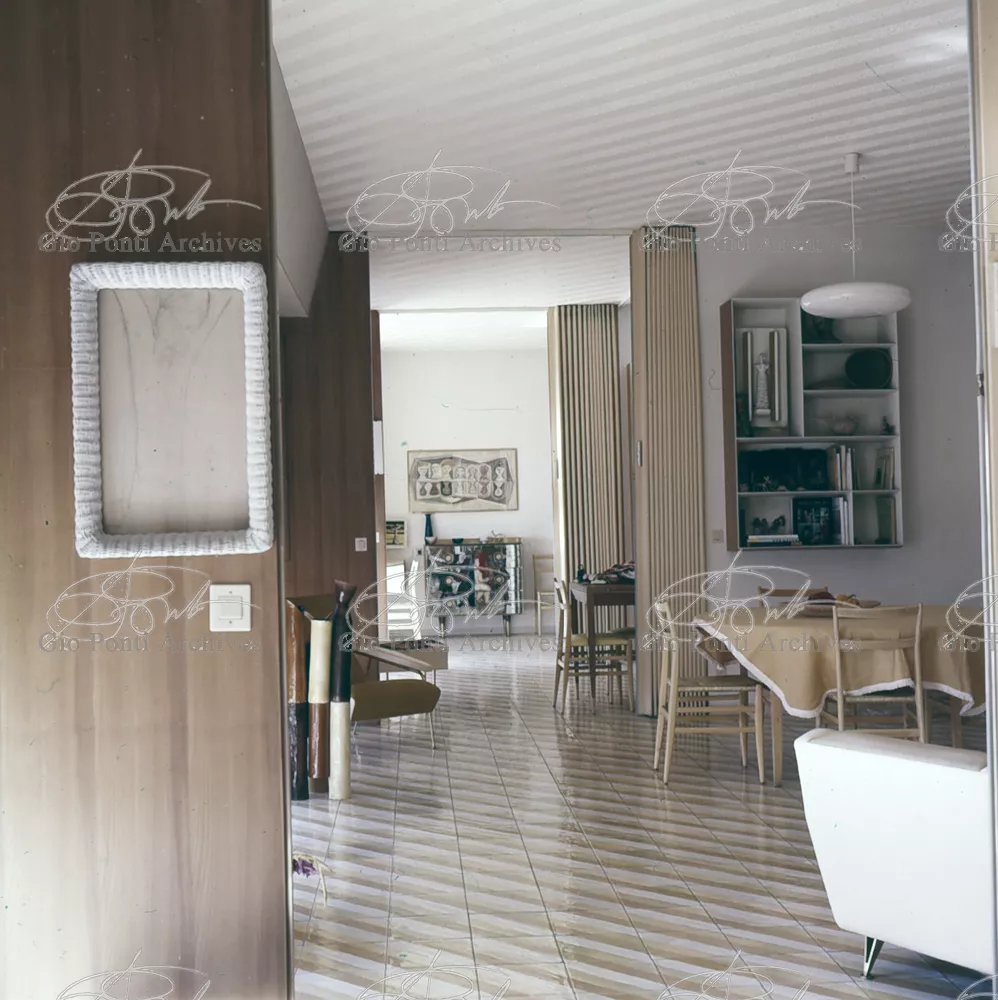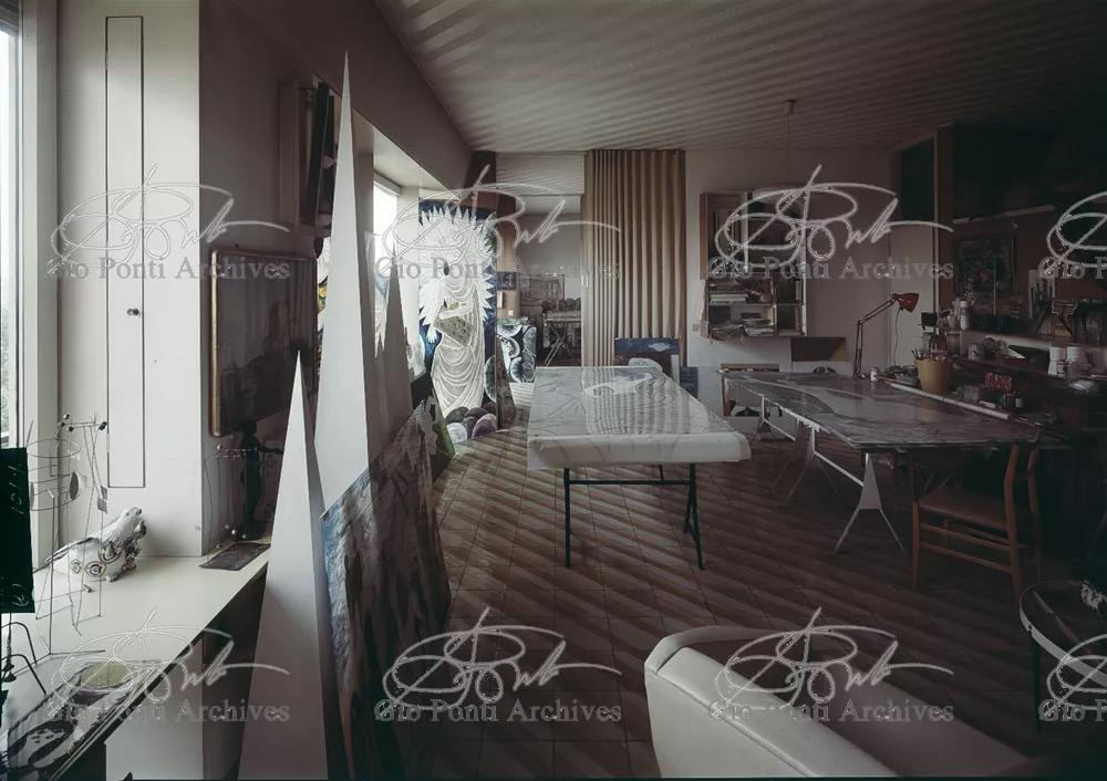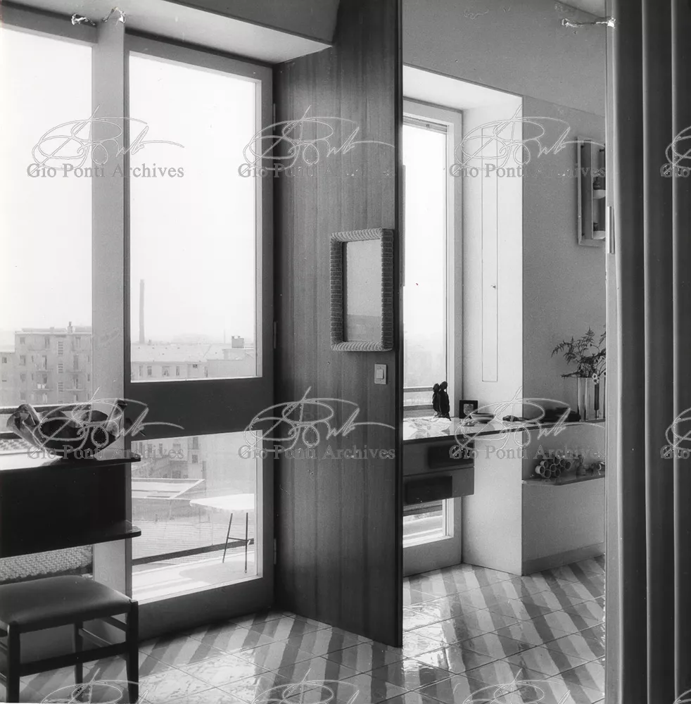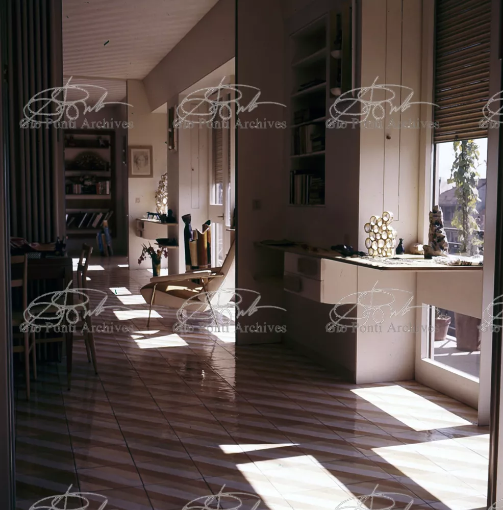 The apartment in which Gio Ponti lived, with his family, from 1957 onward (his last house), contains all of the Pontian inventions with regard to layout, walls, furniture, and objects that had appeared during the fifties, and that had originated even earlier. Here they are brought together, for the first time, in a unit and for real: from the open space with sliding walls to the furnished windows, self illuminating furniture, organized wall panels, diagonally striped floor and ceiling, single colour scheme here, white and yellow, identical chairs and beds for the entire apartment, and paintings placed on stands instead of hung on the walls. A demonstration house. And one in which everything came from the same mind and hand.And then the demonstration changed as Ponti's thinking about the house progressed. This highly liveable open space for five people turned into something else when Ponti lived there on his own: a free space in which to roam, amidst growing piles of drawings and paintings. Paintings on perspex too, an idea that Ponti came up with toward the end of his life, paintings to be looked at against the light, like stained-glass windows. At the age of eighty-six, Ponti painted twenty large angels on perspex,and thought about making, with this window painting displayed on every floor, a movable decoration for the whole facade of the apartment building -he was always thinking in festive terms, residents permitting. The facade would have allowed this: a facade of superimposed bands, in which, on every floor, the residents had been allowed to choose their own «outside colour, and even their own pattern of windows. Almost spontaneous architecture, Ponti used to say.