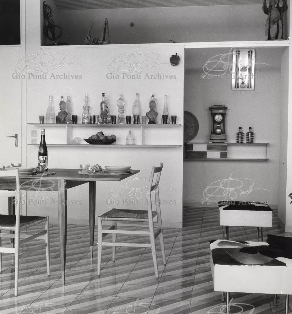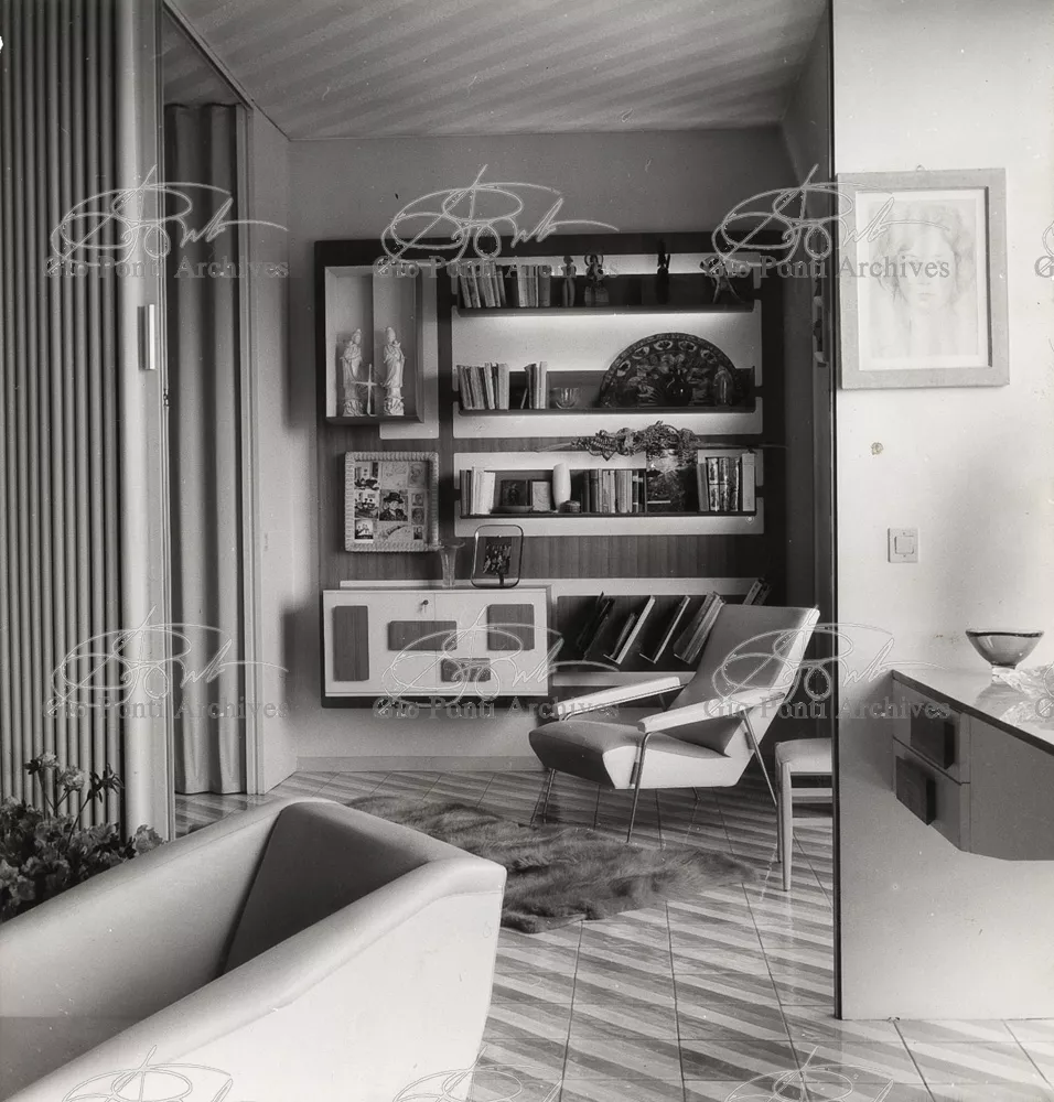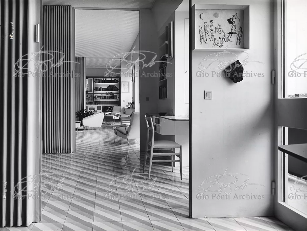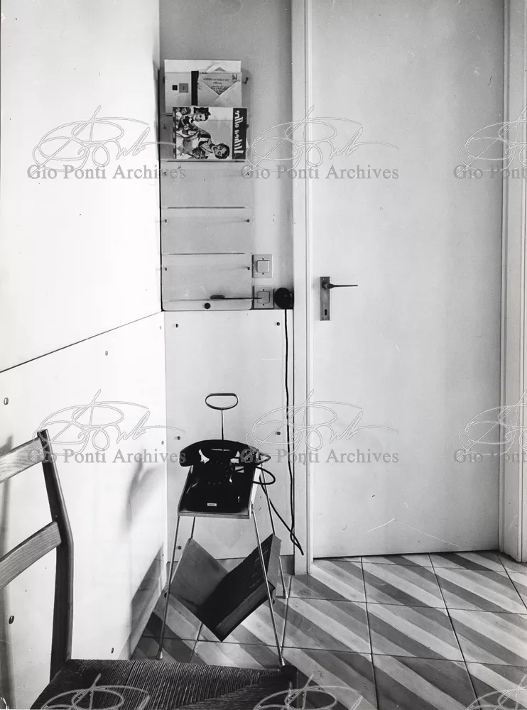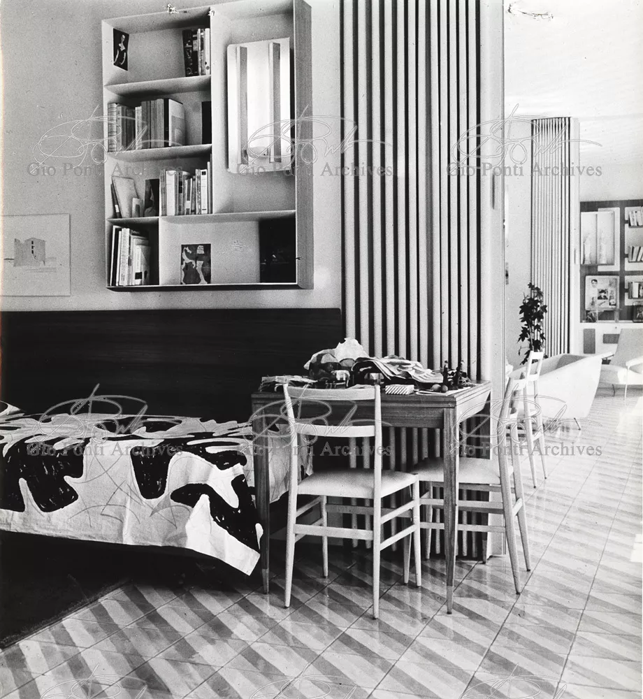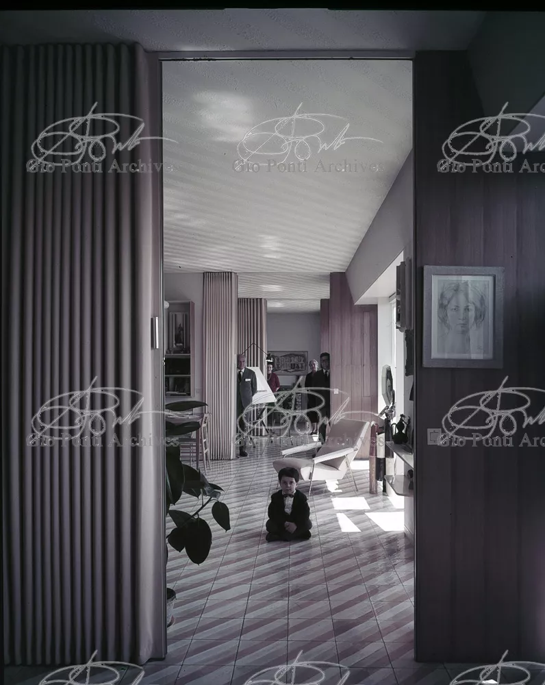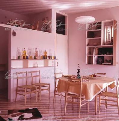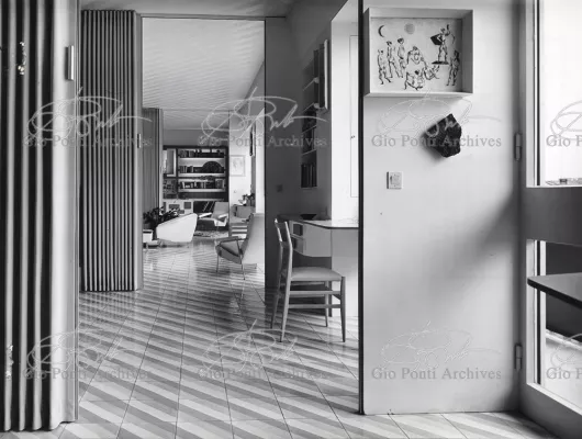 The apartment in which Gio Ponti lived, with his family, from 1957 onward (his last house), contains all of the Pontian inventions with regard to layout, walls, furniture, and objects that had appeared during the fifties, and that had originated even earlier. Here they are brought together, for the first time, in a unit and for real: from the open space with sliding walls to the furnished windows, self illuminating furniture, organized wall panels, diagonally striped floor and ceiling, single colour scheme here, white and yellow, identical chairs and beds for the entire apartment, and paintings placed on stands instead of hung on the walls. A demonstration house. And one in which everything came from the same mind and hand.And then the demonstration changed as Ponti's thinking about the house progressed. This highly liveable open space for five people turned into something else when Ponti lived there on his own: a free space in which to roam, amidst growing piles of drawings and paintings. Paintings on perspex too, an idea that Ponti came up with toward the end of his life, paintings to be looked at against the light, like stained-glass windows. At the age of eighty-six, Ponti painted twenty large angels on perspex,and thought about making, with this window painting displayed on every floor, a movable decoration for the whole facade of the apartment building -he was always thinking in festive terms, residents permitting. The facade would have allowed this: a facade of superimposed bands, in which, on every floor, the residents had been allowed to choose their own «outside colour, and even their own pattern of windows. Almost spontaneous architecture, Ponti used to say.