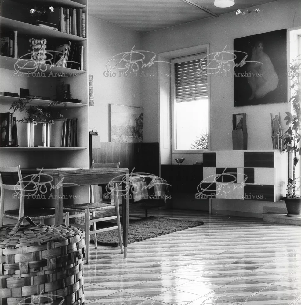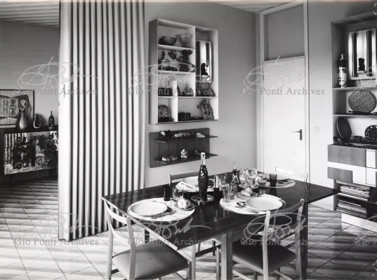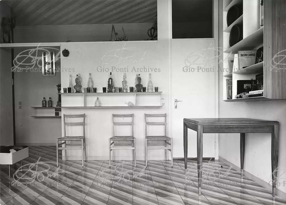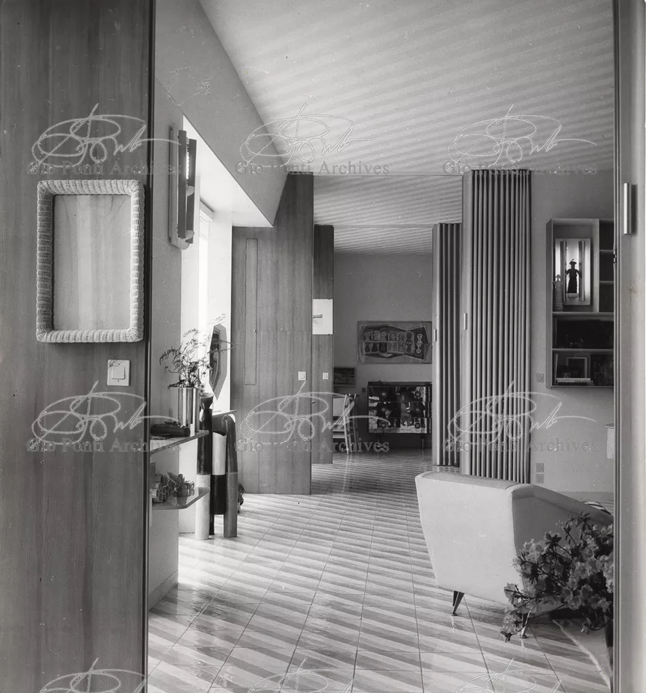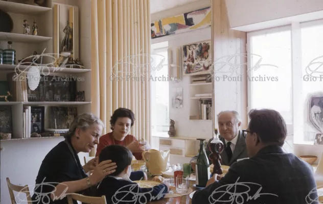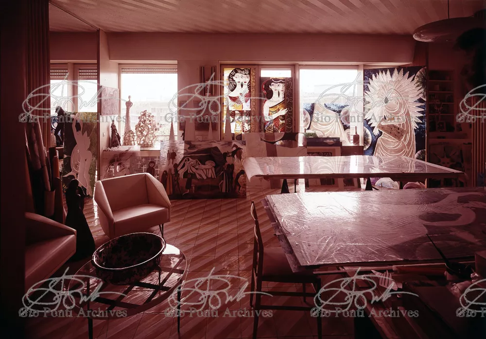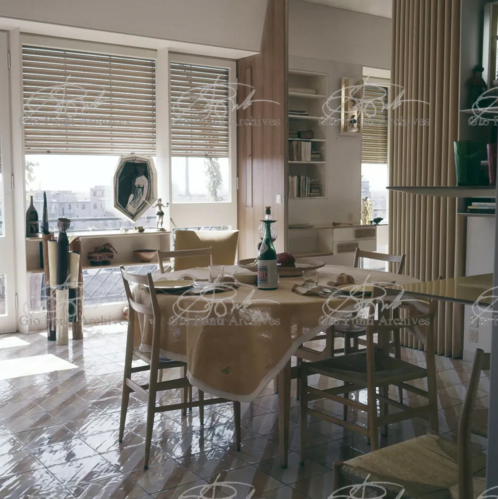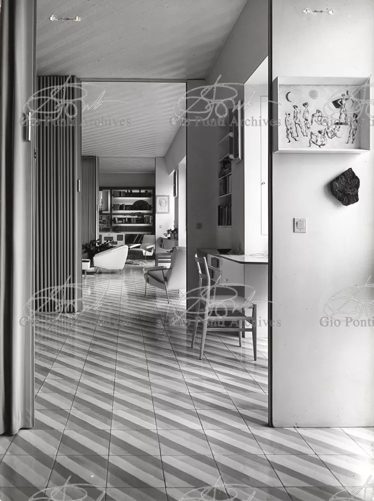 The apartment in which Gio Ponti lived, with his family, from 1957 onward (his last house), contains all of the Pontian inventions with regard to layout, walls, furniture, and objects that had appeared during the fifties, and that had originated even earlier. Here they are brought together, for the first time, in a unit and for real: from the open space with sliding walls to the furnished windows, self illuminating furniture, organized wall panels, diagonally striped floor and ceiling, single colour scheme here, white and yellow, identical chairs and beds for the entire apartment, and paintings placed on stands instead of hung on the walls. A demonstration house. And one in which everything came from the same mind and hand.And then the demonstration changed as Ponti's thinking about the house progressed. This highly liveable open space for five people turned into something else when Ponti lived there on his own: a free space in which to roam, amidst growing piles of drawings and paintings. Paintings on perspex too, an idea that Ponti came up with toward the end of his life, paintings to be looked at against the light, like stained-glass windows. At the age of eighty-six, Ponti painted twenty large angels on perspex,and thought about making, with this window painting displayed on every floor, a movable decoration for the whole facade of the apartment building -he was always thinking in festive terms, residents permitting. The facade would have allowed this: a facade of superimposed bands, in which, on every floor, the residents had been allowed to choose their own «outside colour, and even their own pattern of windows. Almost spontaneous architecture, Ponti used to say.