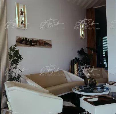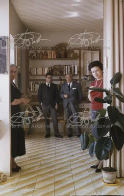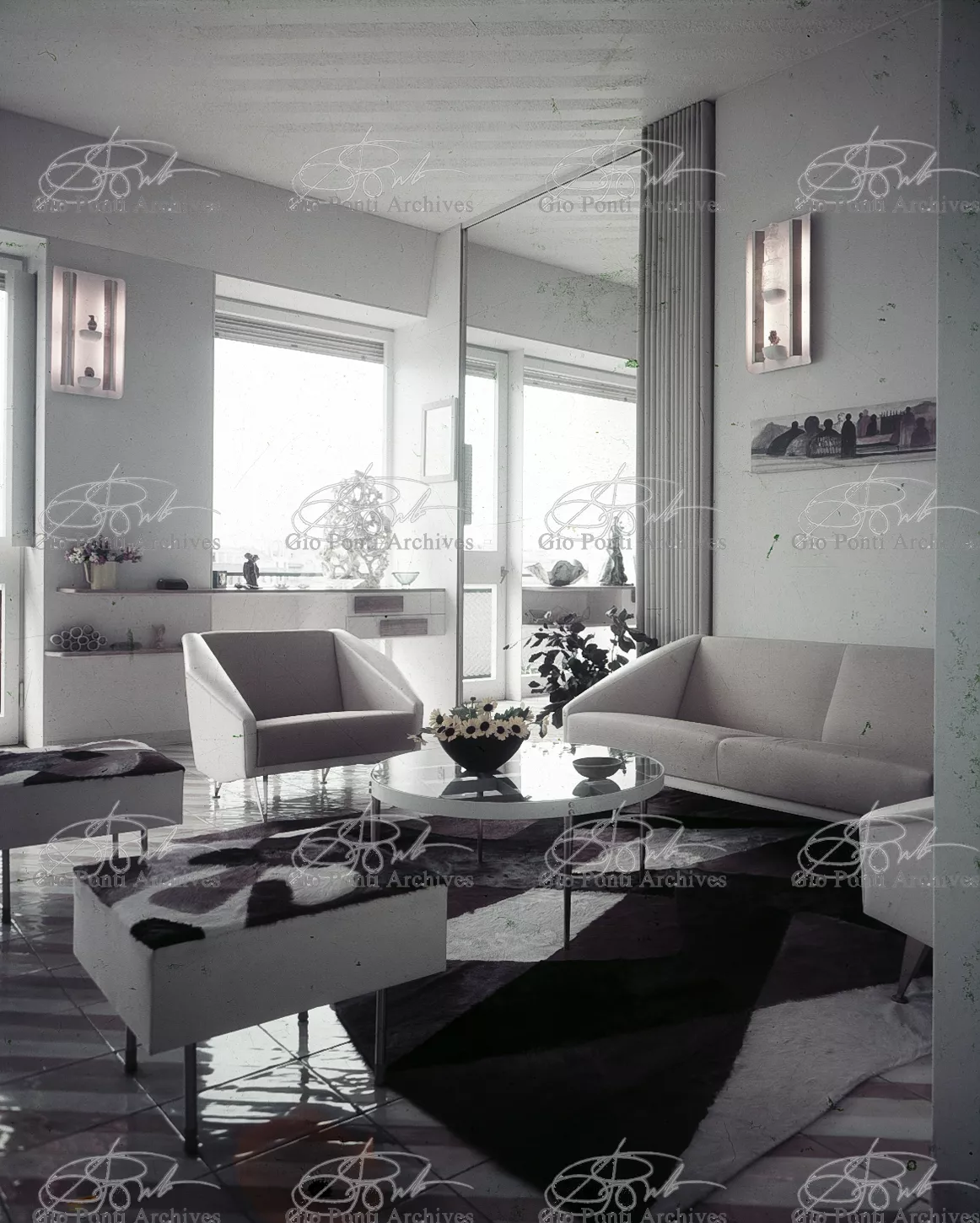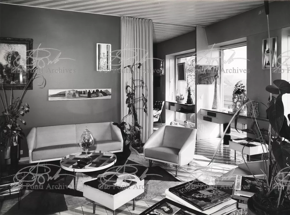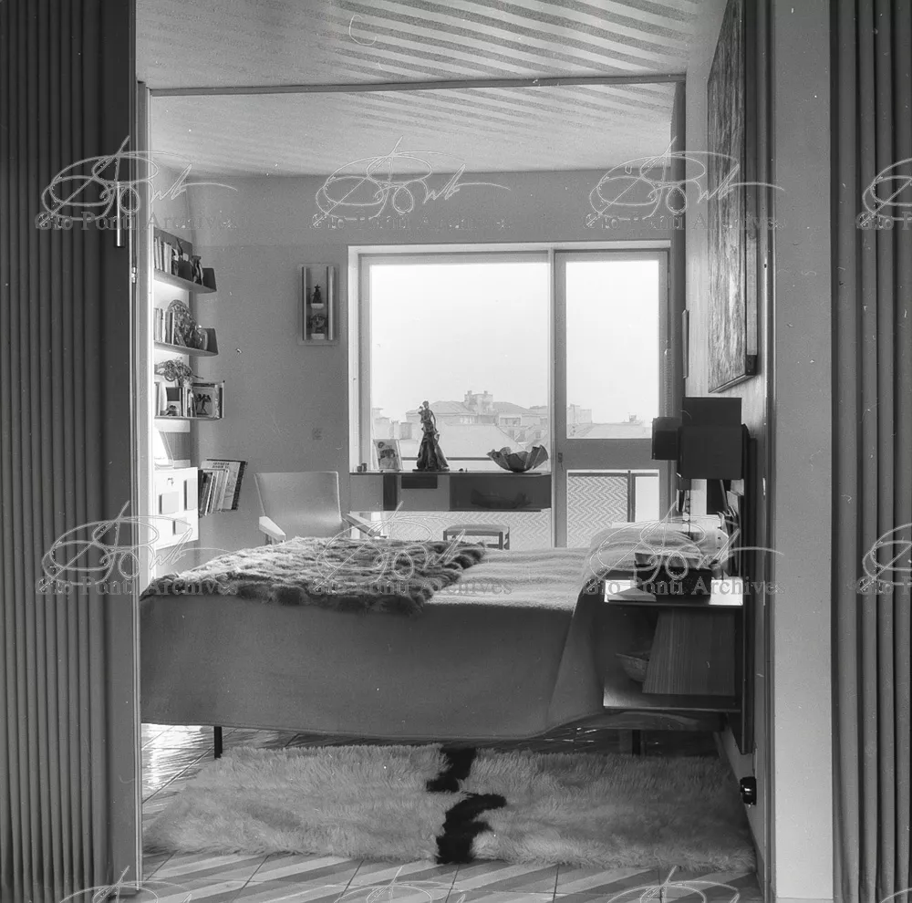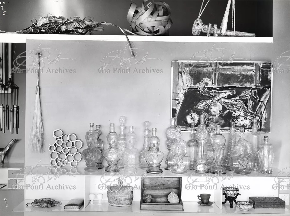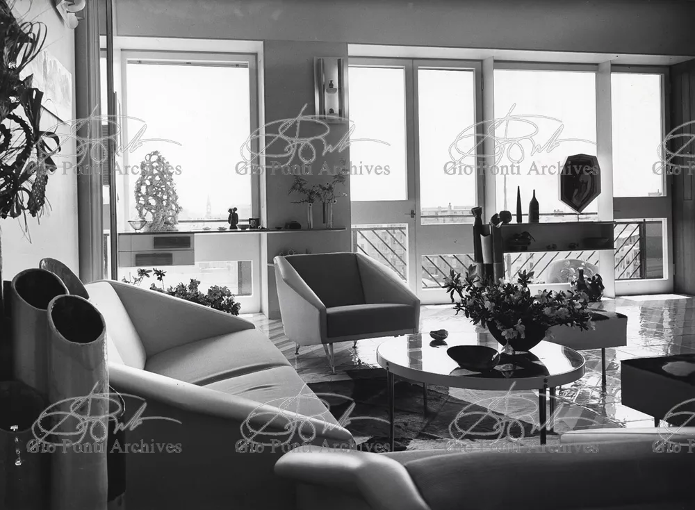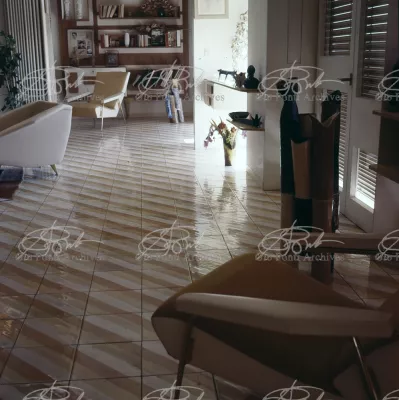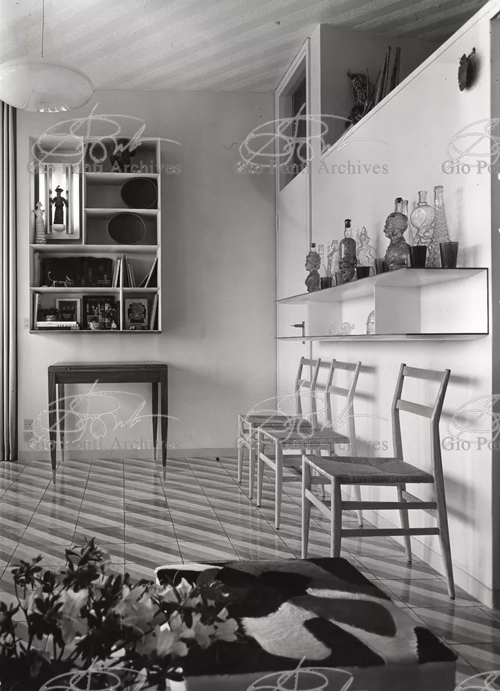The apartment in which Gio Ponti lived, with his family, from 1957 onward (his last house), contains all of the Pontian inventions with regard to layout, walls, furniture, and objects that had appeared during the fifties, and that had originated even earlier. Here they are brought together, for the first time, in a unit and for real: from the open space with sliding walls to the furnished windows, self illuminating furniture, organized wall panels, diagonally striped floor and ceiling, single colour scheme here, white and yellow, identical chairs and beds for the entire apartment, and paintings placed on stands instead of hung on the walls. A demonstration house. And one in which everything came from the same mind and hand.And then the demonstration changed as Ponti's thinking about the house progressed. This highly liveable open space for five people turned into something else when Ponti lived there on his own: a free space in which to roam, amidst growing piles of drawings and paintings. Paintings on perspex too, an idea that Ponti came up with toward the end of his life, paintings to be looked at against the light, like stained-glass windows. At the age of eighty-six, Ponti painted twenty large angels on perspex,and thought about making, with this window painting displayed on every floor, a movable decoration for the whole facade of the apartment building -he was always thinking in festive terms, residents permitting. The facade would have allowed this: a facade of superimposed bands, in which, on every floor, the residents had been allowed to choose their own «outside colour, and even their own pattern of windows. Almost spontaneous architecture, Ponti used to say.