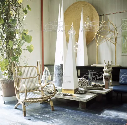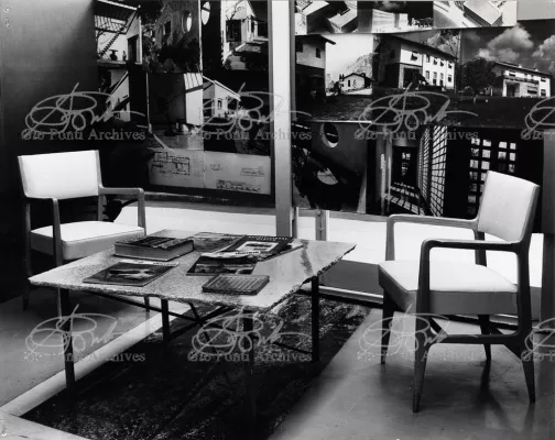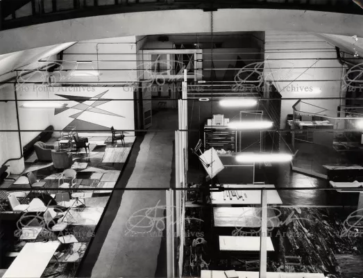 A huge shed, formerly a garage. Gio Ponti turned it into his studio, and everyone went on calling it the shed.In the seventies, when Ponti had begun to refer to all his designs as forms (form for an automobile, form for a museum, form for a cathedral he might have called this crowded shed a form for a studio. This open space measuring 15 by 45 meters fully embodied his idea of an architectural studio the Studio Ponti Fornaroli Rosselli that was also a workshop, a training ground for young people guests and students from all over the world, a place for the display of new materials and designs -indeed, furnished with just these materials and designs, and an exhibition site. For years, the shed was also where the editorial staff of Domus two people worked. And it was even used for family weddings and parties. It was well suited to Ponti's delight in living and working without secrets. His house had movable walls, his studio had no partitions.