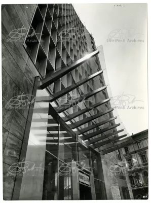 Ponti used the same solution for the wings of the second building as he did for the first. To the front he gave a contrasting design. Since this front was only slightly taller than the wings of the neighbouring building, with their strong motif, only a slender pattern extending over the whole facade could give it a different and acceptable scale. This slender pattern changes spectacularly according to the point of view of the observer, shifting from all glass frontal view to all aluminium side view. Yet in the second Montecatini building, as in the first, it is not the front that grabs your attention: here it is the back or rear facade, with its fine pattern of diamond-shaped surfaces.