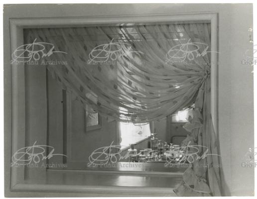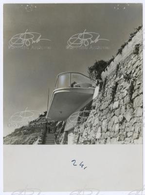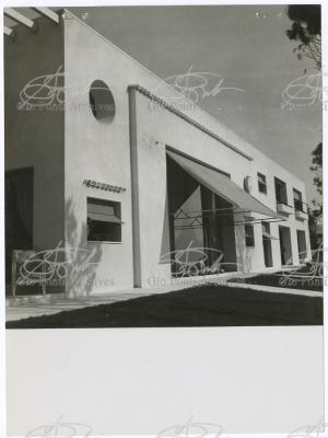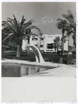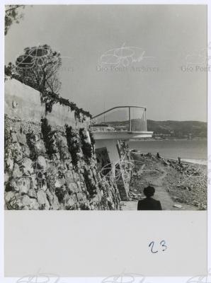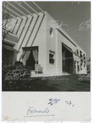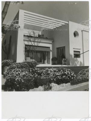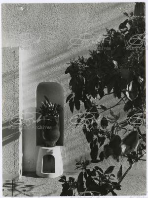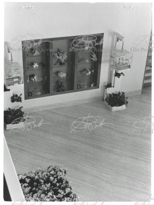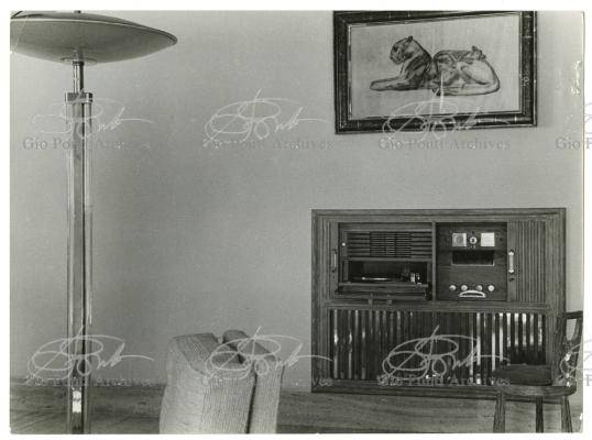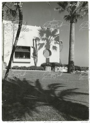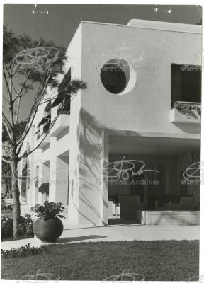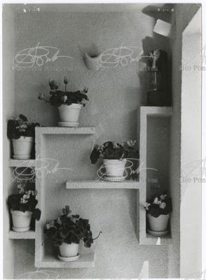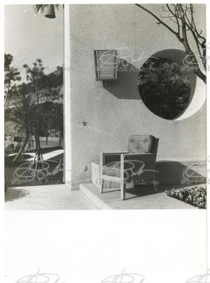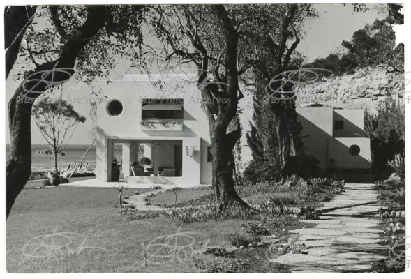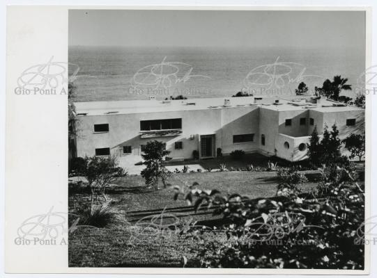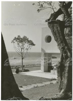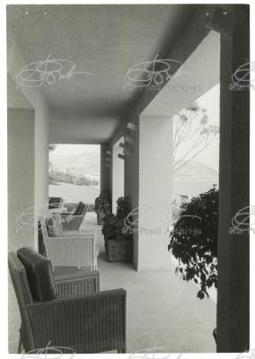 White walls under the sun. A pattern of planes designed for the play of light. The central living-room is two stories high and contains the staircase a favourite motif of Ponti's. The patio at the front is two stories high, and contains the volume of the dining-room one story high, covered by a solarium with masonry beds. The apertures all look like cuts in the wall the window panes have no frame. The doors are all sliding ones. White walls, and a white tiled roof.