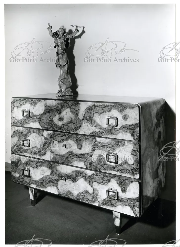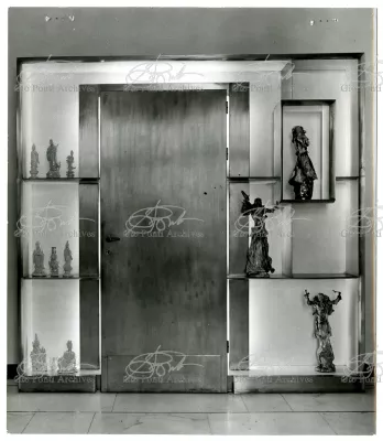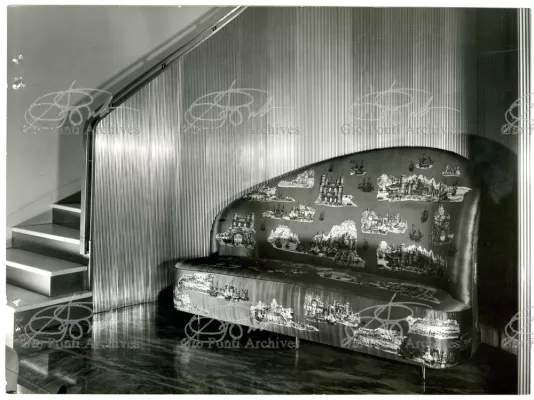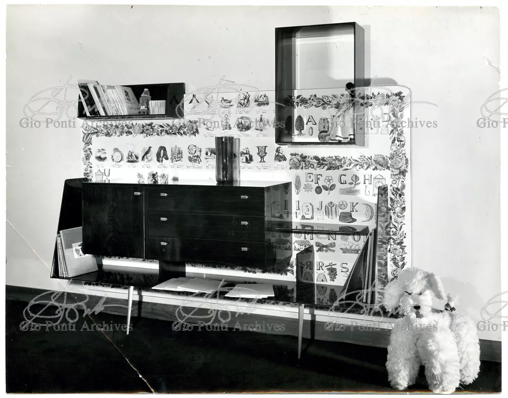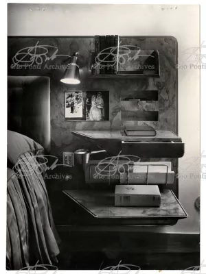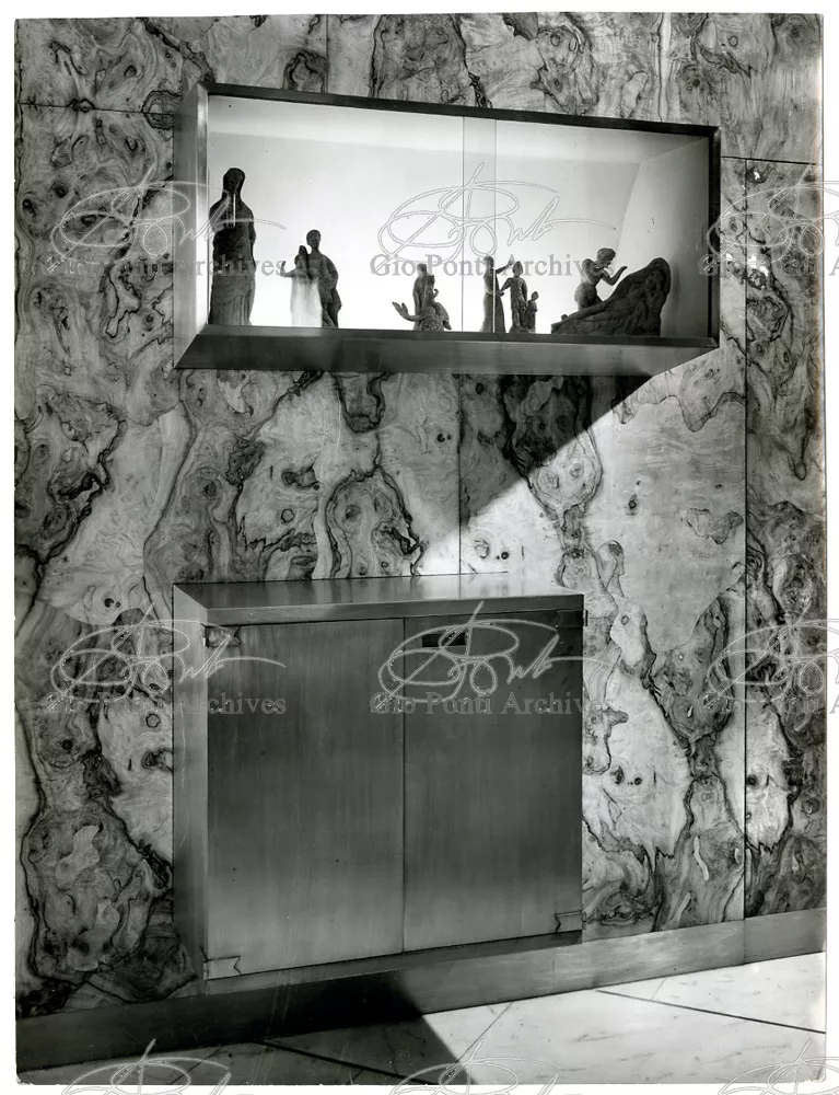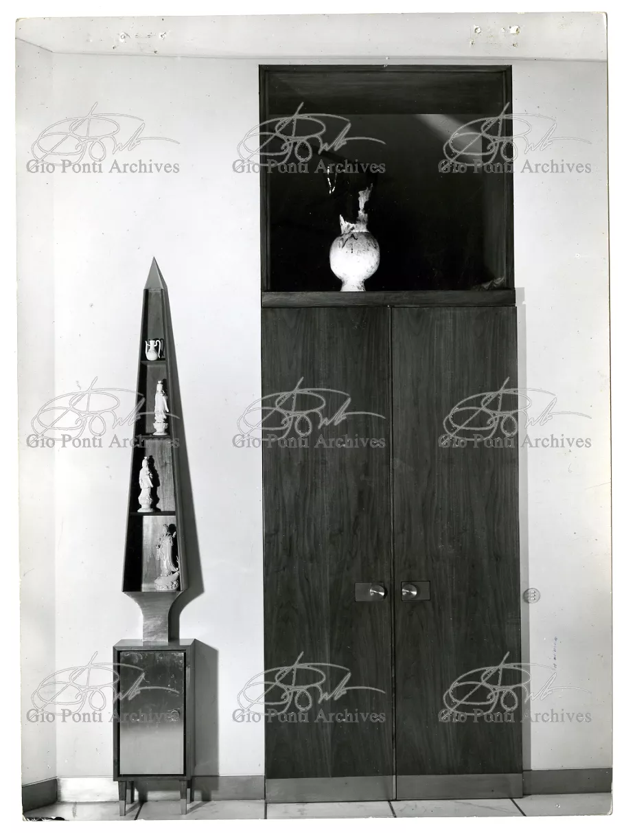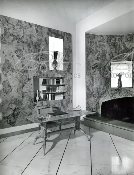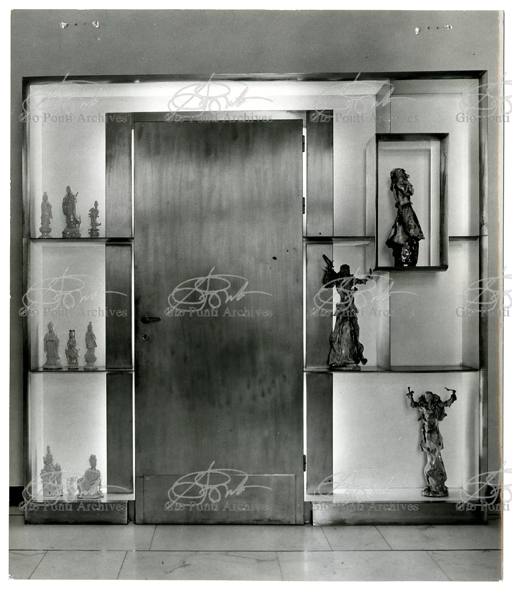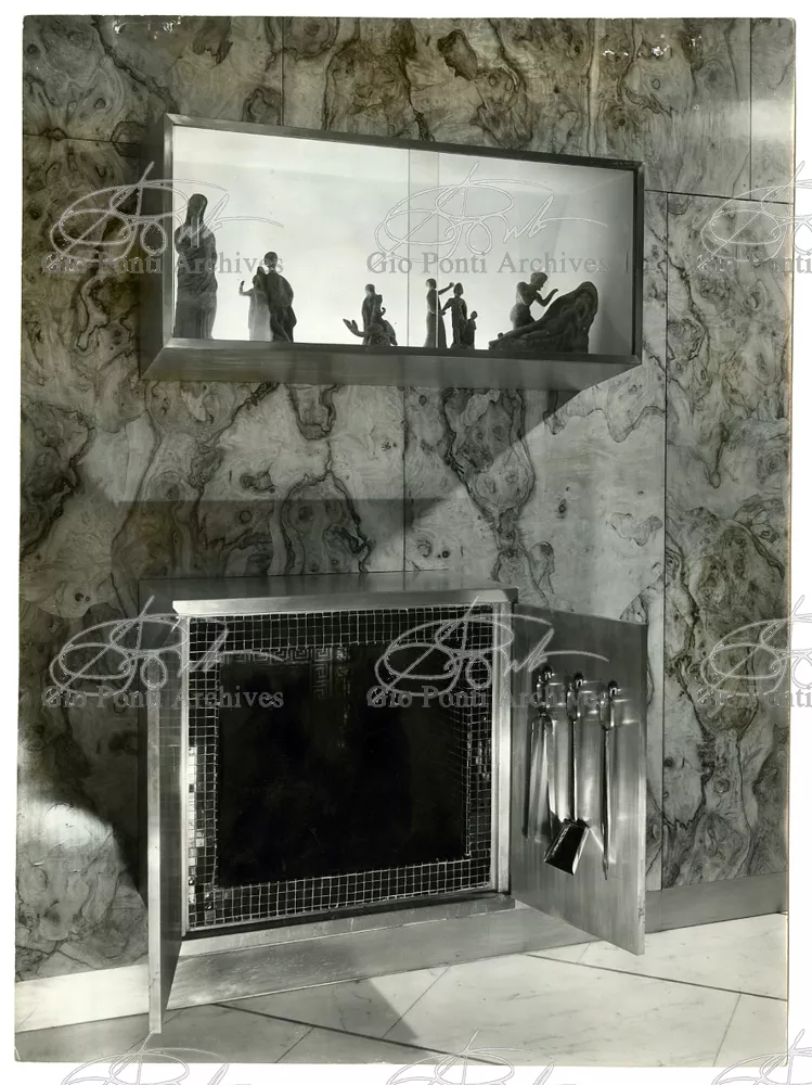 Qui il divertimento è nelle forme e anche nelle sorprese: il camino, chiuso, appare come un puro volume di ottone, a sbalzo dalla parete; le vetrine, a sbalzo o in nicchia, hanno fondale curvo, luminoso: la parete interna in radica che le contiene è già una parete organizzata.