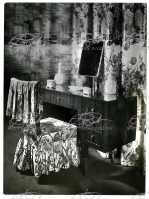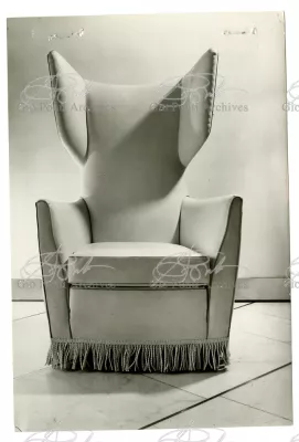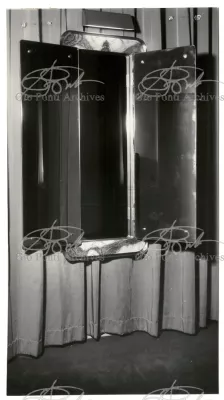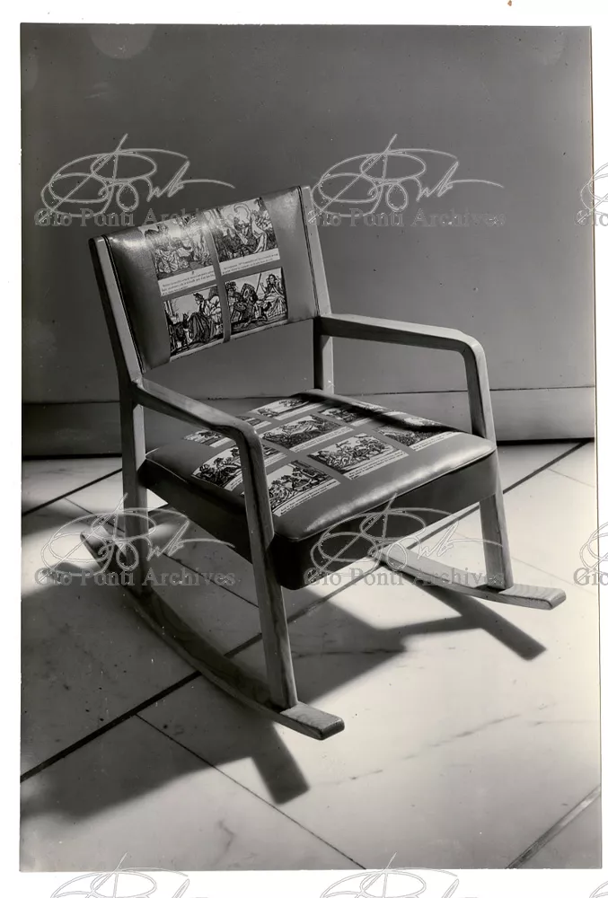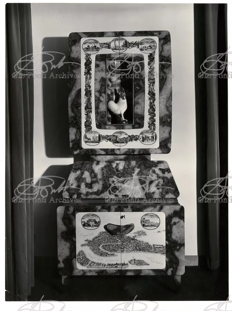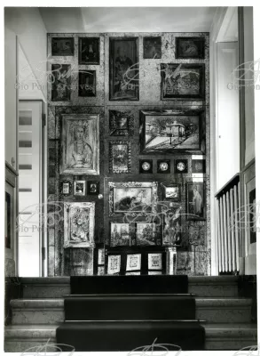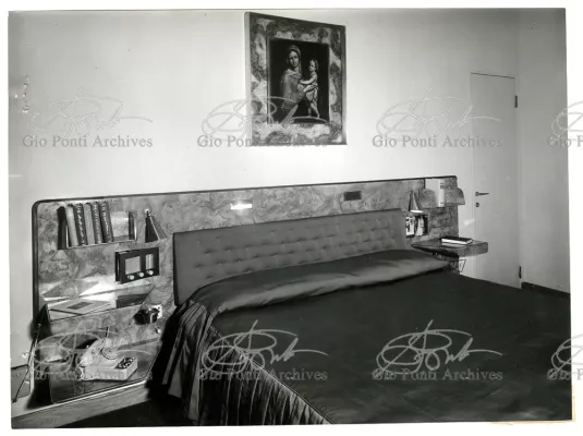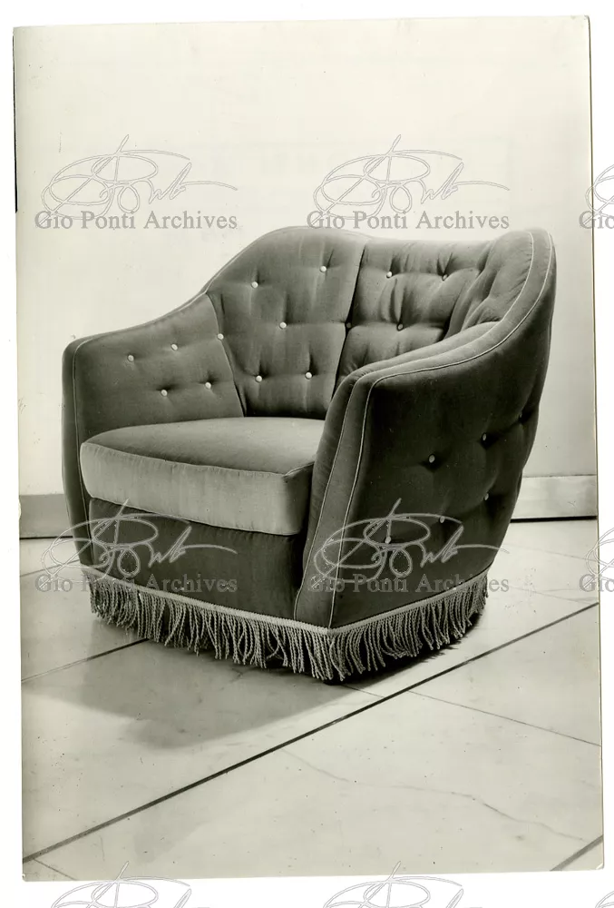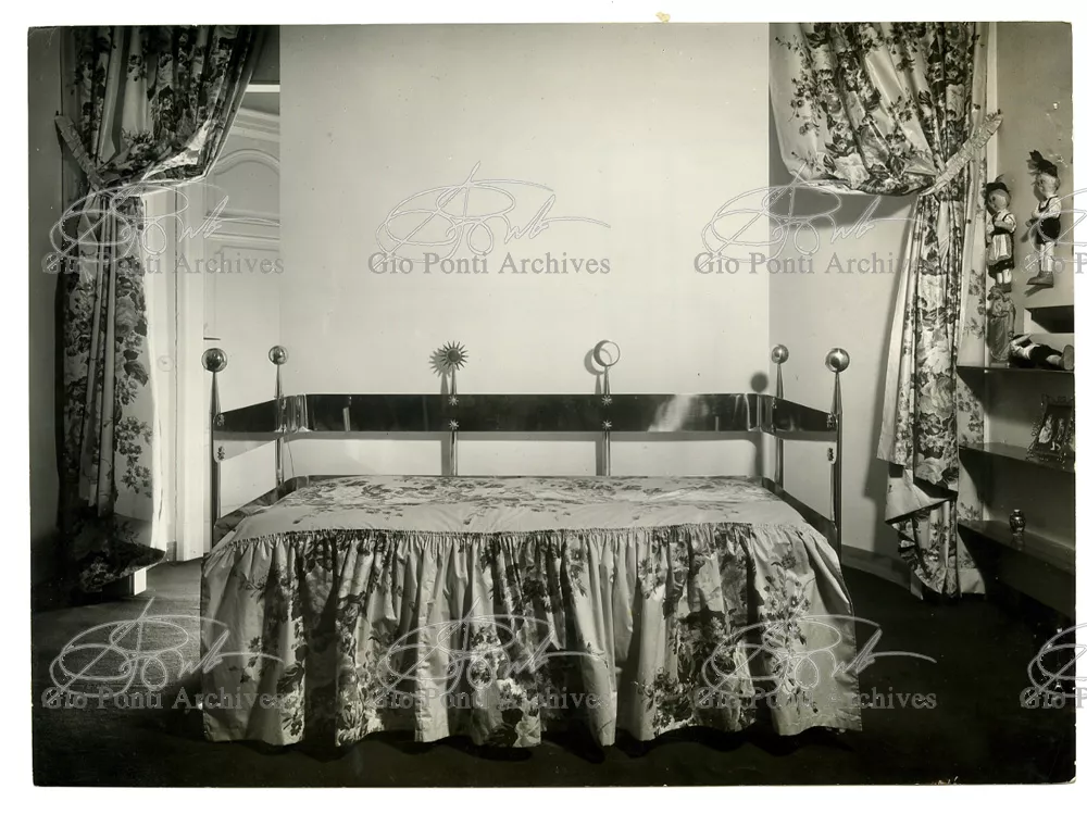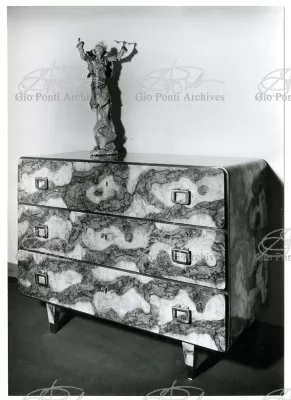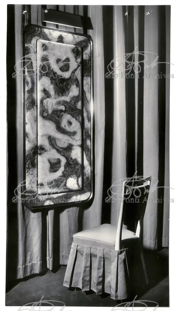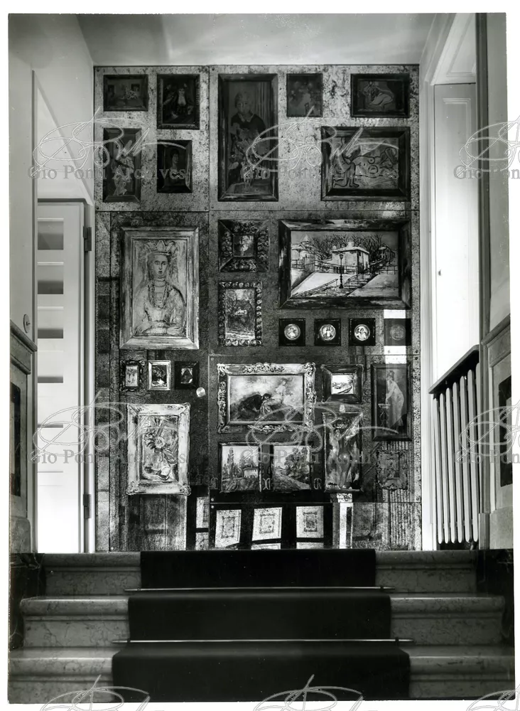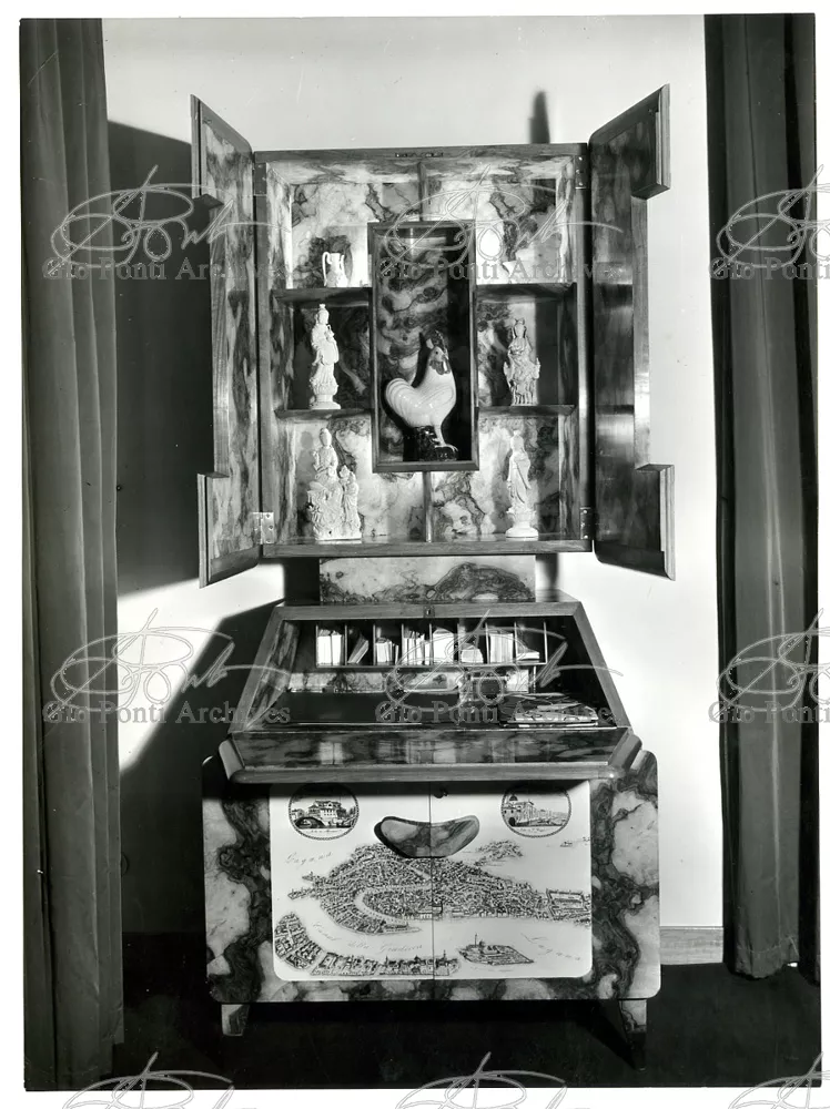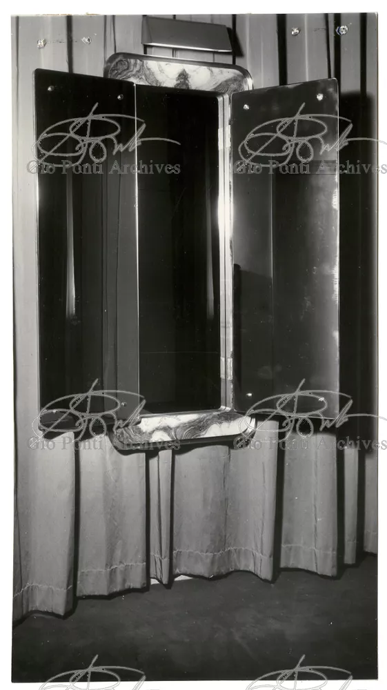 Qui il divertimento è nelle forme e anche nelle sorprese: il camino, chiuso, appare come un puro volume di ottone, a sbalzo dalla parete; le vetrine, a sbalzo o in nicchia, hanno fondale curvo, luminoso: la parete interna in radica che le contiene è già una parete organizzata.