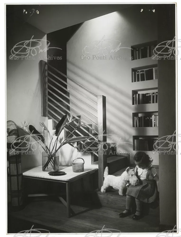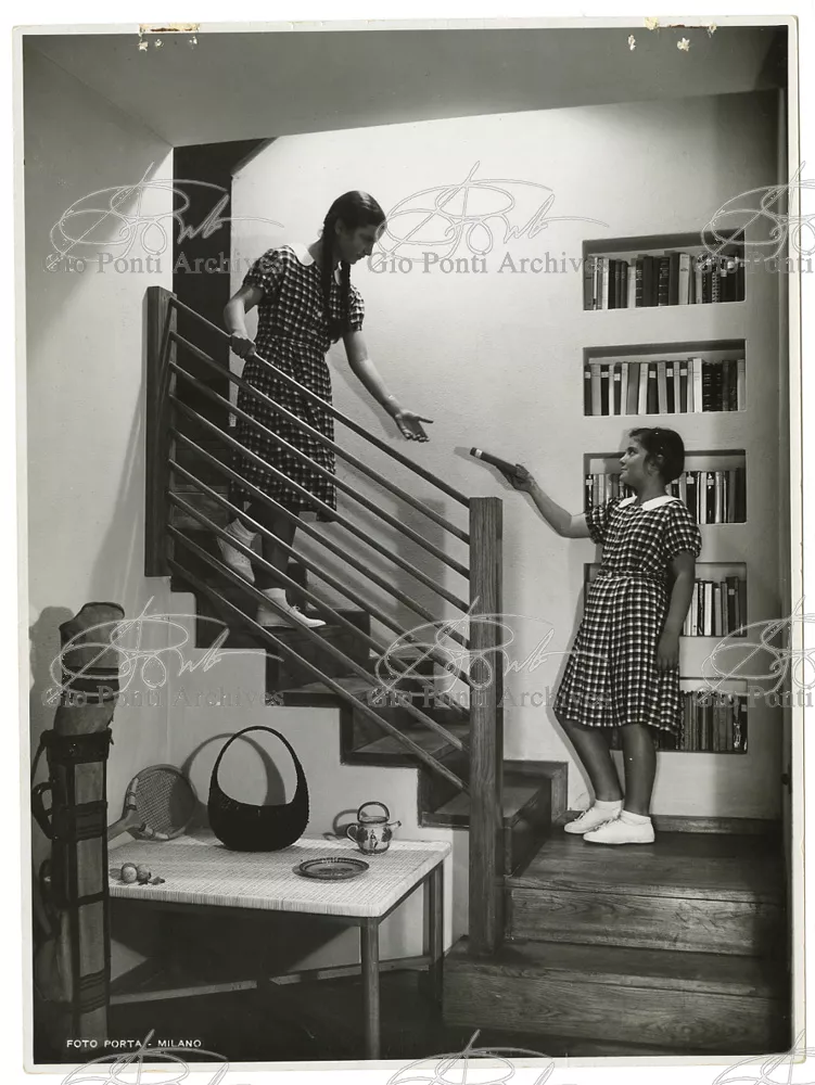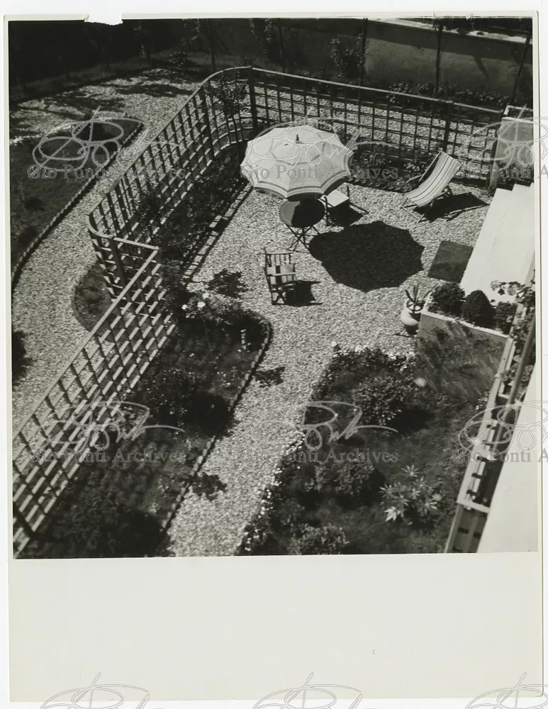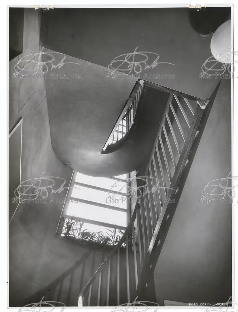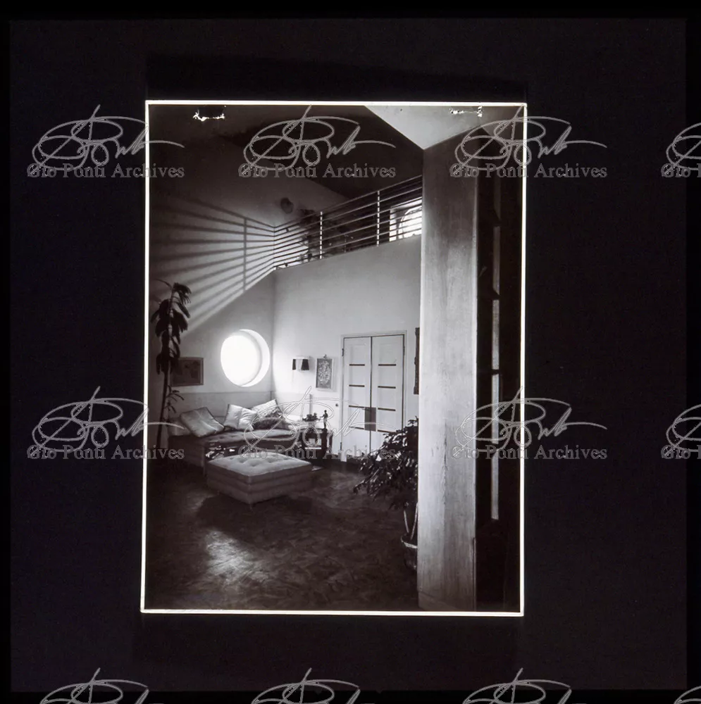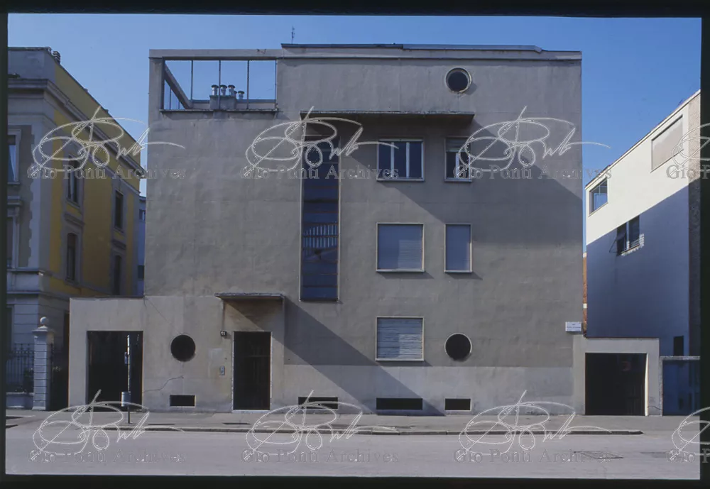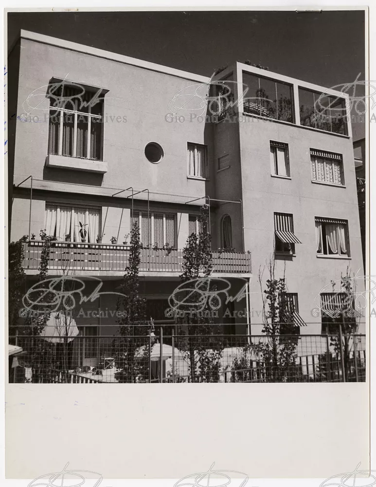 La più dimostrativa delle case di Gio Ponti in questi anni è quella da lui abitata, dal '36 al ‘43, la casa Laporte in via Brin 12. Io sono con Cocteau quando dice che il nuovo non è nella nuova forma per esprimere una cosa ma nel nuovo modo di pensarla. Qui, il nuovo modo di pensare la casa (e, nello stesso tempo, di conservare la casa, cioè il piacere di abitare la casa) si esprime anzitutto nel grande ambiente centrale alto due piani, su cui si affaccia il giardino d'inverno (gioco di visuali: vista dall'alto la figura umana trova inquadrature felici; si esprime nell'analogo grande terrazzo sul tetto, una sala col cielo per soffitto, chiusa fra muri, abitata per molte ore al giorno e per molti giorni (e vestiario, calzature, abitudini degli abitanti derivano dal lungo soggiornare in questo patio, in sandali e costume); si esprime nell'idea della libreria in ogni stanza, libreria inclusa nella costruzione; e nell'uso dei bellissimi materiali poveri, linoleum, canapa, legno, vimini, faesite. Mediterraneo e Vienna. Ho imparato da Wlach. (È di Wlach, forse, l'idea del tavolo da pranzo bassissimo, circondato da poltroncine imbottite e non da rigide sedie...) L'appartamento abitato da Gio Ponti e dai suoi appartiene ad una villa a tre appartamenti. Verso strada la villa ha un fronte chiuso e piano (senza rilievi, col solo sbalzo di due pensiline lineari), verso giardino ha un fronte aperto e movimentato nei volumi, con pergole e terrazze.
