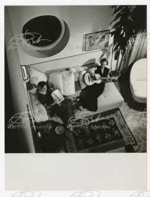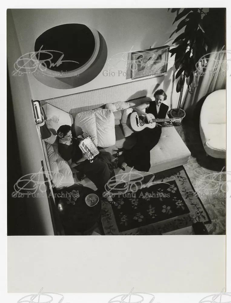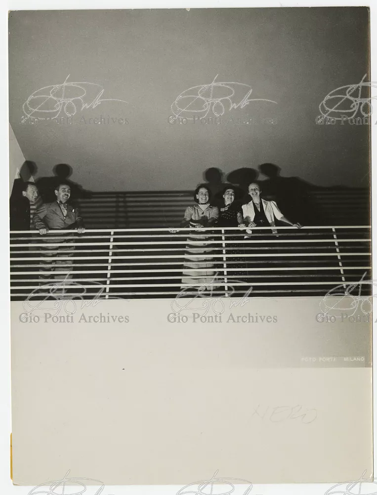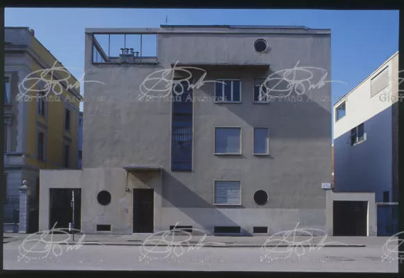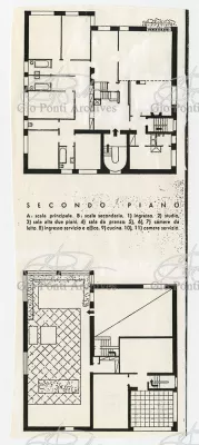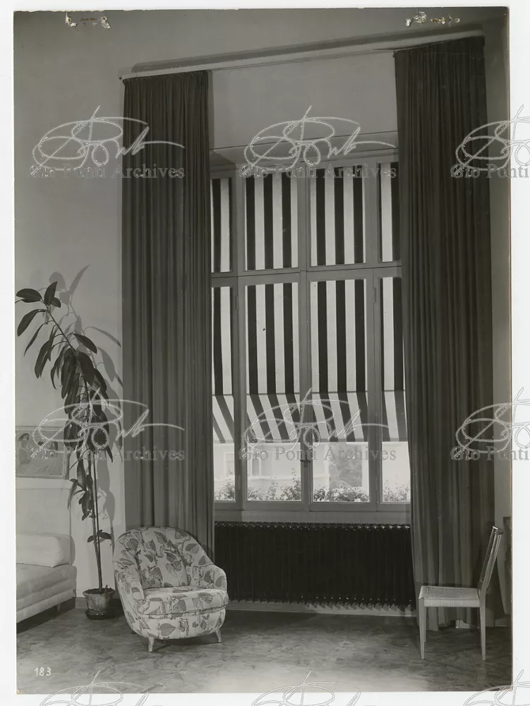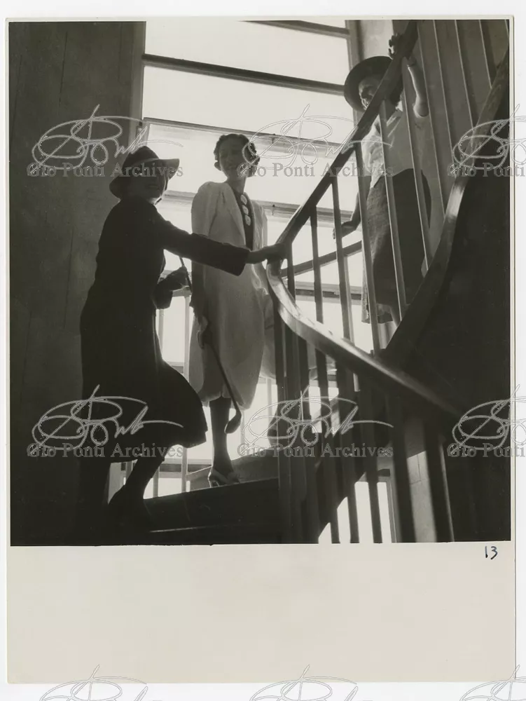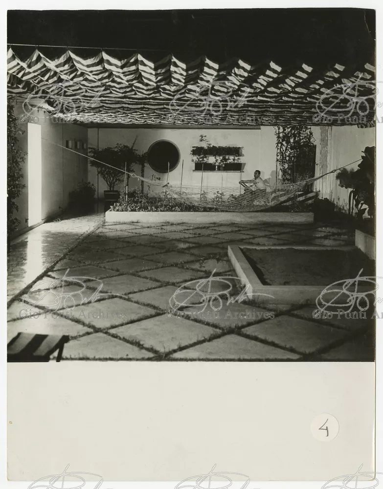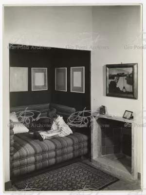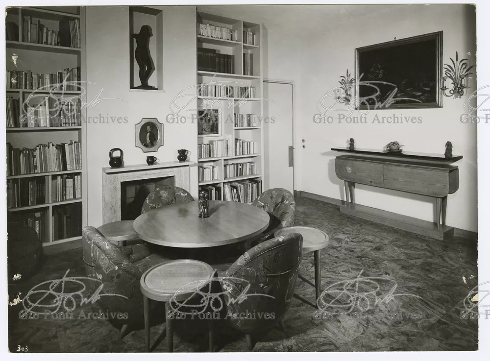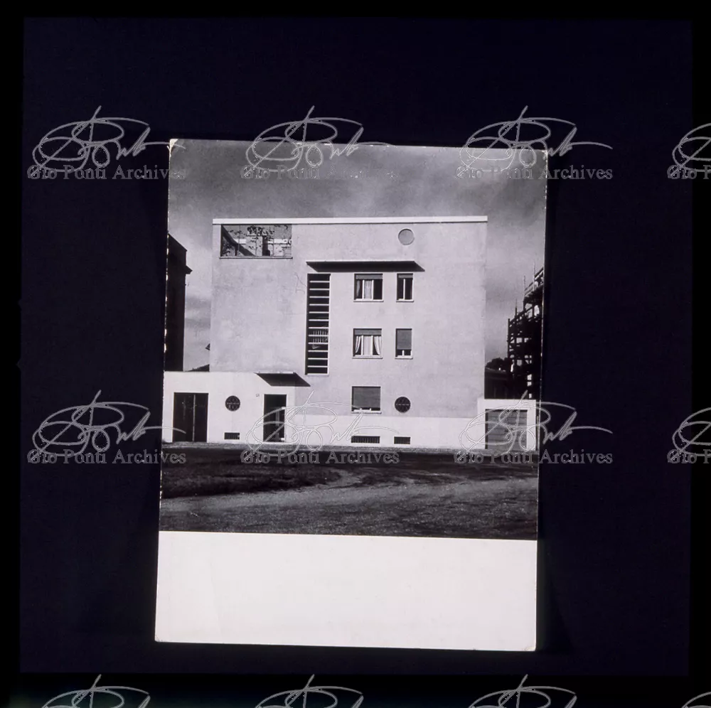 La più dimostrativa delle case di Gio Ponti in questi anni è quella da lui abitata, dal '36 al ‘43, la casa Laporte in via Brin 12. Io sono con Cocteau quando dice che il nuovo non è nella nuova forma per esprimere una cosa ma nel nuovo modo di pensarla. Qui, il nuovo modo di pensare la casa (e, nello stesso tempo, di conservare la casa, cioè il piacere di abitare la casa) si esprime anzitutto nel grande ambiente centrale alto due piani, su cui si affaccia il giardino d'inverno (gioco di visuali: vista dall'alto la figura umana trova inquadrature felici; si esprime nell'analogo grande terrazzo sul tetto, una sala col cielo per soffitto, chiusa fra muri, abitata per molte ore al giorno e per molti giorni (e vestiario, calzature, abitudini degli abitanti derivano dal lungo soggiornare in questo patio, in sandali e costume); si esprime nell'idea della libreria in ogni stanza, libreria inclusa nella costruzione; e nell'uso dei bellissimi materiali poveri, linoleum, canapa, legno, vimini, faesite. Mediterraneo e Vienna. Ho imparato da Wlach. (È di Wlach, forse, l'idea del tavolo da pranzo bassissimo, circondato da poltroncine imbottite e non da rigide sedie...) L'appartamento abitato da Gio Ponti e dai suoi appartiene ad una villa a tre appartamenti. Verso strada la villa ha un fronte chiuso e piano (senza rilievi, col solo sbalzo di due pensiline lineari), verso giardino ha un fronte aperto e movimentato nei volumi, con pergole e terrazze.