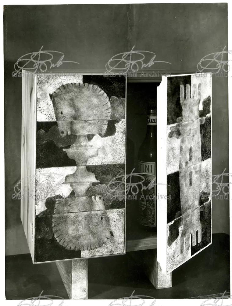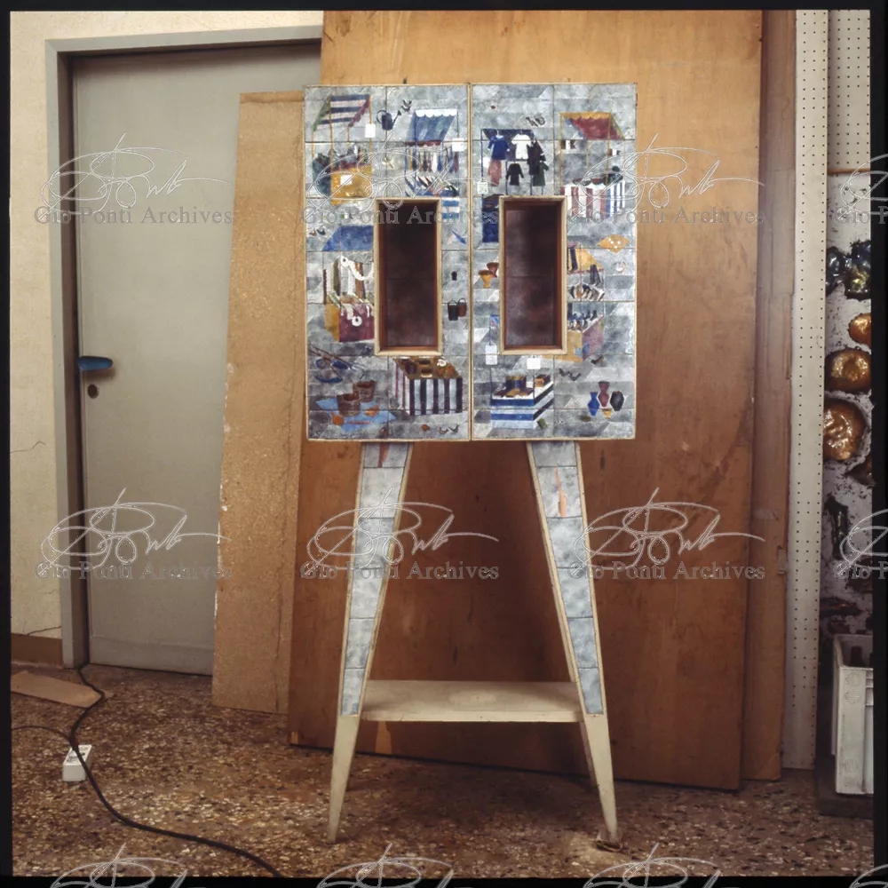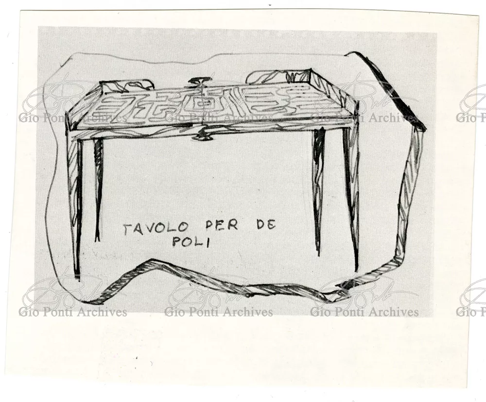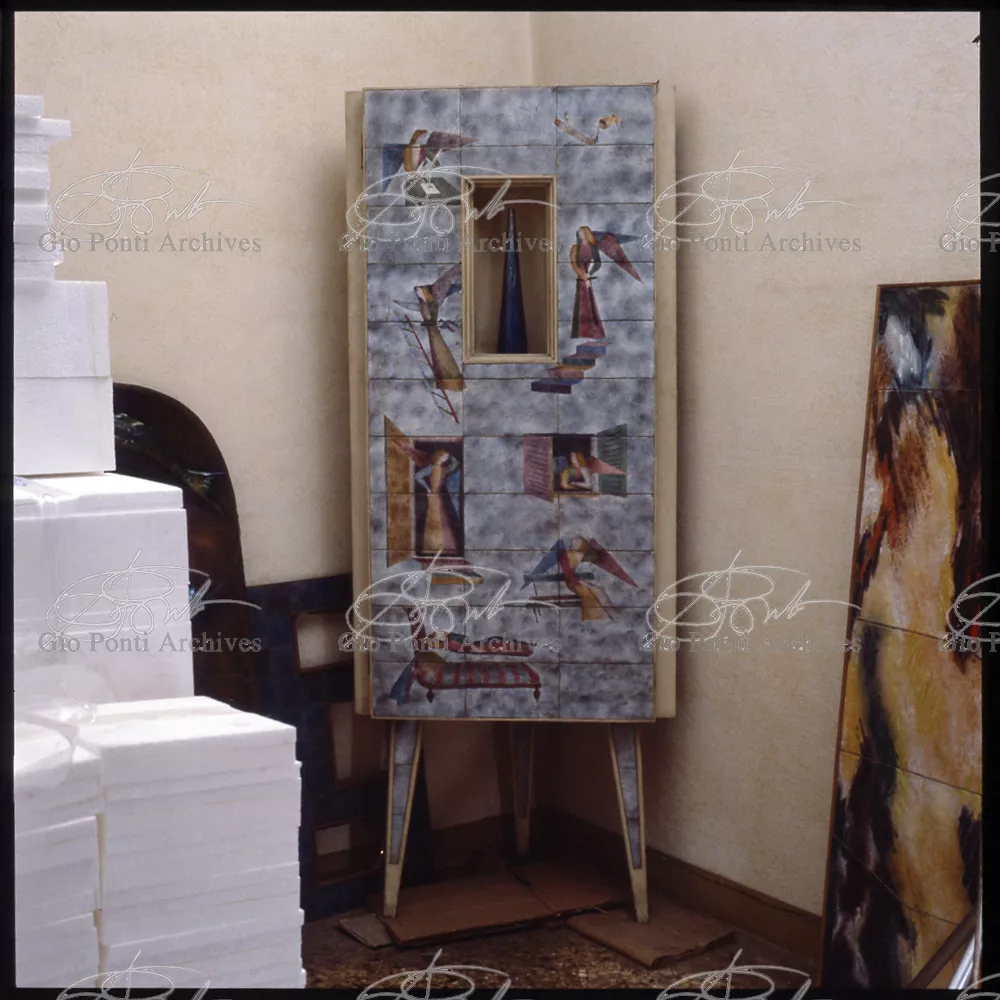 I mobili che piacquero a De Pisis e a Daria Guarnati sono un momento luminoso della lunga collaborazione fra Gio Ponti e Paolo De Poli, il maestro dello smalto su rame, anzi il fondatore moderno di quest'arte in Italia, già nel 1933. La collaborazione cominciò nel 40 con i pannelli disegnati da Gio Ponti e realizzati da De Poli per le sale del rettorato all'Università di Padova, proseguendo poi con altri pannelli, alcuni grandissimi, per i transatlantici di cui Ponti curò gli interni, dal Conte Grande al Conte Biancamano. E avrà nuovi episodi nel '56. Con De Poli, Ponti, il più antico designer italiano poteva continuare nel suo perenne divertimento e gioco con le arti.