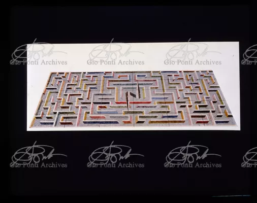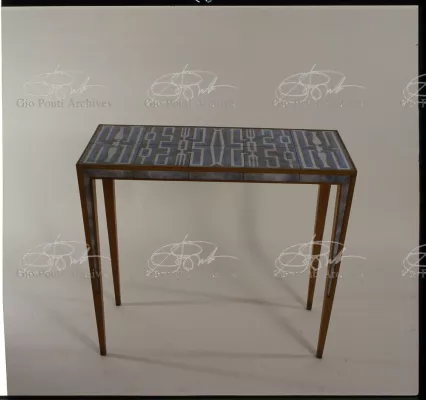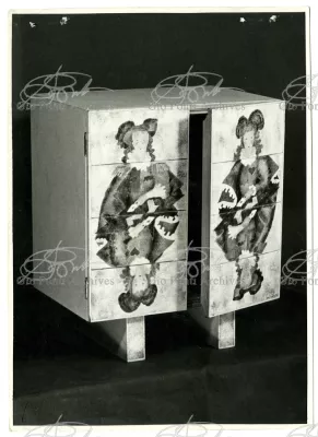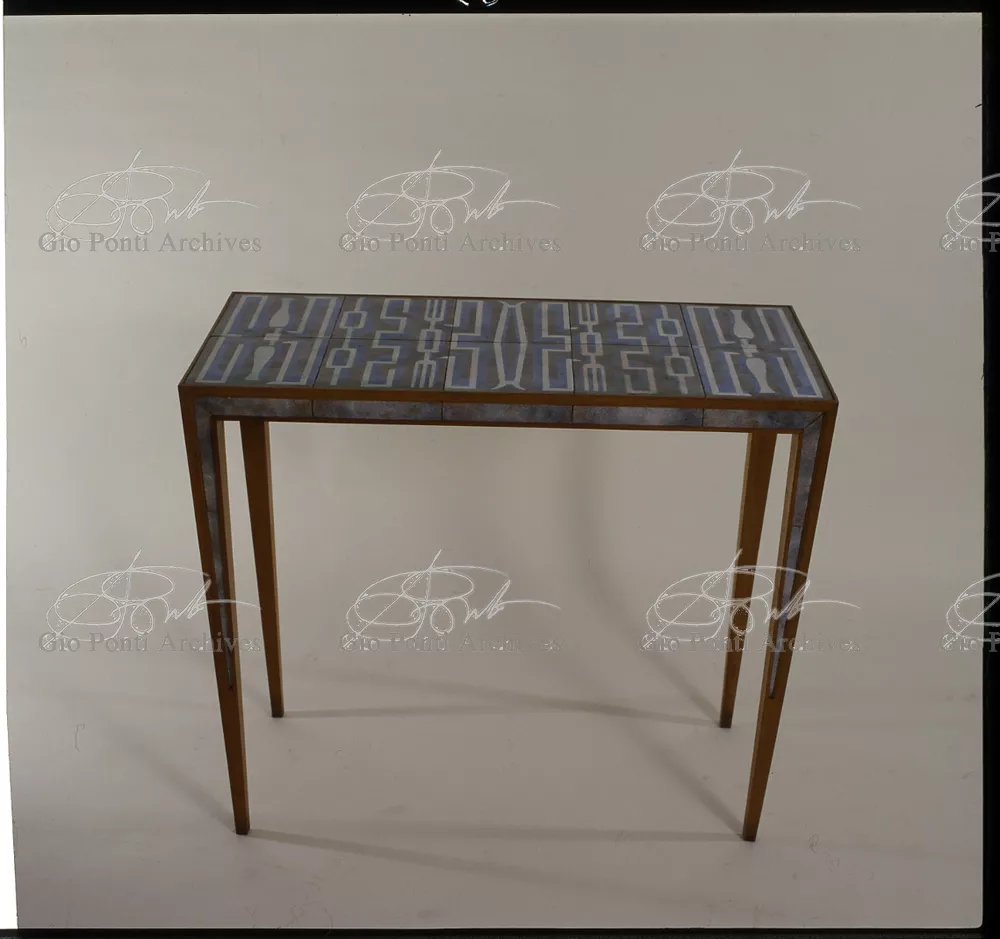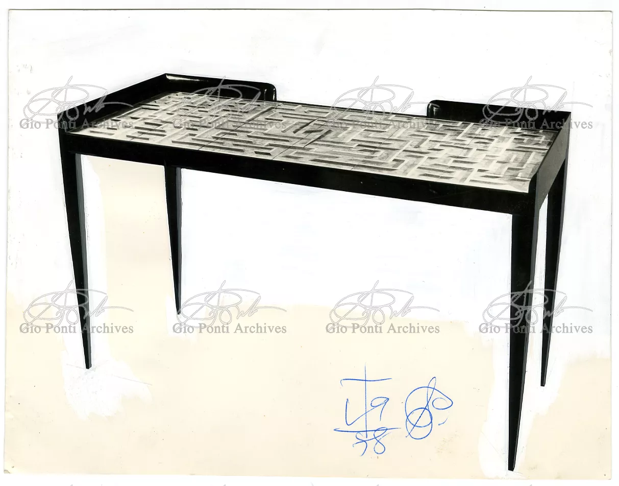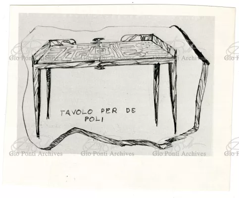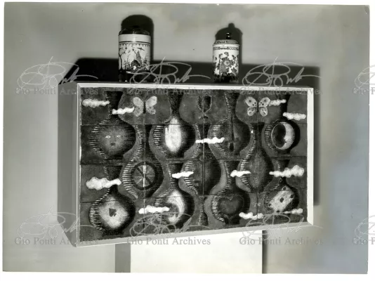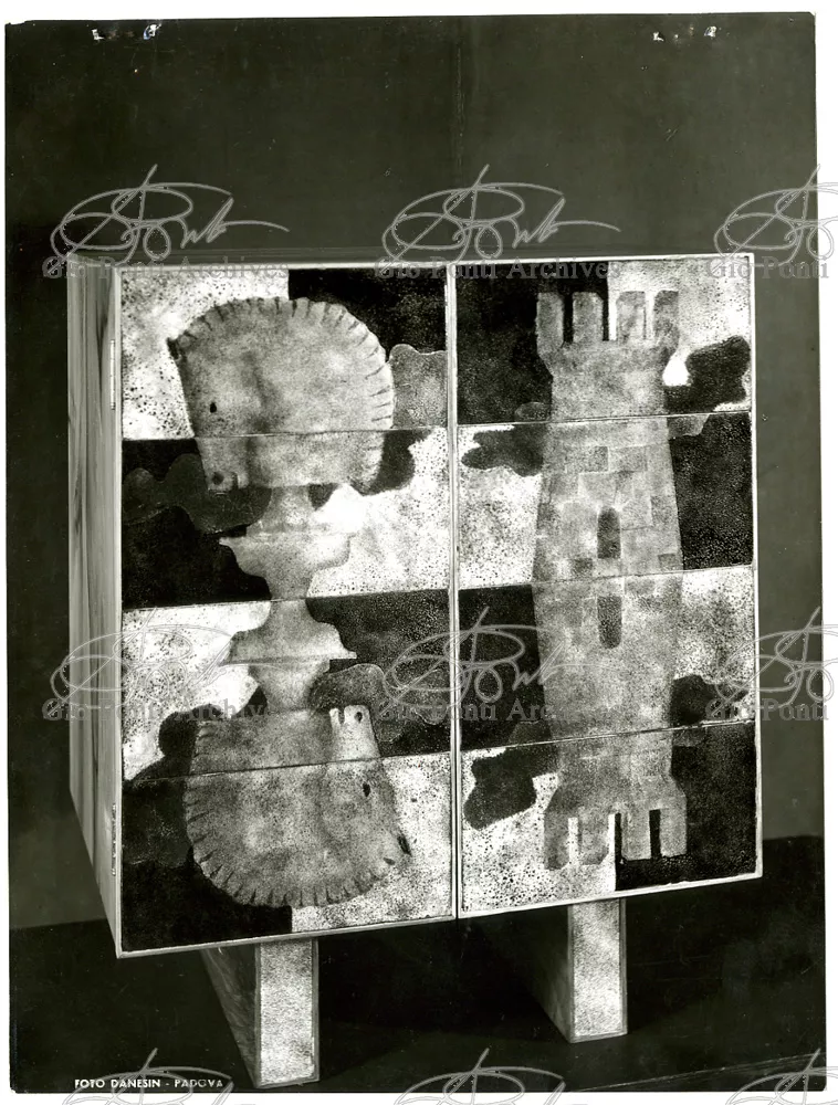 I mobili che piacquero a De Pisis e a Daria Guarnati sono un momento luminoso della lunga collaborazione fra Gio Ponti e Paolo De Poli, il maestro dello smalto su rame, anzi il fondatore moderno di quest'arte in Italia, già nel 1933. La collaborazione cominciò nel 40 con i pannelli disegnati da Gio Ponti e realizzati da De Poli per le sale del rettorato all'Università di Padova, proseguendo poi con altri pannelli, alcuni grandissimi, per i transatlantici di cui Ponti curò gli interni, dal Conte Grande al Conte Biancamano. E avrà nuovi episodi nel '56. Con De Poli, Ponti, il più antico designer italiano poteva continuare nel suo perenne divertimento e gioco con le arti.