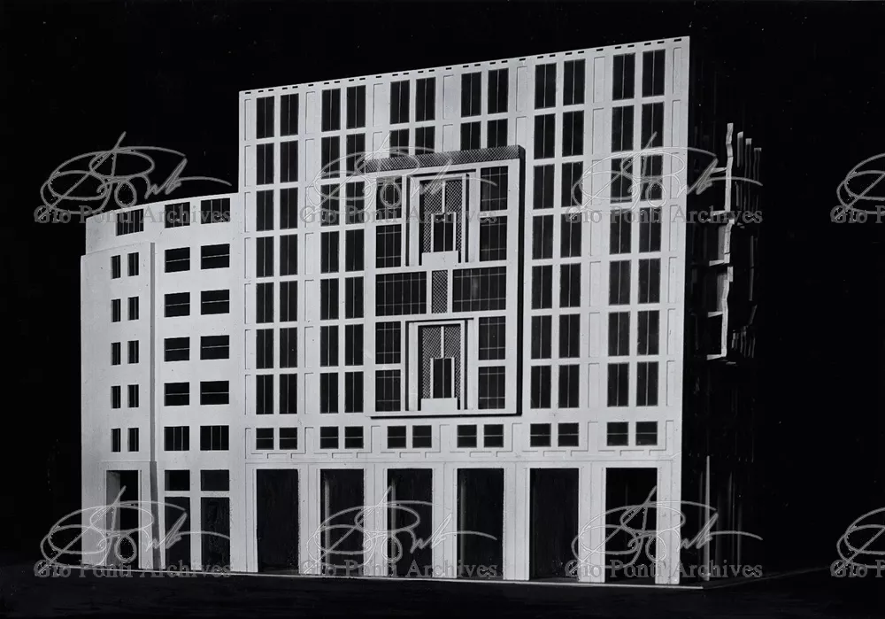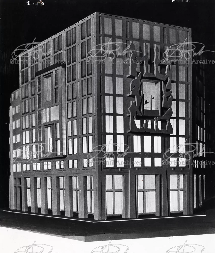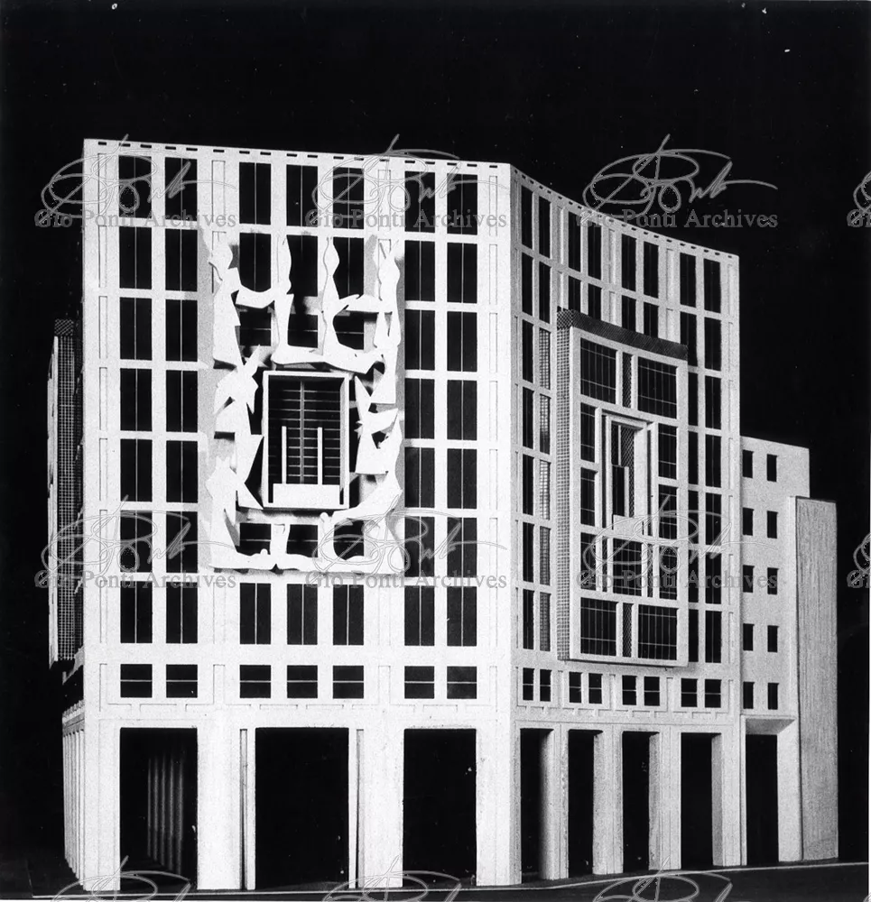 In piazza San Babila, a Milano, si affacciano i grandi palazzi progettati da Ponti con De Min, Rimini, Casalis nel '39;' ma non vi si affacciò il palazzo cui Ponti teneva di più (lo pubblicò in modello), quello in cui aveva potuto portare ad espressione due predilette idee: la necessaria presenza, in un organismo architettonico, di ambienti fuori scala, e la necessità di rivelarli in facciata. Qui (parliamo del progetto, ineseguito, per il Palazzo Marzotto, in collaborazione con Francesco Bonfanti) in ognuna delle tre facciate il ritmo delle finestre normali degli ambienti normali è interrotto dal grande motivo delle finestre speciali degli ambienti speciali (alti due piani). Architettura composita. Non solo: per la facciata centrale Ponti propone, come fuori scala, la presenza di una grande scultura. Pensa a un'opera di scultura autonoma, issata a sbalzo su mensole in facciata, sospesa. Potrebbe essere un'aerea figurazione di Arturo Martini, alta 17 metri, larga 10, fusa in alluminio, illuminata la notte. -