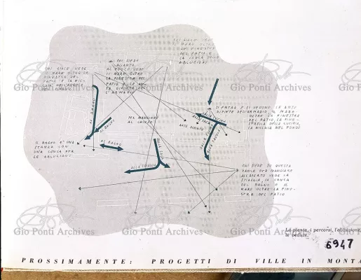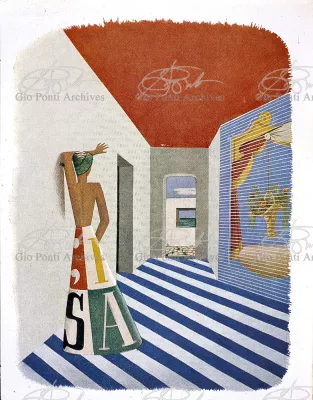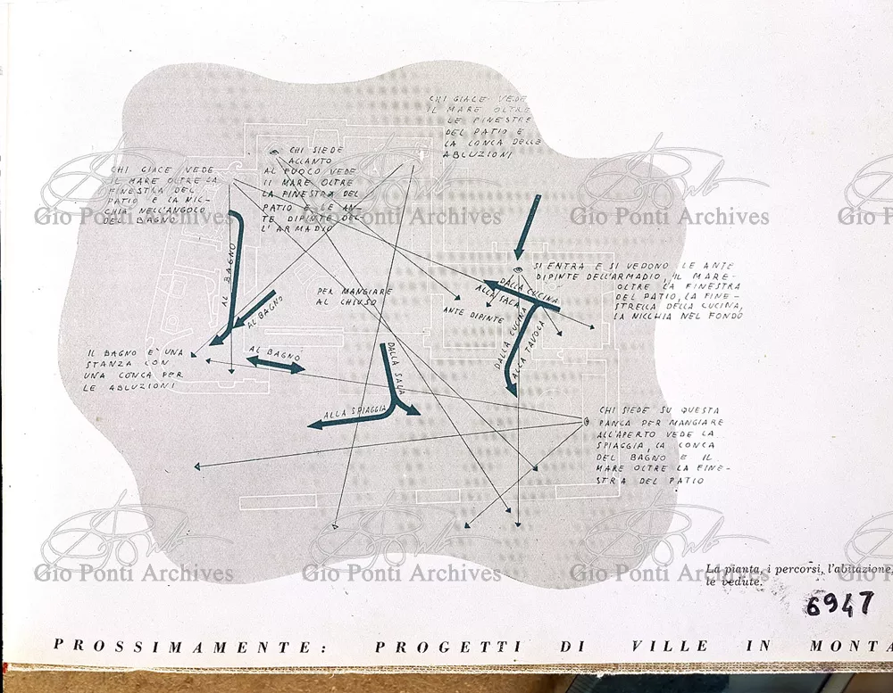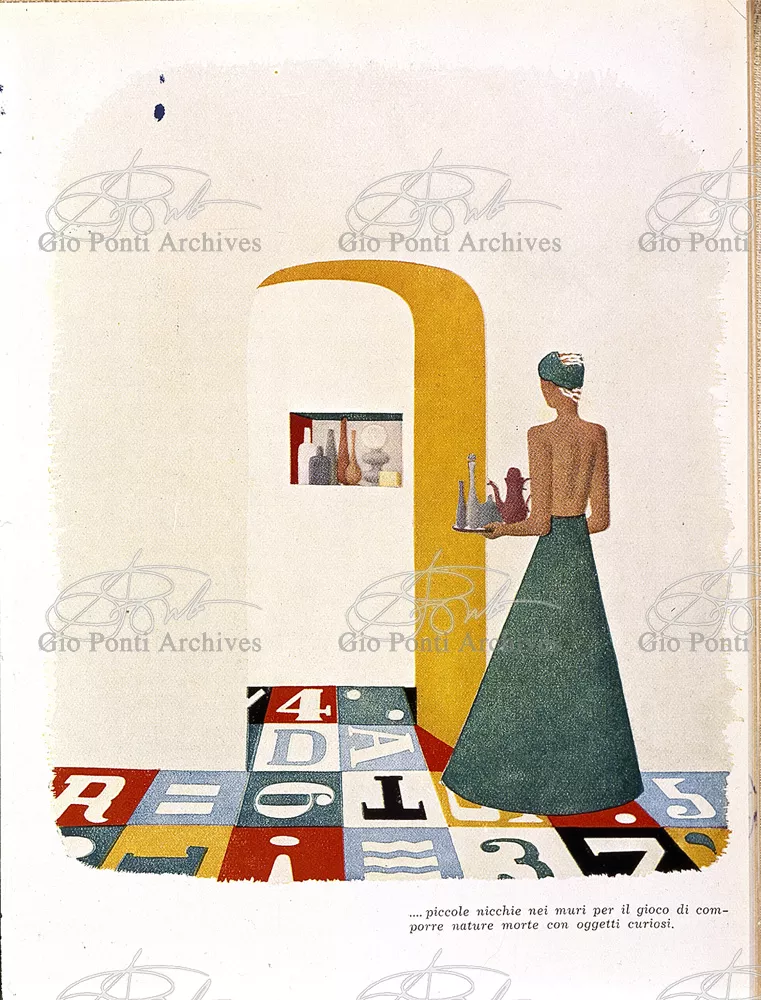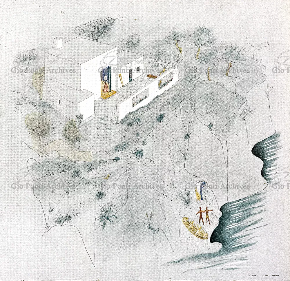 Moltissimi sono i progetti di immaginarie piccole case al mare che Gio Ponti offre in questi anni, nelle pagine di Domus (e poi in quelle di Stile); piccoli teatri per i movimenti e i riposi delle felici figure umane che vi si aggirano; le pareti di muro sono quinte, scenario è il pavimento, colorato, in ceramica.