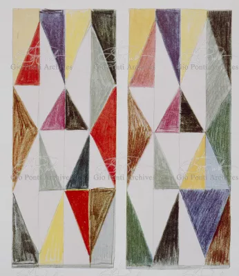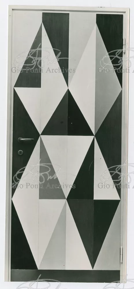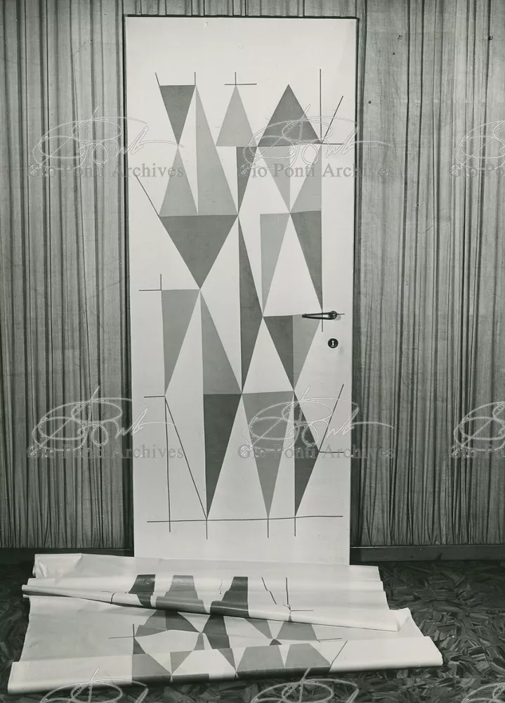 Ponti parte dall'idea della porta dipinta, un quadro-porta, Perché le porte non possono essere un partito espressivo, nell'ambiente? e arriva all'idea di stampare su stoffa un disegno a misura di porta, e, produrlo in metri e metri di stoffa, per porte e porte. Con la Jsa di Busto.