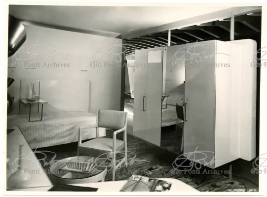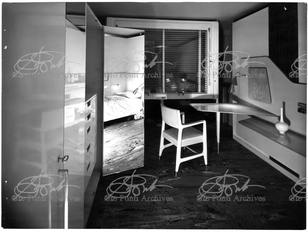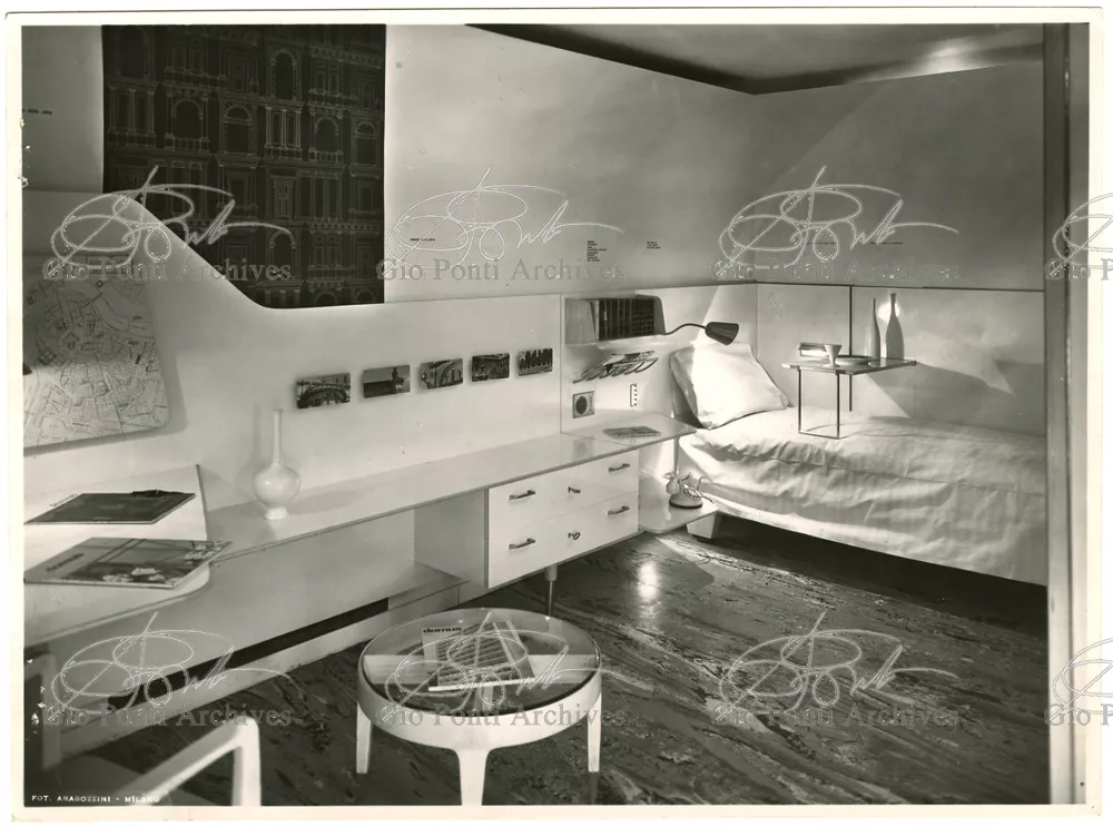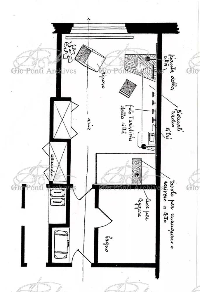 Si osservi, sopra il letto, il tavolino a ribalta è bello poter mangiare stando a letto, e sopra il piano di scrittura la mappa della città (è bello poter sapere dove si è). Autore: Gio Ponti, con la collaborazione di Aldo De Ambrosis.