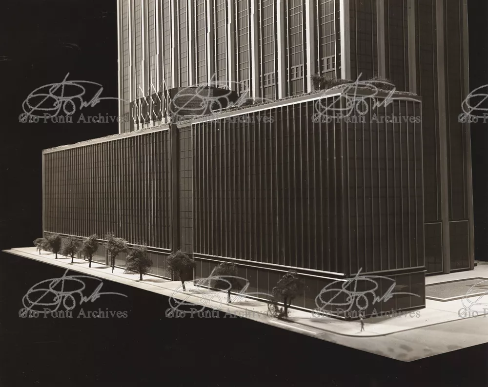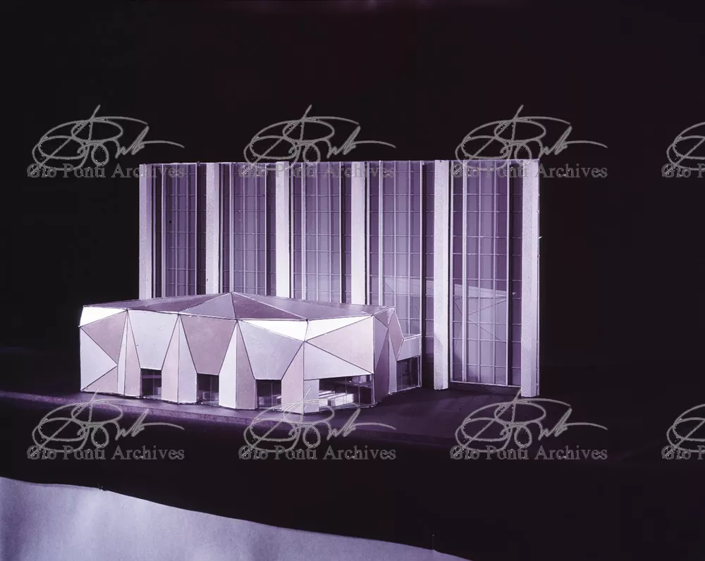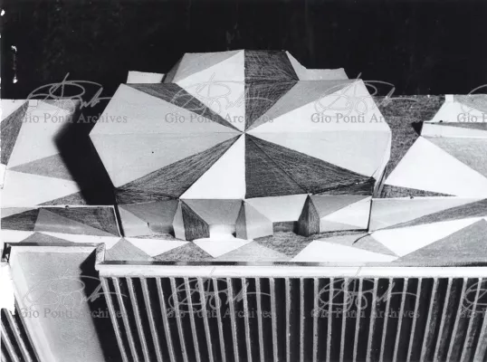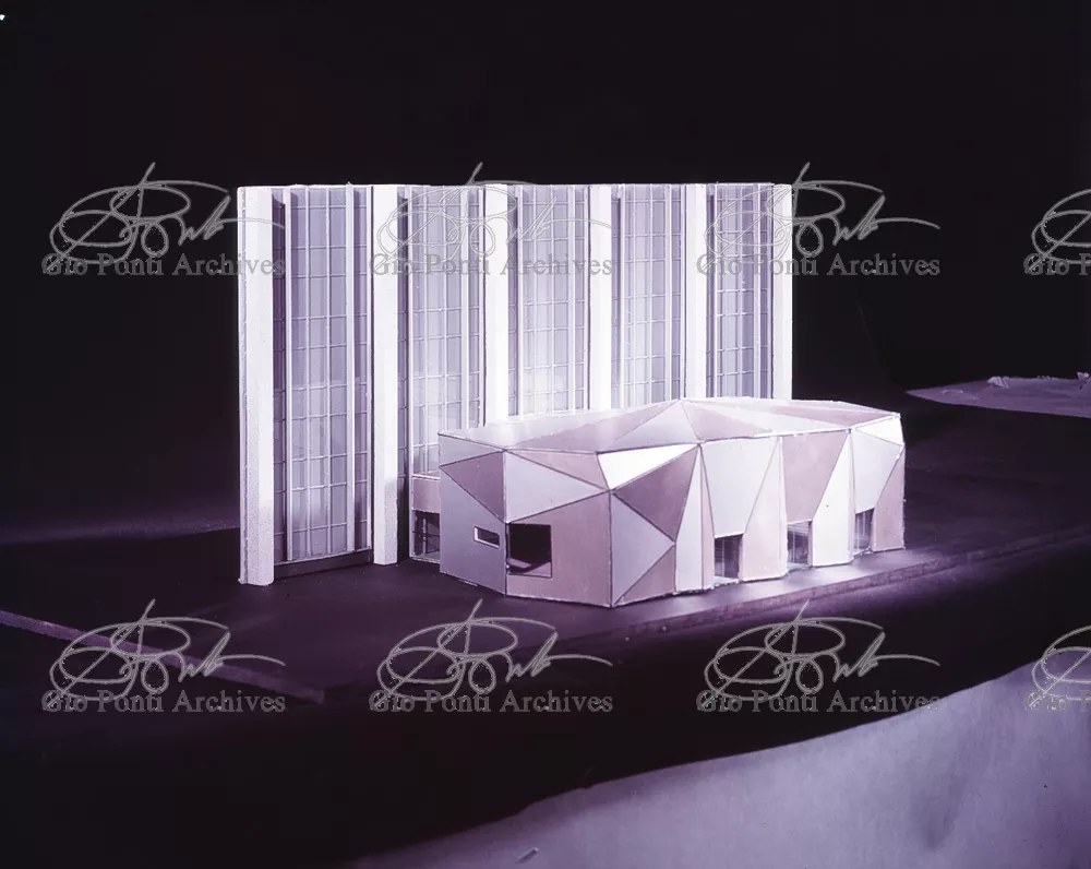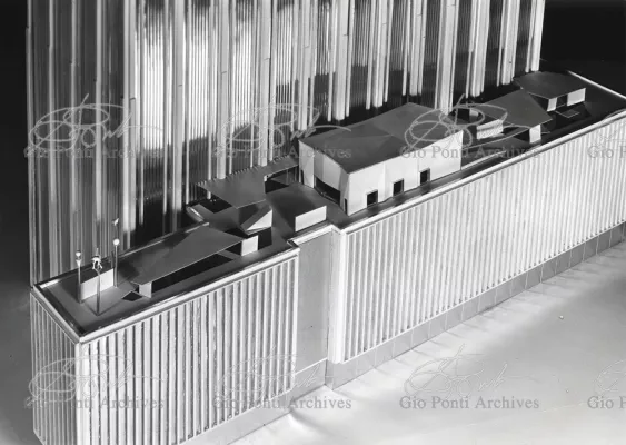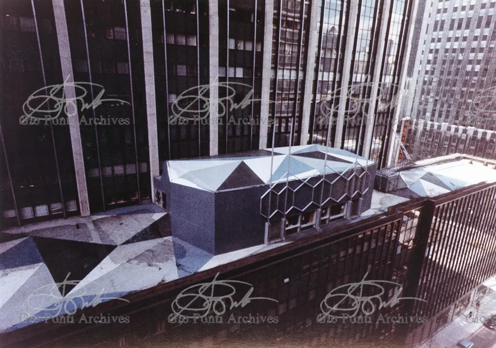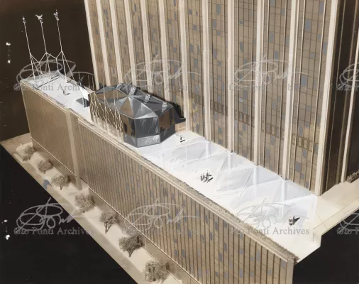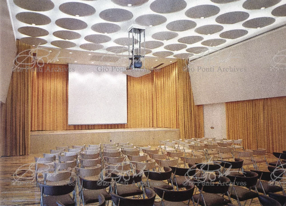 The auditorium is a small independent building, situated on a terrace on the eighth floor of Harrison and Abramowitz's building. It is a diamond-shaped volume. It is not part of the skyscraper's architecture, yet it is incorporated in it through the Pontian pattern of its facing. Seen from above from the upper floors or the sky, the volume, blending in with the pattern of the terrace floor large colored triangles, blue-white, blue-gray, black tended to disappear. Today, as a result of the alterations carried out to the exterior, this effect too has disappeared. Thaks for support: I Volantini