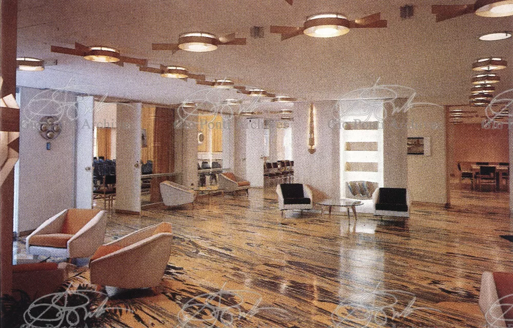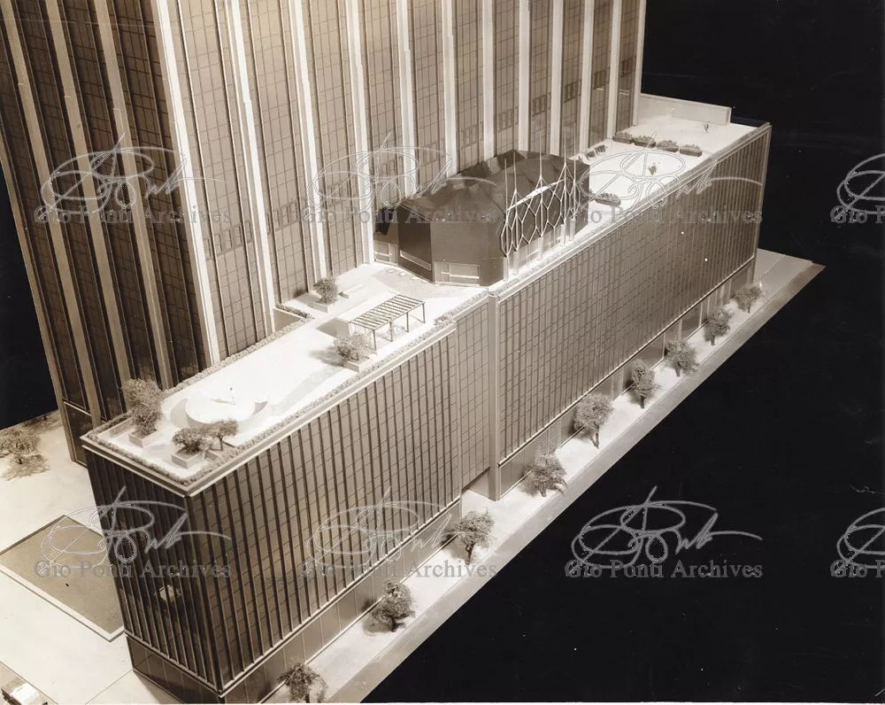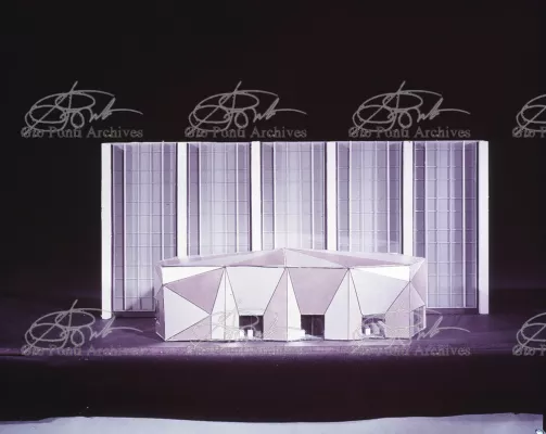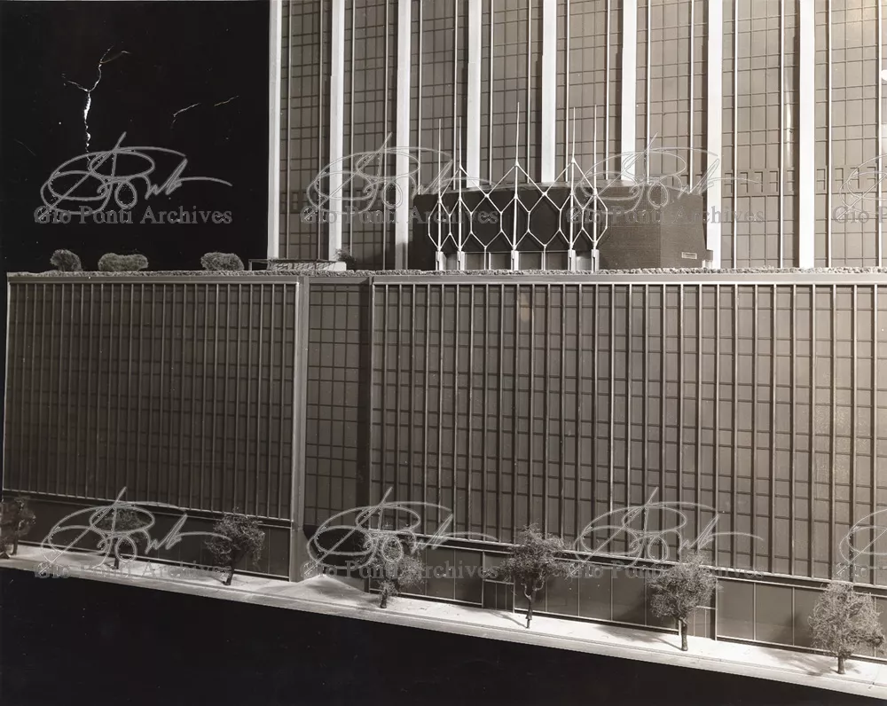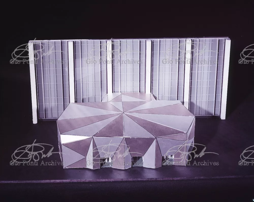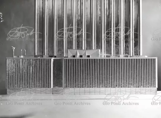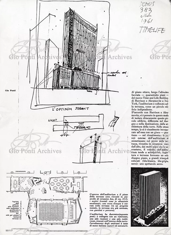 The auditorium is a small independent building, situated on a terrace on the eighth floor of Harrison and Abramowitz's building. It is a diamond-shaped volume. It is not part of the skyscraper's architecture, yet it is incorporated in it through the Pontian pattern of its facing. Seen from above from the upper floors or the sky, the volume, blending in with the pattern of the terrace floor large colored triangles, blue-white, blue-gray, black tended to disappear. Today, as a result of the alterations carried out to the exterior, this effect too has disappeared. Thaks for support: I Volantini