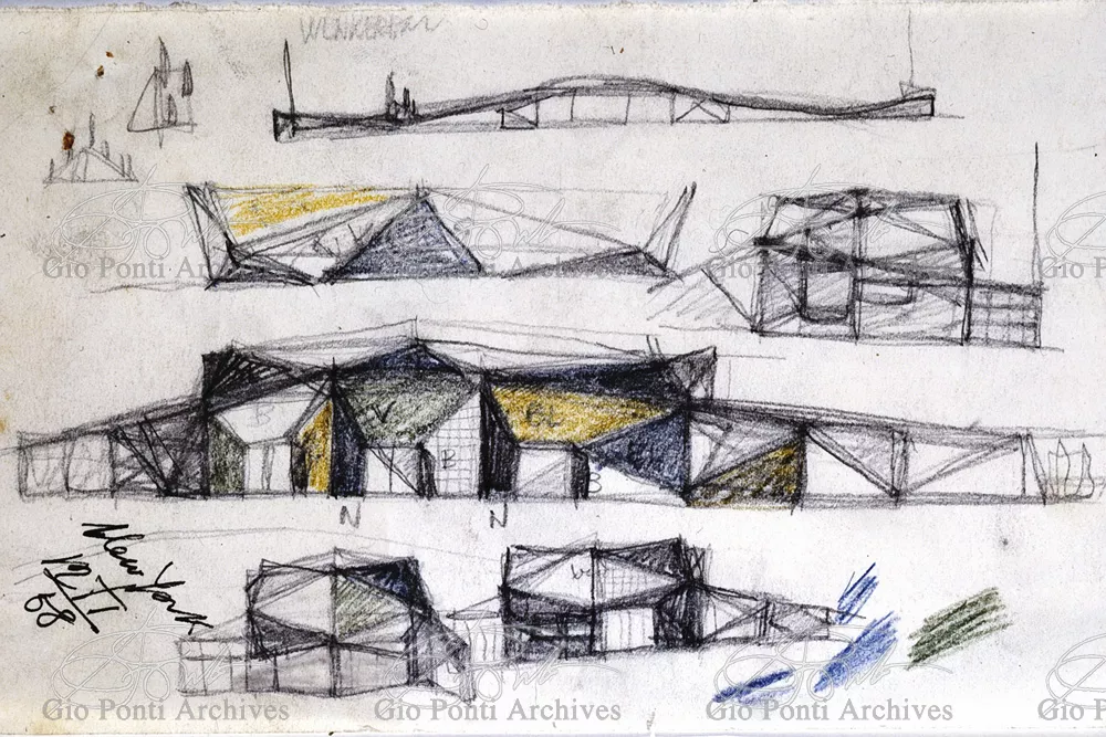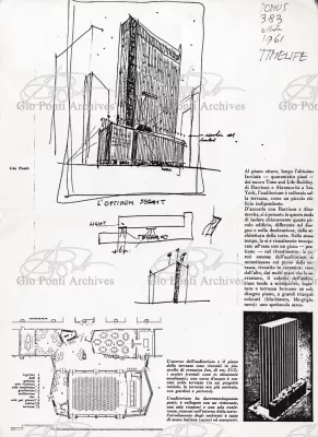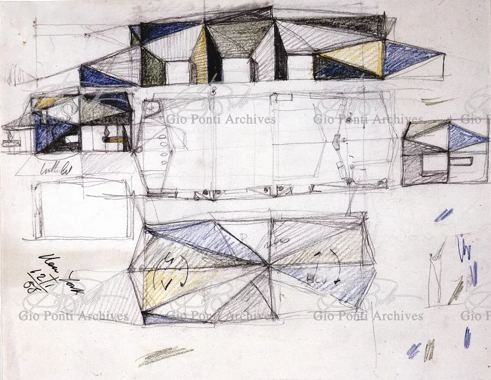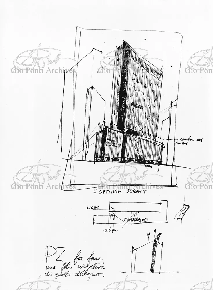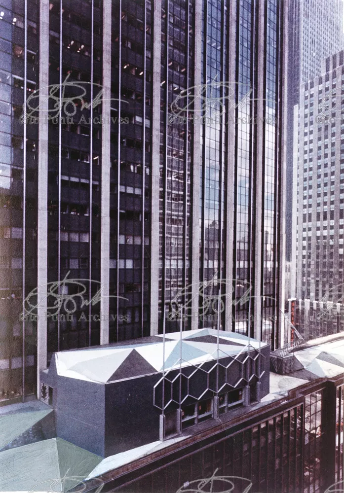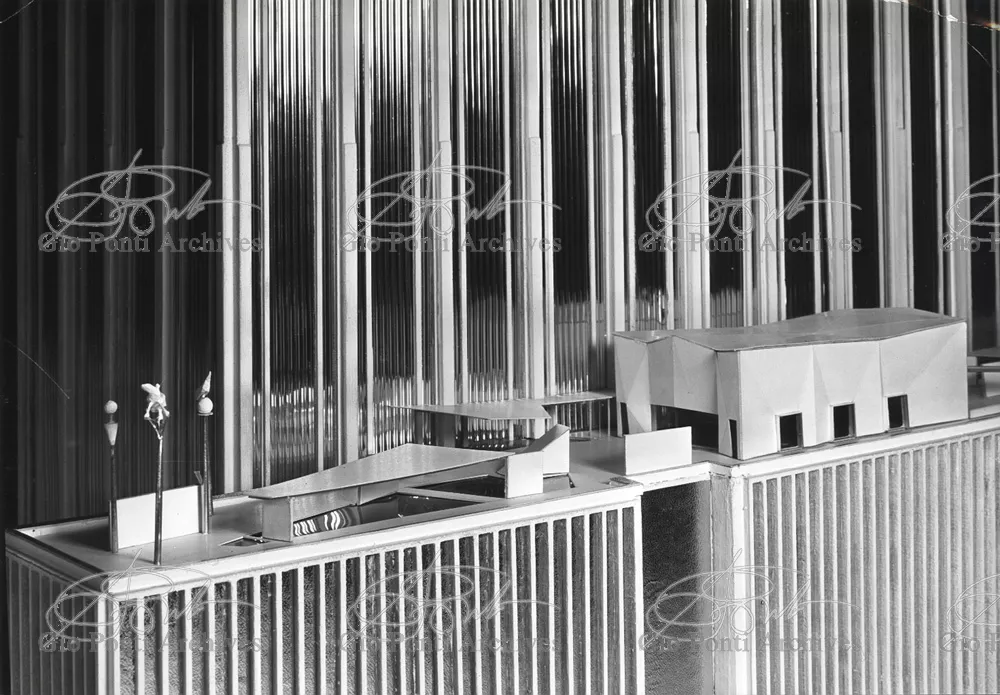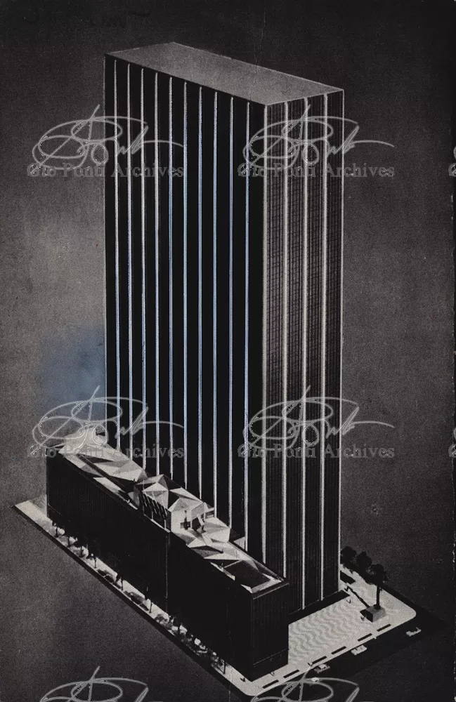 The auditorium is a small independent building, situated on a terrace on the eighth floor of Harrison and Abramowitz's building. It is a diamond-shaped volume. It is not part of the skyscraper's architecture, yet it is incorporated in it through the Pontian pattern of its facing. Seen from above from the upper floors or the sky, the volume, blending in with the pattern of the terrace floor large colored triangles, blue-white, blue-gray, black tended to disappear. Today, as a result of the alterations carried out to the exterior, this effect too has disappeared. Thaks for support: I Volantini