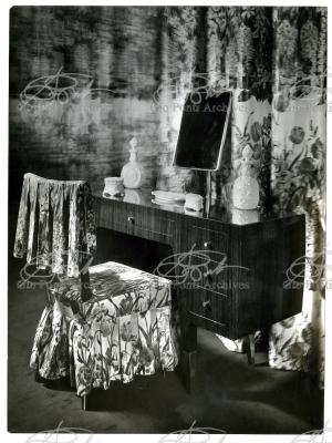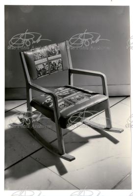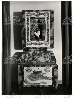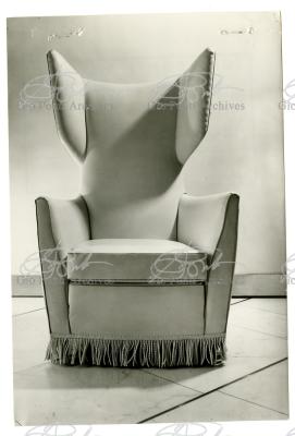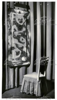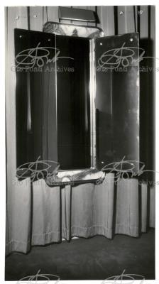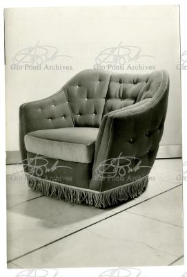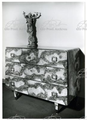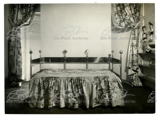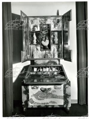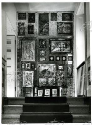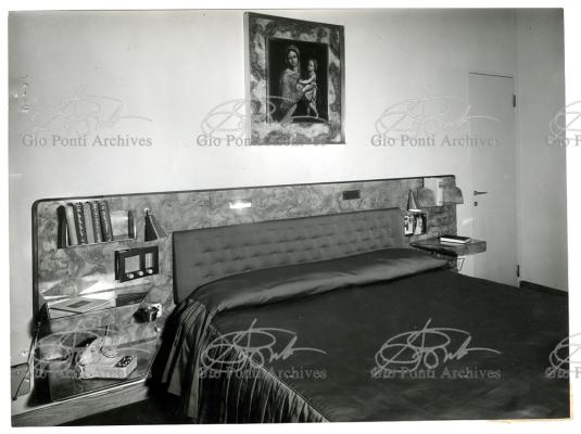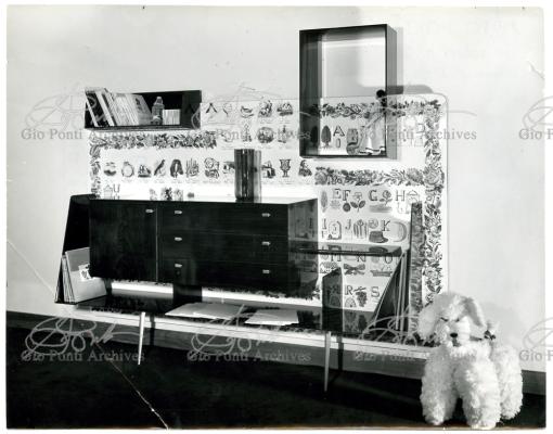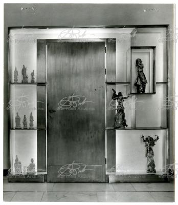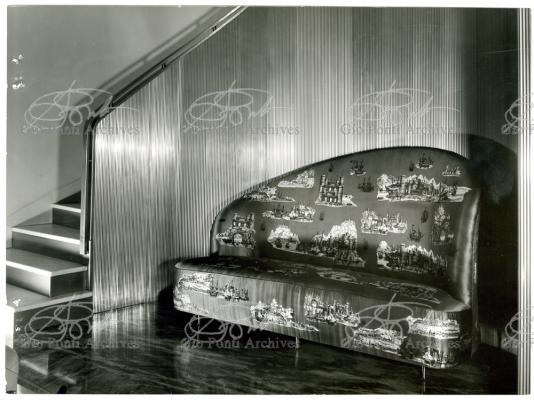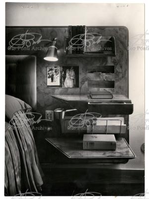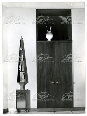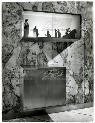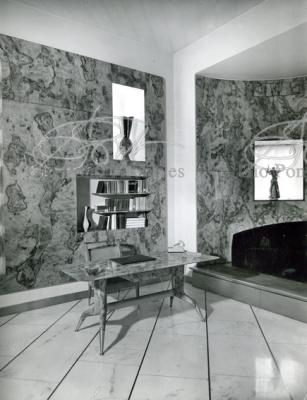 Here the brass volume projecting from the wall contains a surprise fireplace. The walnut wall, running around the room and including the show cases and the shelves, is an organized wall, as Ponti called it.