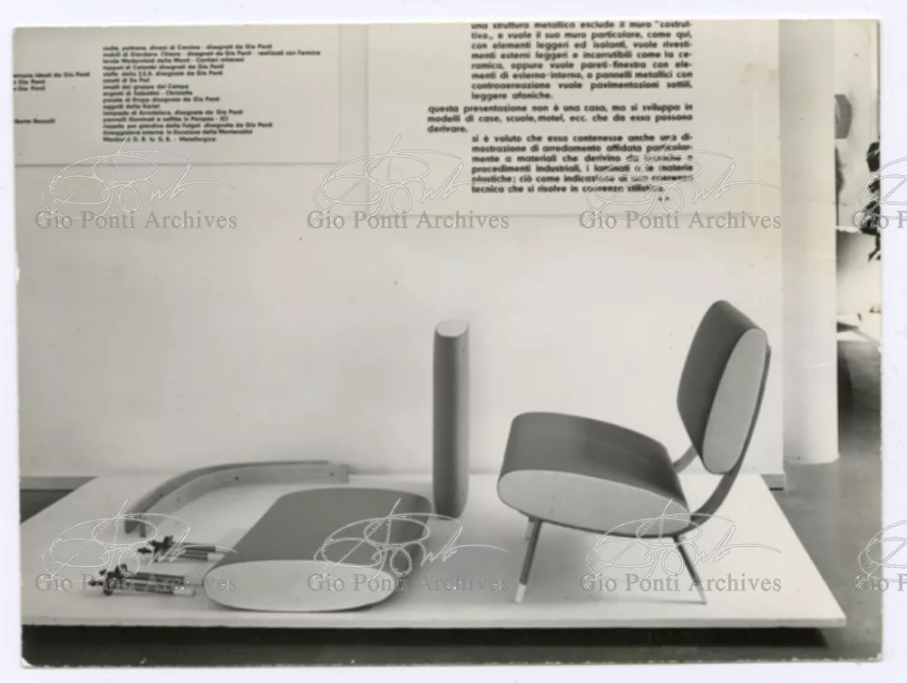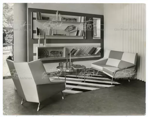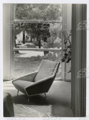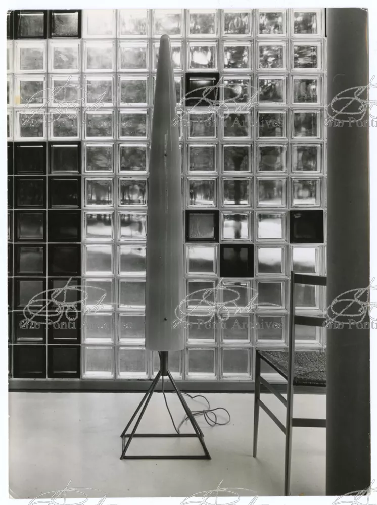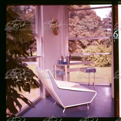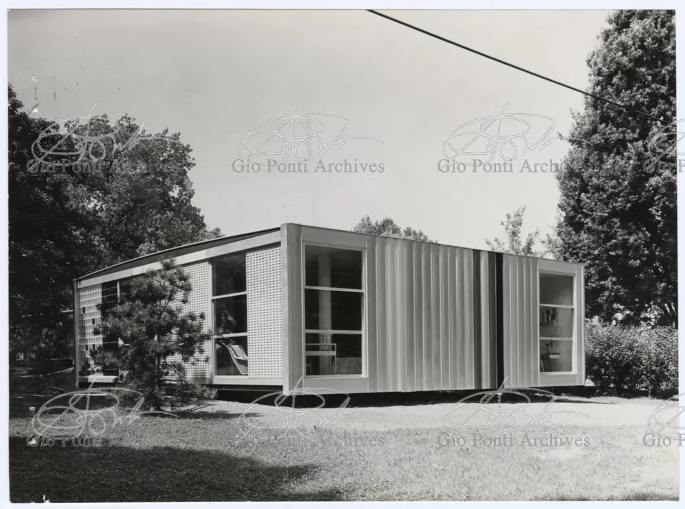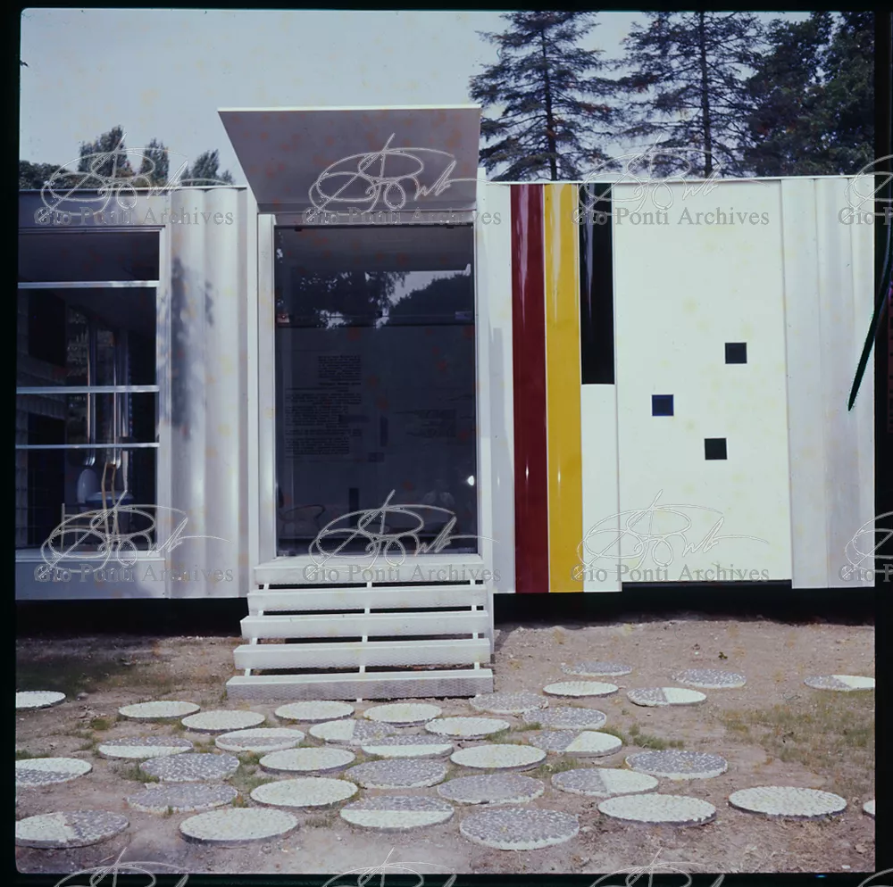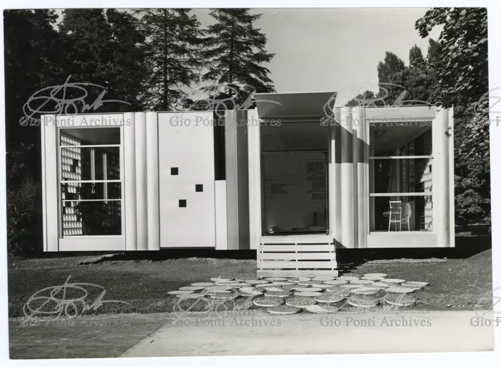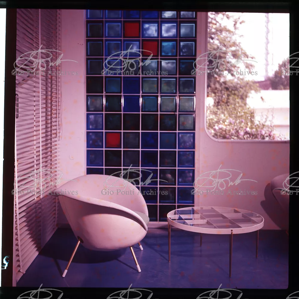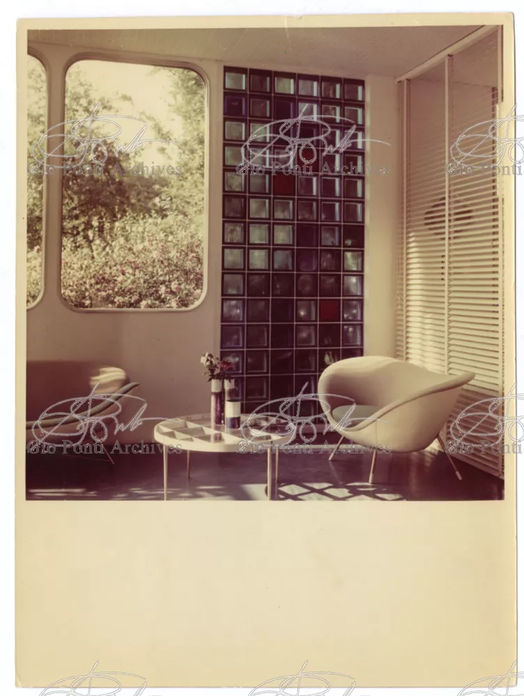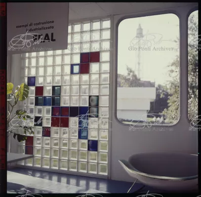 This pavilion in the park of the Triennale was not a small house; it was an example of integral use of new industrial products for the house, from construction to furnishings: from the Feal system of light prefabricated structure, to the roofing, the window elements, the external facings -all made out of aluminium- again by Feal, the walls made out of colored concrete-framed glass blocks by Fidenza, ceramic diamond-shaped tiles by Joo, rubber floorings by Pirelli, and the two-tone folding partitions (as Ponti's new furniture for Cassina and his new lamps for Arredoluce, still prototypes, were in two colours).