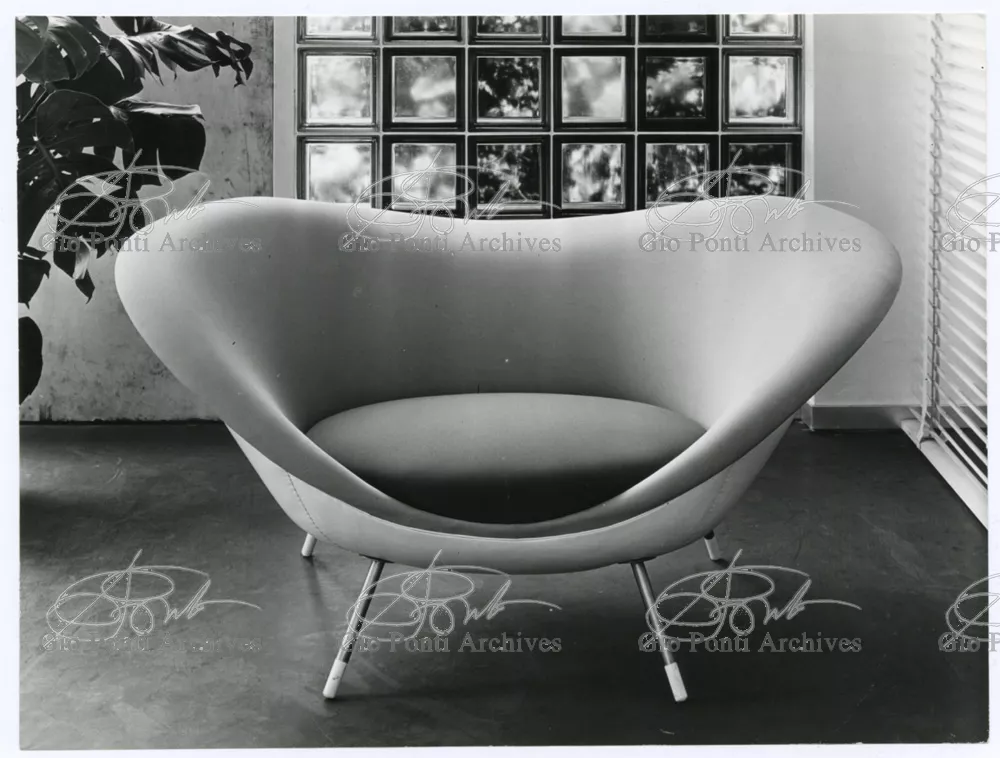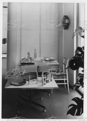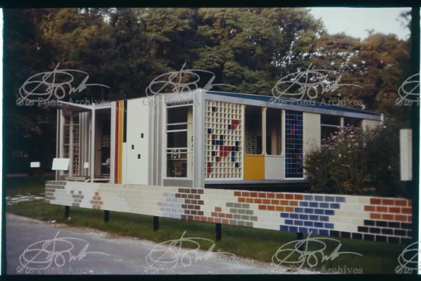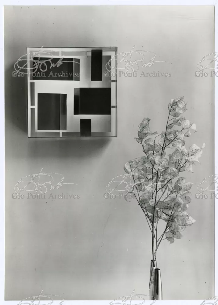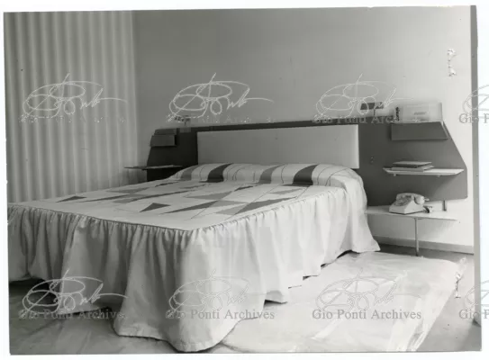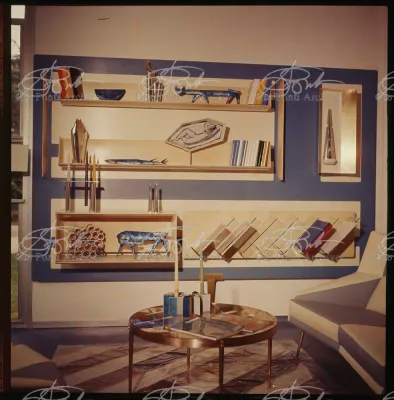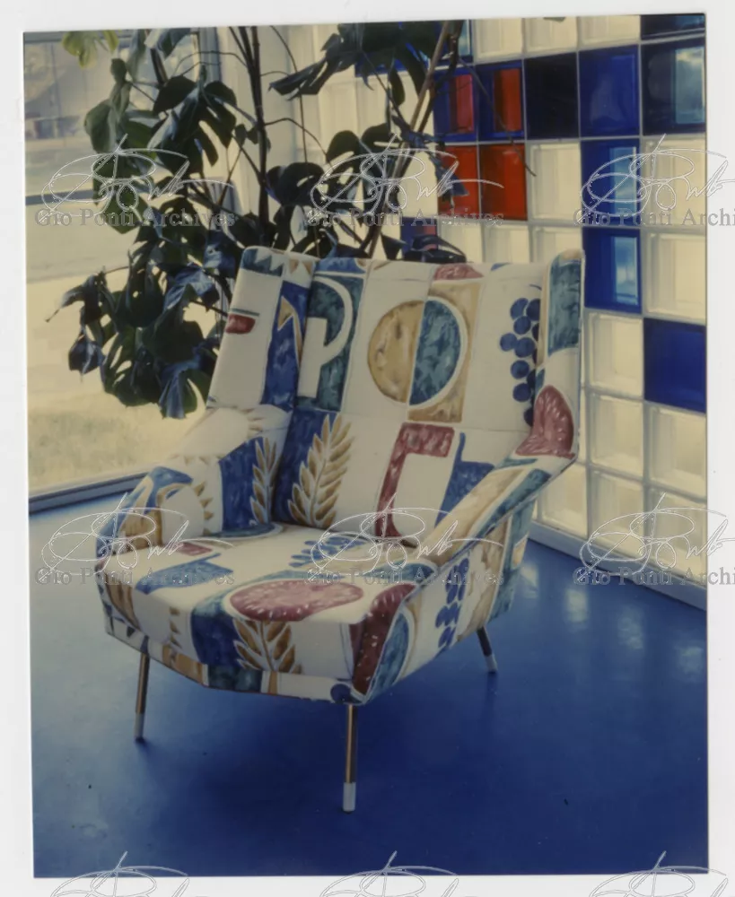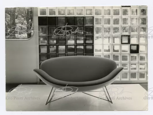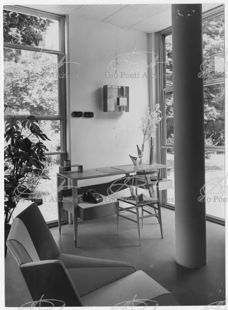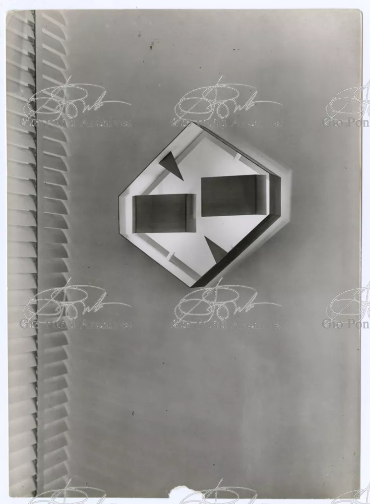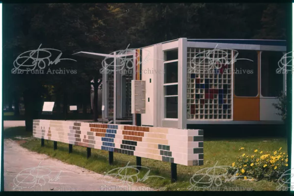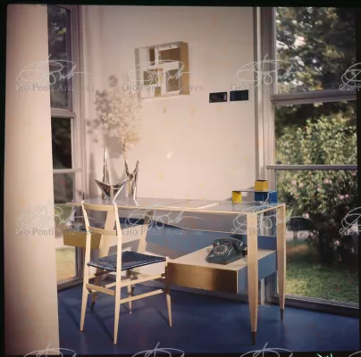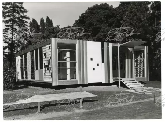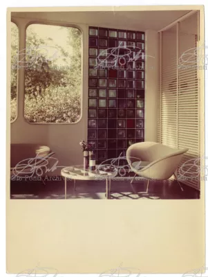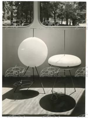 This pavilion in the park of the Triennale was not a small house; it was an example of integral use of new industrial products for the house, from construction to furnishings: from the Feal system of light prefabricated structure, to the roofing, the window elements, the external facings -all made out of aluminium- again by Feal, the walls made out of colored concrete-framed glass blocks by Fidenza, ceramic diamond-shaped tiles by Joo, rubber floorings by Pirelli, and the two-tone folding partitions (as Ponti's new furniture for Cassina and his new lamps for Arredoluce, still prototypes, were in two colours).