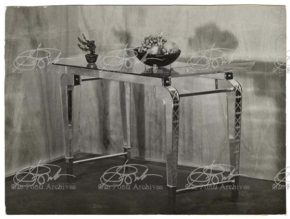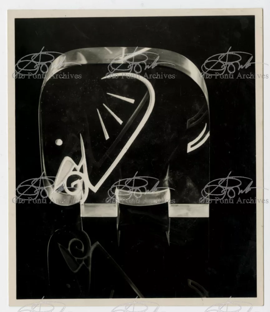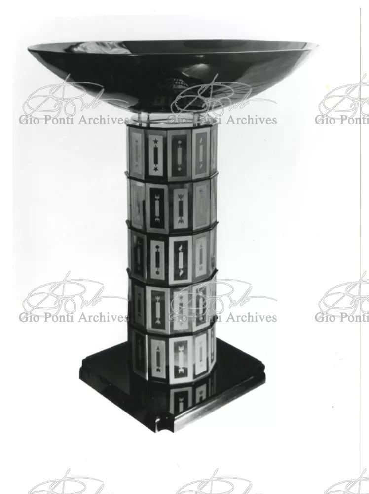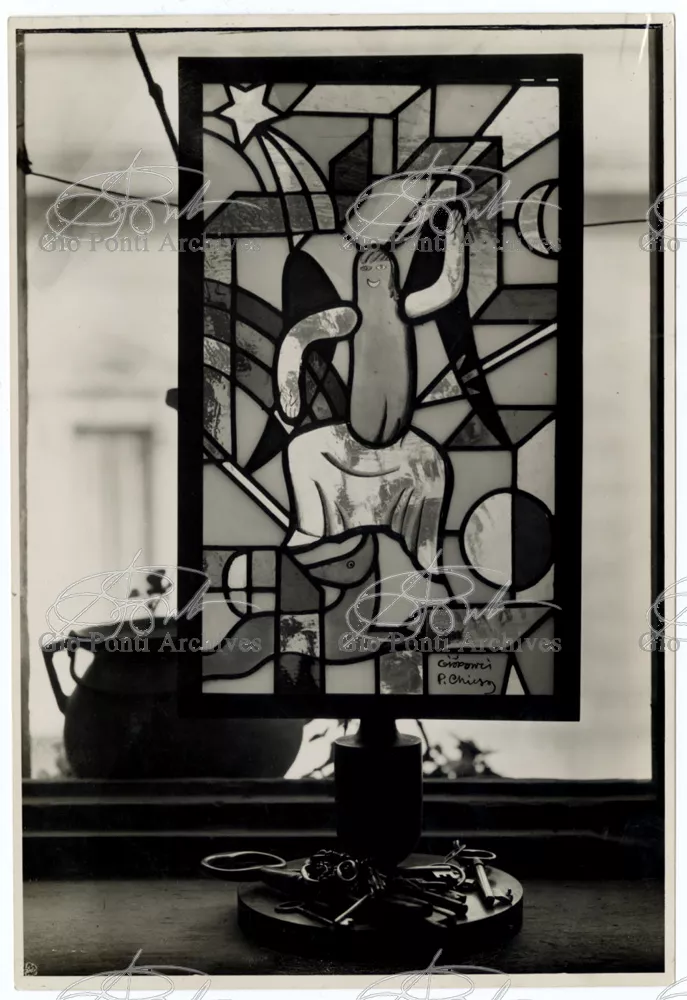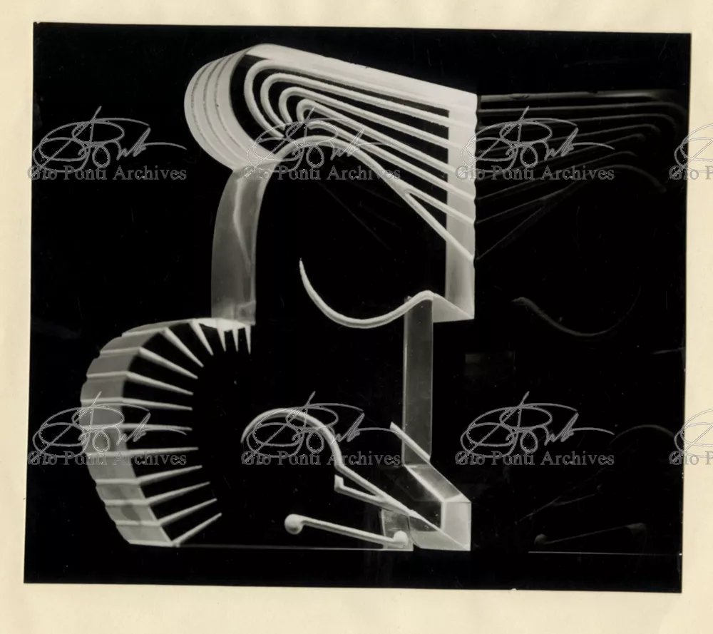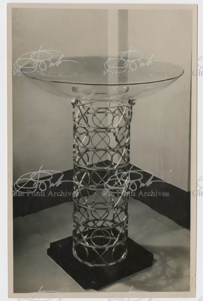 For Gio Ponti crystal was the material for objects of great luxury. Luxury puts the designer's skills to no less of a test than the economic. In 1930 Gio Ponti designed for Fontana the large table with black crystal top and cut crystal legs that was presented at the 4th Triennial Exhibition in Monza. In 1931 Ponti began to design for Fontana a series of pieces of furniture topped with mirrors, exceptional furniture together with the first totally transparent ones made entirely of glass. In the spring of 1933 Ponti took over, along with Pietro Chiesa, the artistic direction of Fontana Arte, a branch of the Fontana firm. And the Fontana Arte output began to expand as had happened with Richard-Ginori, producing a multitude of large and small objects, from paperweights to lamps. At the same time he gave Fontana Arte the opportunity again as with Richard-Ginori to produce major works, such as the stained-glass walls he designed for the Faculty of Mathematics at Rome University, 1934, and for the Exhibition of the Catholic Press in the Vatican, 1936.