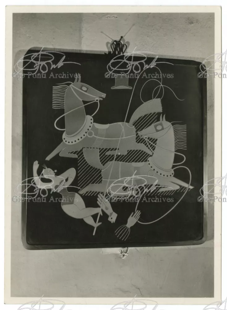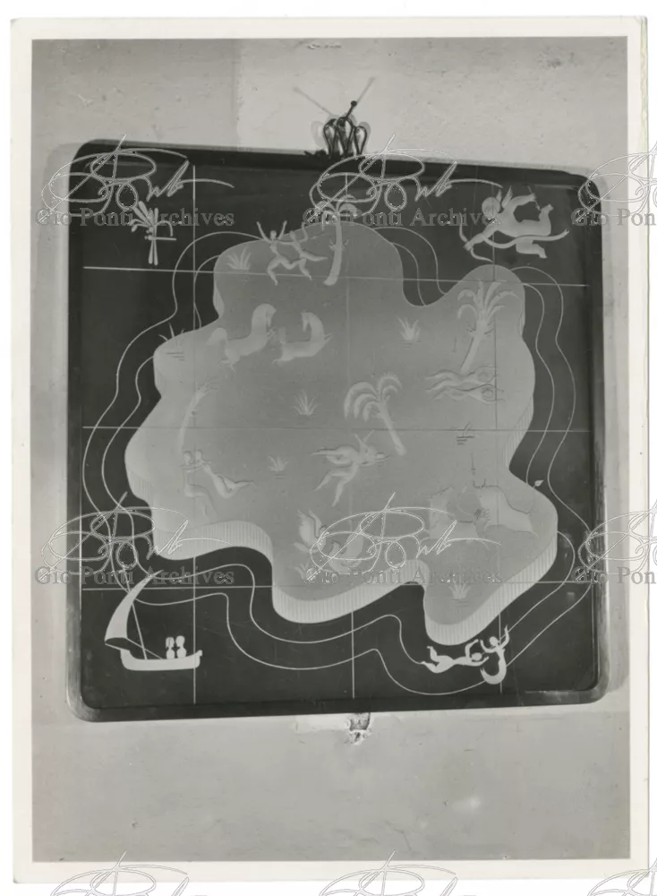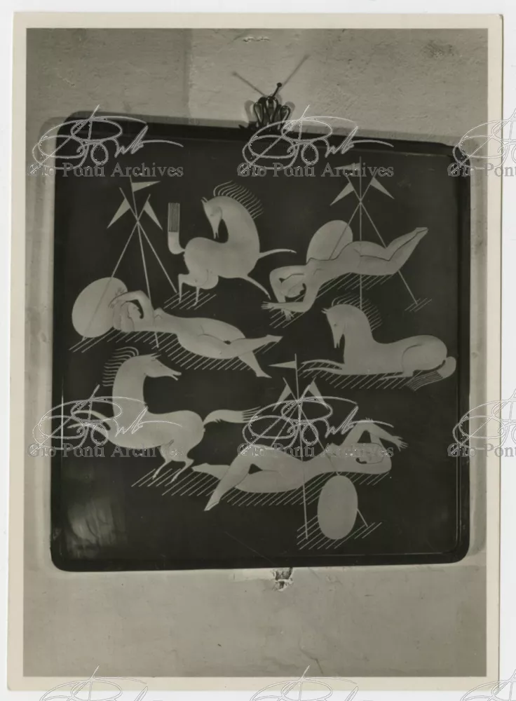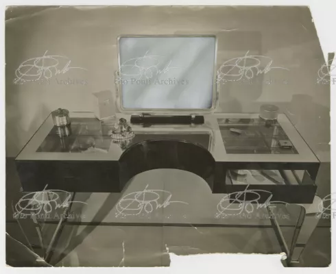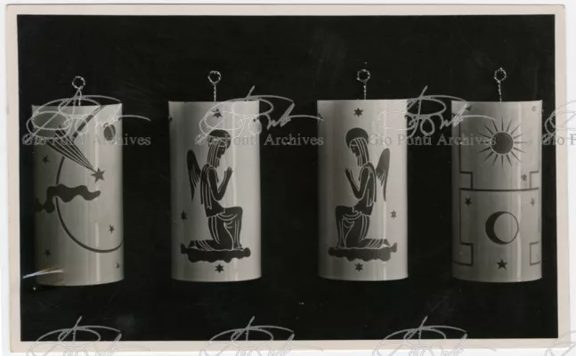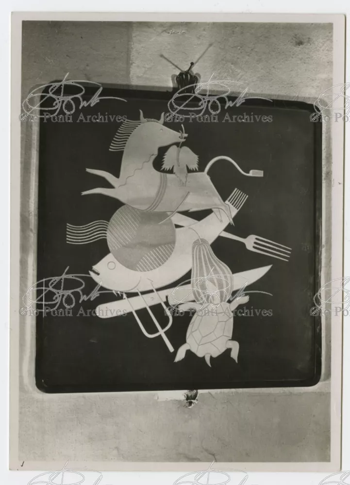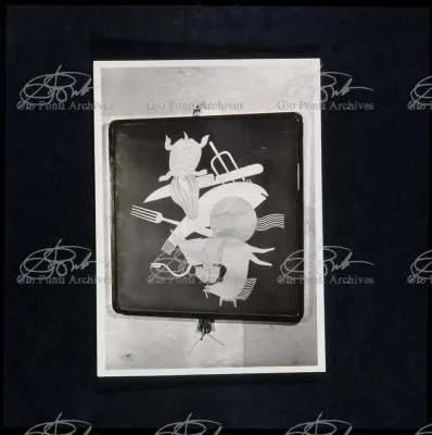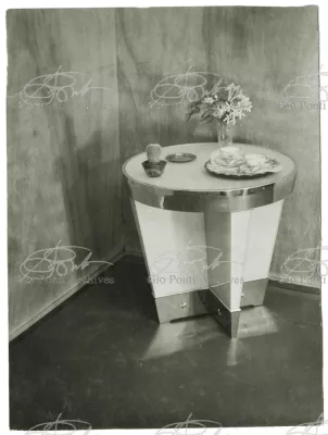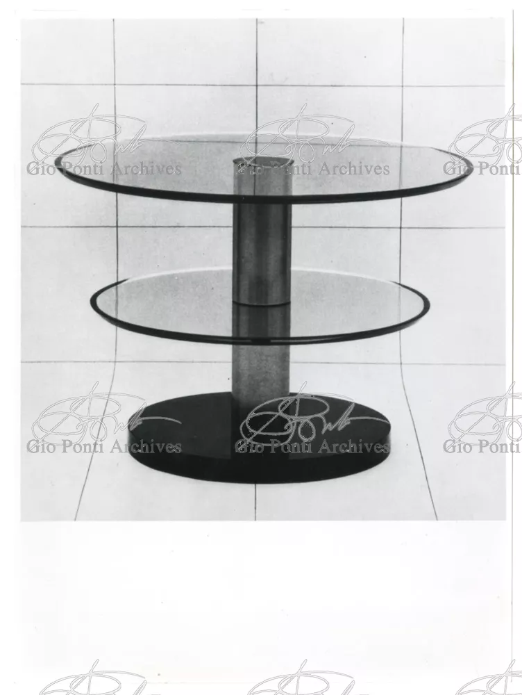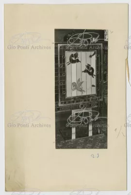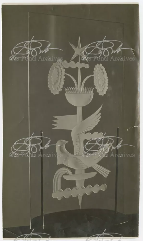 For Gio Ponti crystal was the material for objects of great luxury. Luxury puts the designer's skills to no less of a test than the economic. In 1930 Gio Ponti designed for Fontana the large table with black crystal top and cut crystal legs that was presented at the 4th Triennial Exhibition in Monza. In 1931 Ponti began to design for Fontana a series of pieces of furniture topped with mirrors, exceptional furniture together with the first totally transparent ones made entirely of glass. In the spring of 1933 Ponti took over, along with Pietro Chiesa, the artistic direction of Fontana Arte, a branch of the Fontana firm. And the Fontana Arte output began to expand as had happened with Richard-Ginori, producing a multitude of large and small objects, from paperweights to lamps. At the same time he gave Fontana Arte the opportunity again as with Richard-Ginori to produce major works, such as the stained-glass walls he designed for the Faculty of Mathematics at Rome University, 1934, and for the Exhibition of the Catholic Press in the Vatican, 1936.